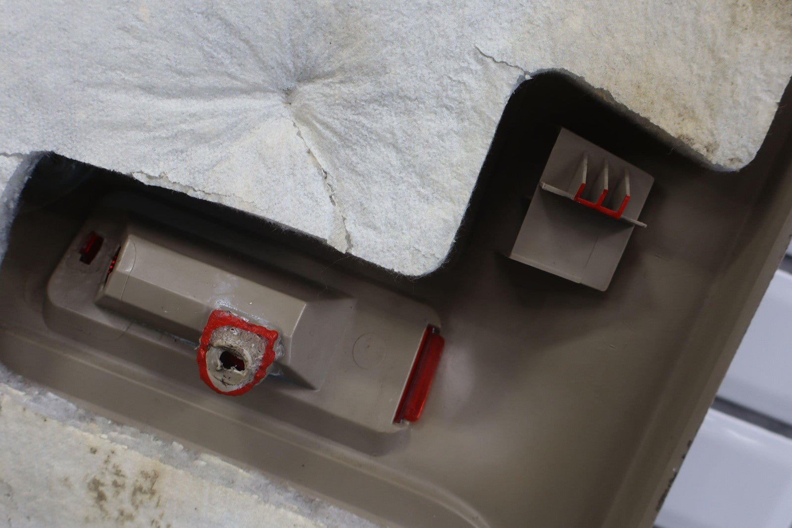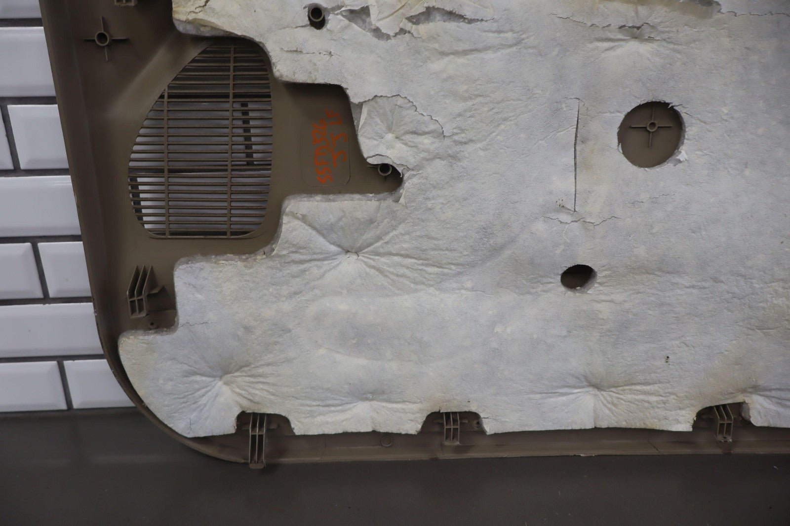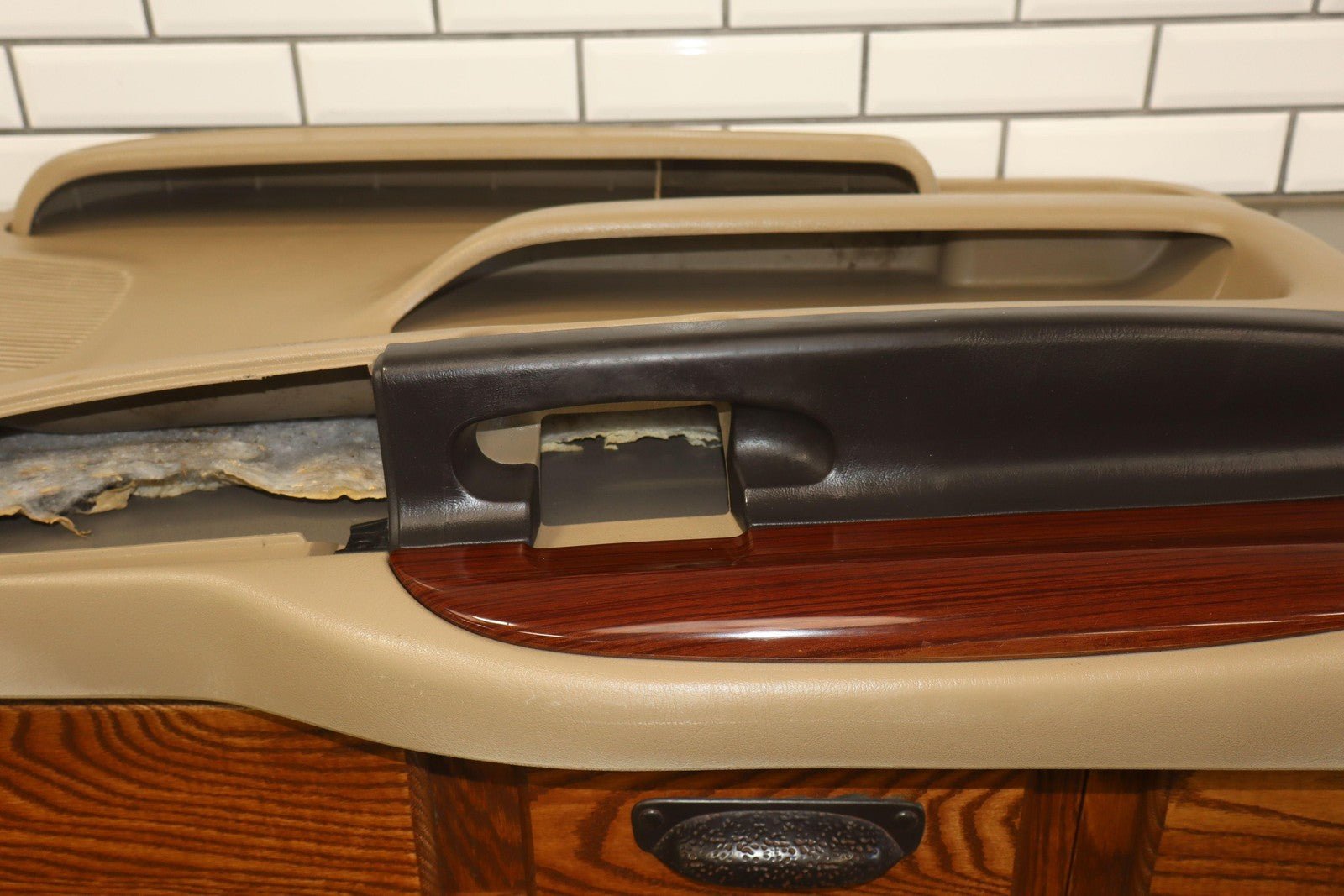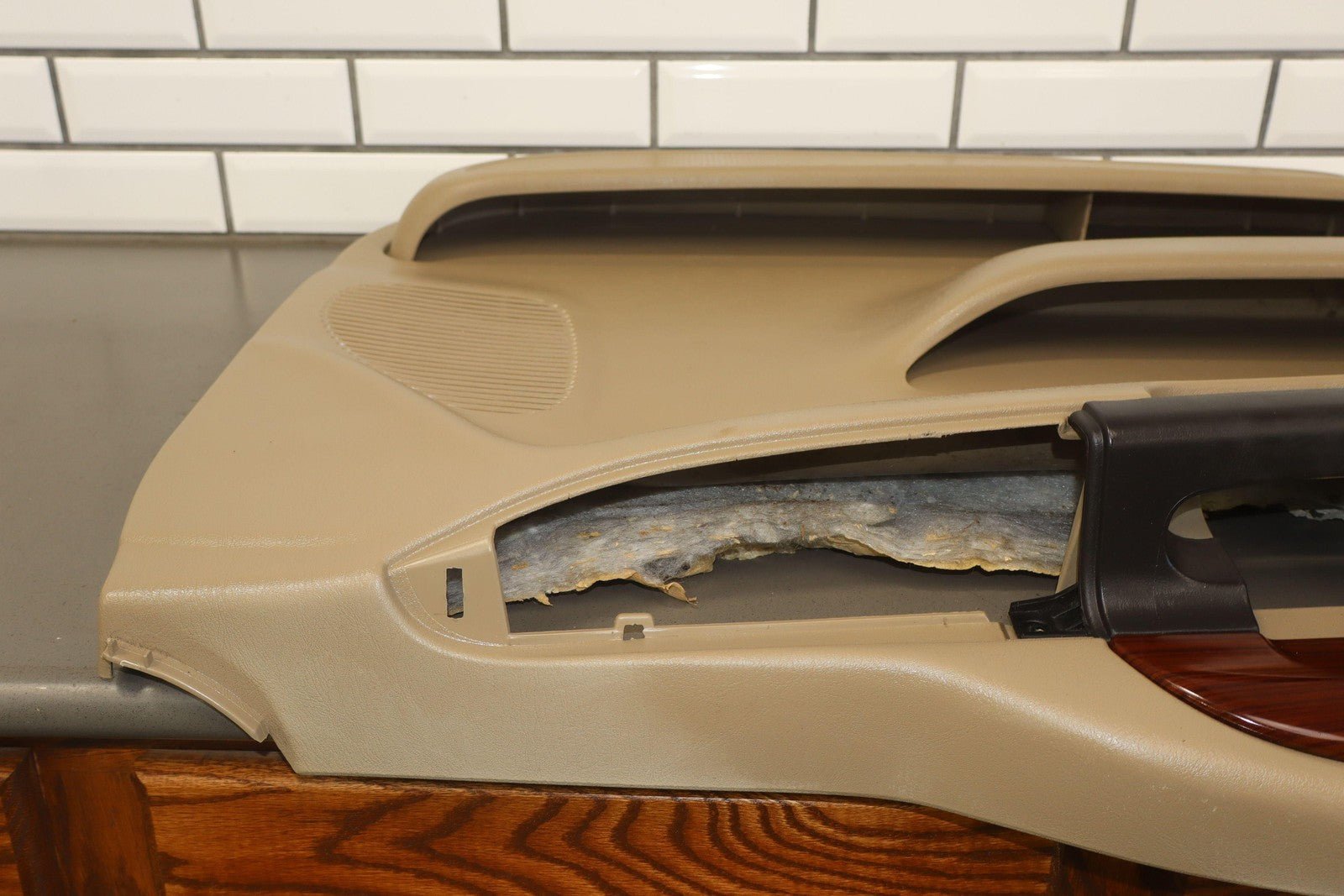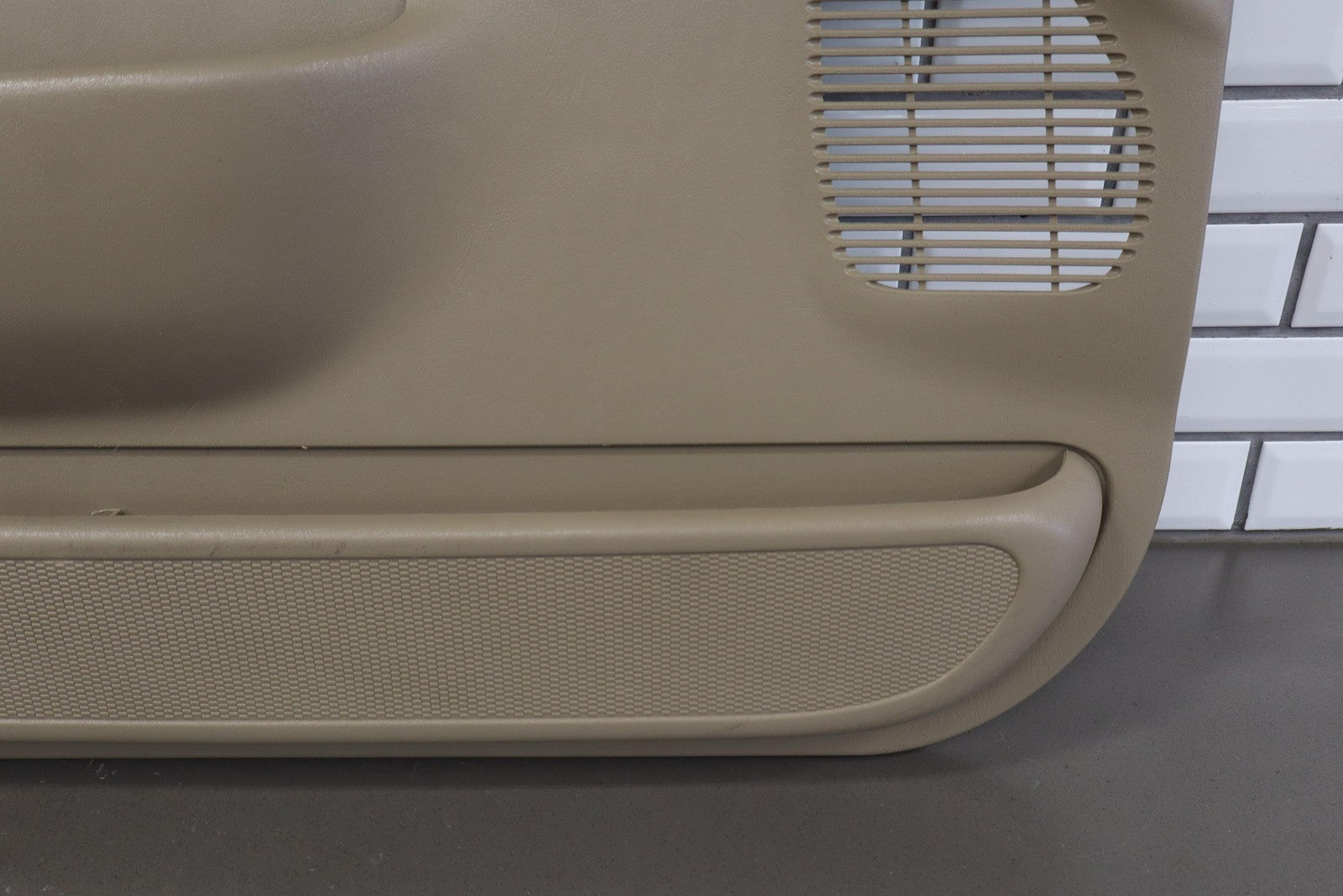 Important notes: Lh Front (power), Tan (8h) W/woodgrain, No Window Master Switch, Multiple Missing/cracked/repaired Tabs (red), Minor Wear