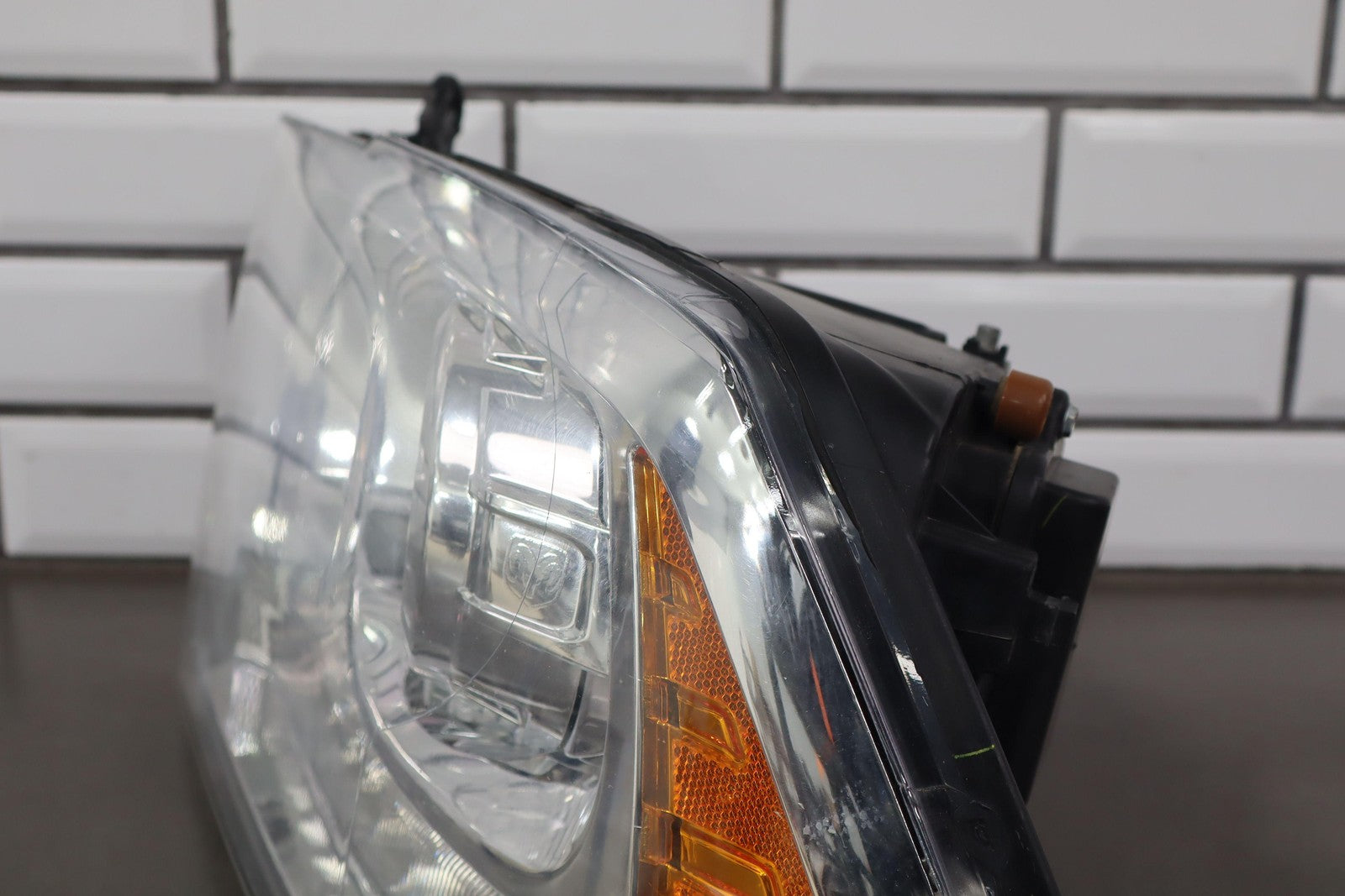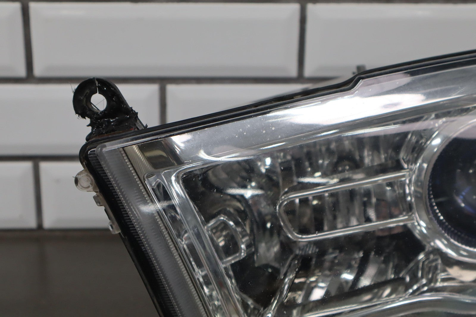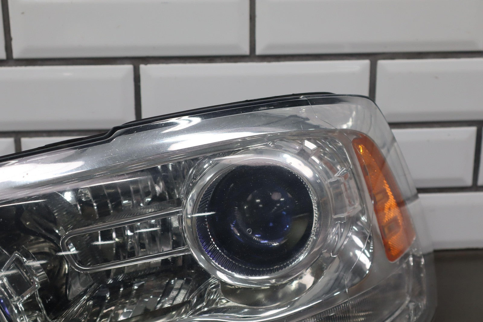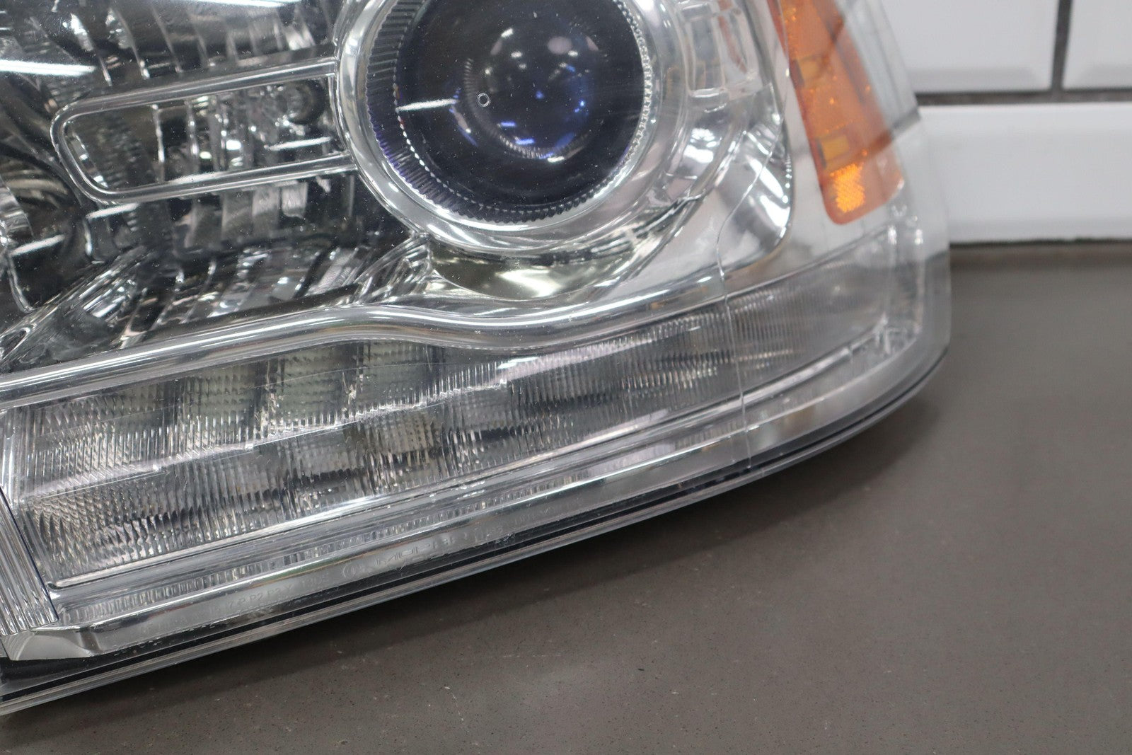 Important notes: Lh, Bi-functional Halogen Projector, Chrome Bezel, Light Scuffs To Lens, Functions Properly, 1 Repaired Tab (red)