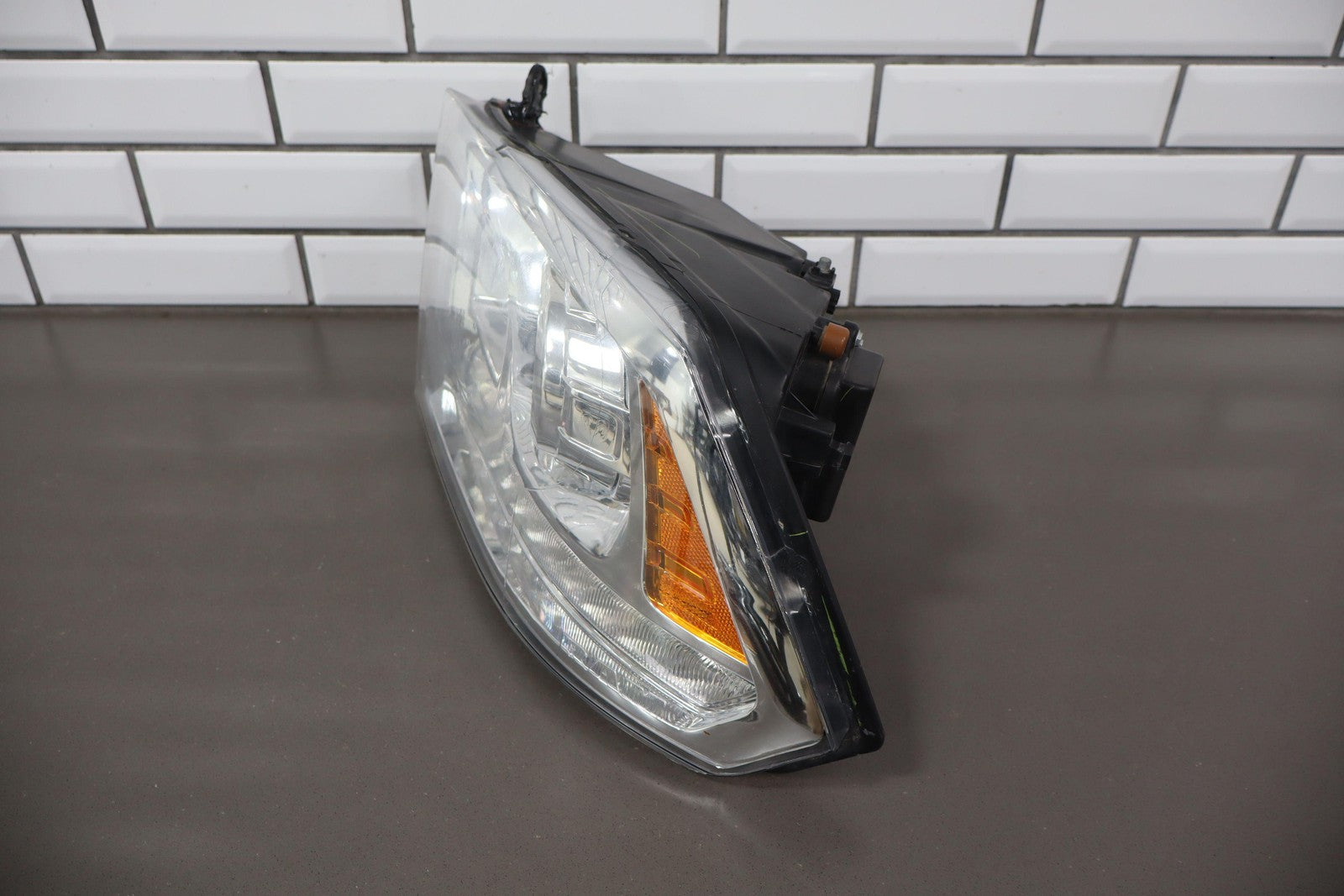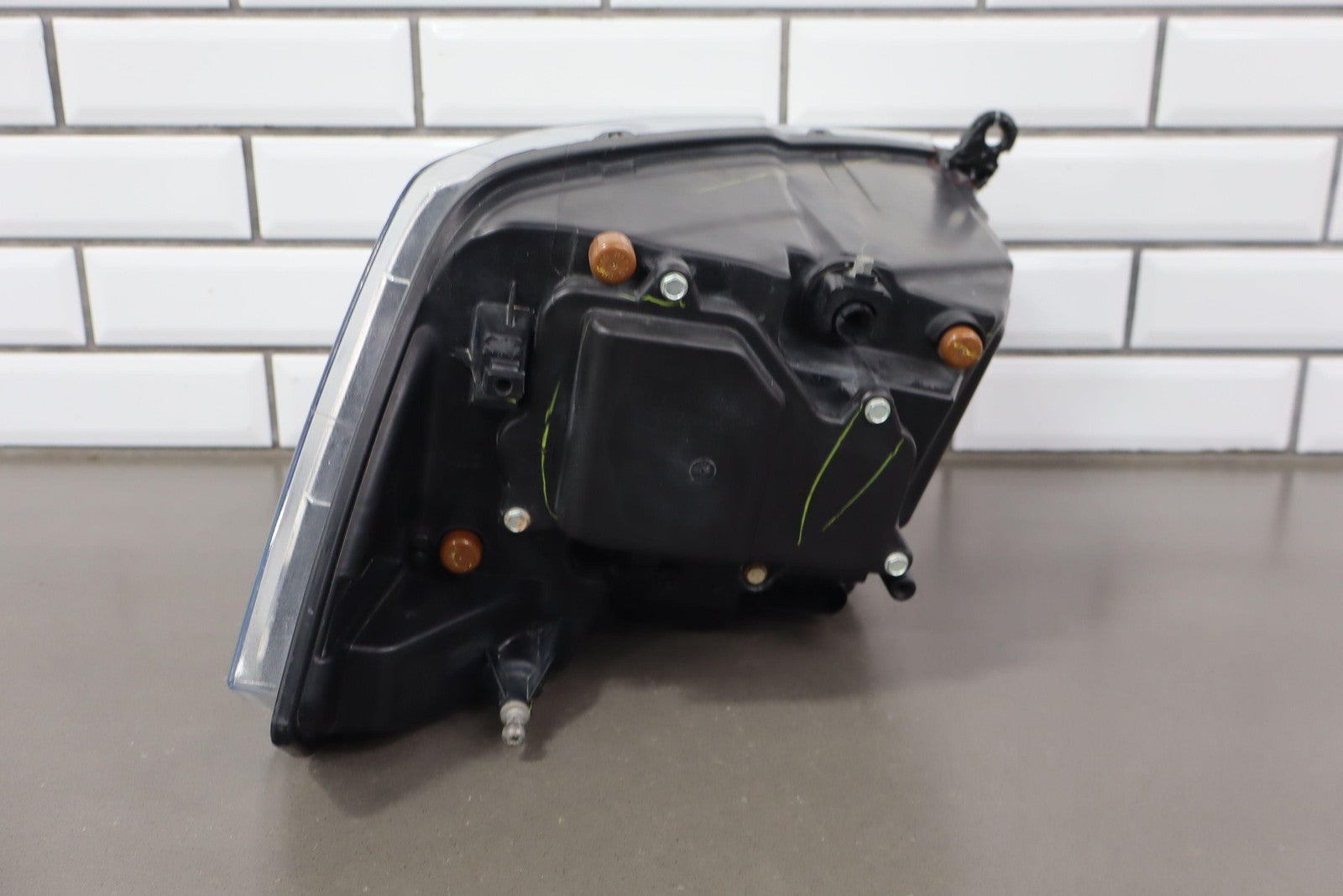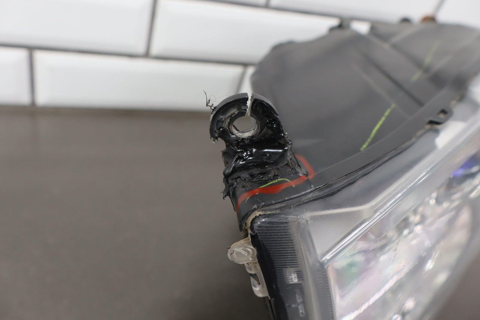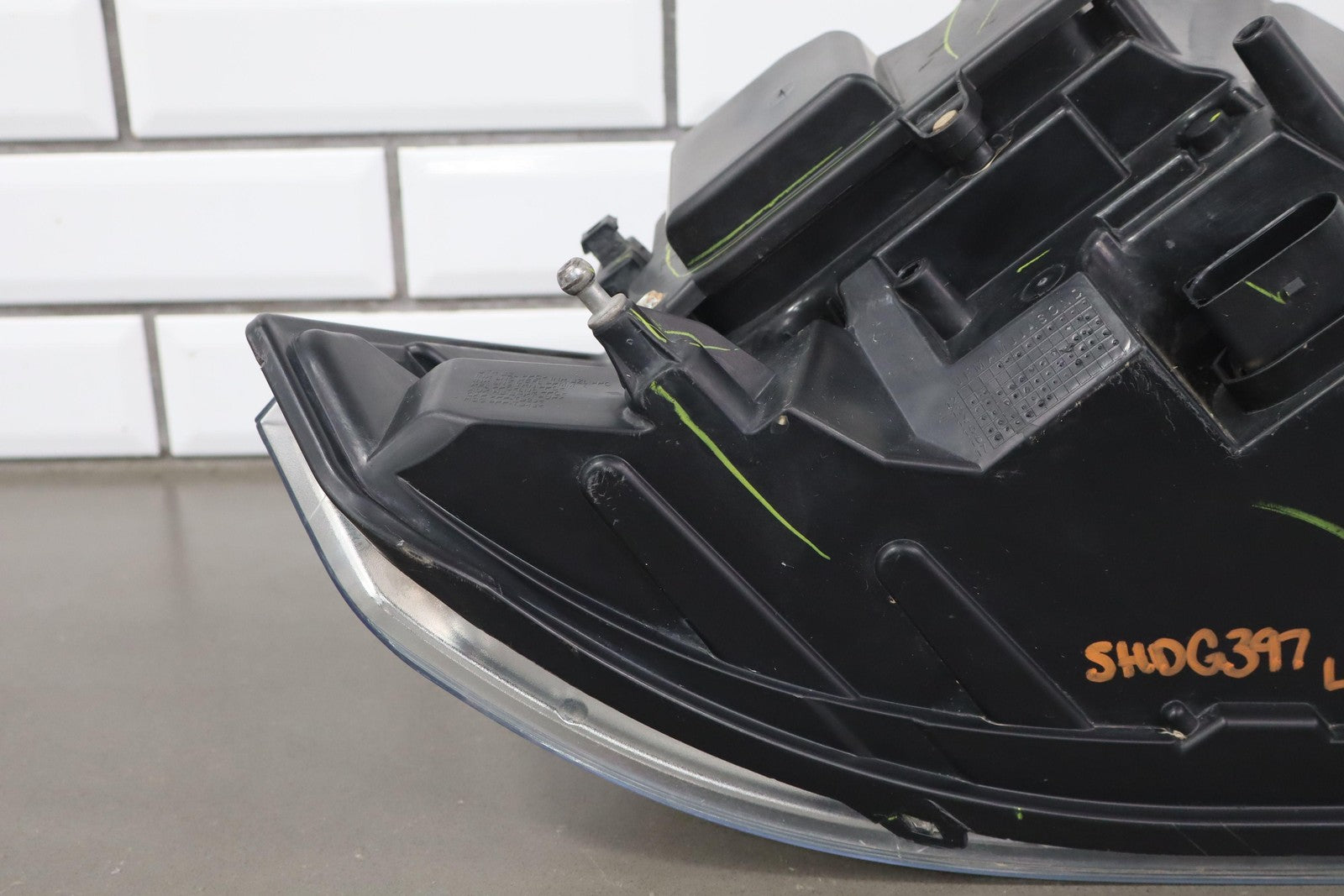 Important notes: Lh, Bi-functional Halogen Projector, Chrome Bezel, Light Scuffs To Lens, Functions Properly, 1 Repaired Tab (red)