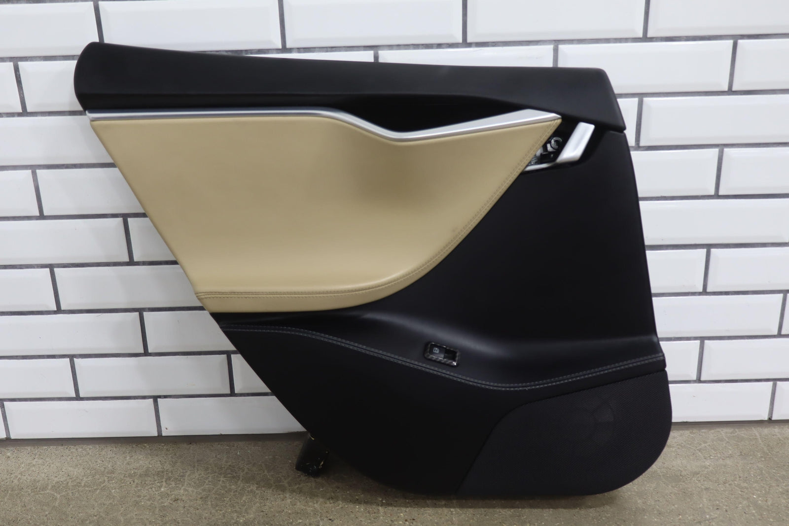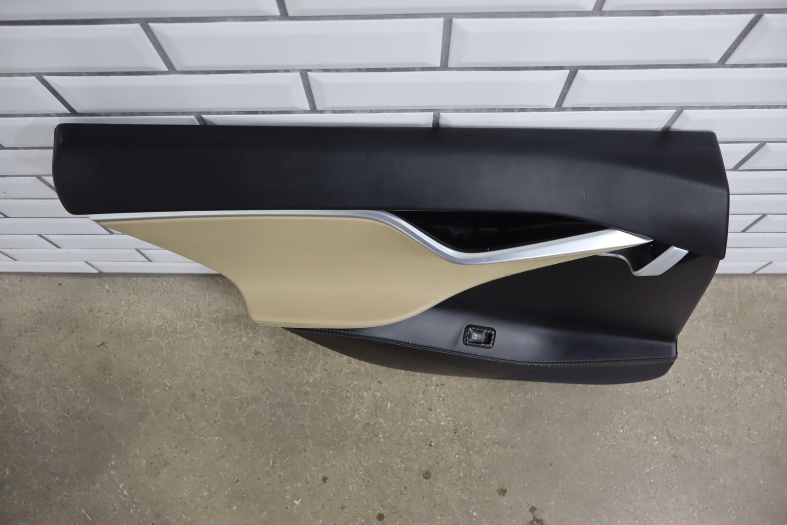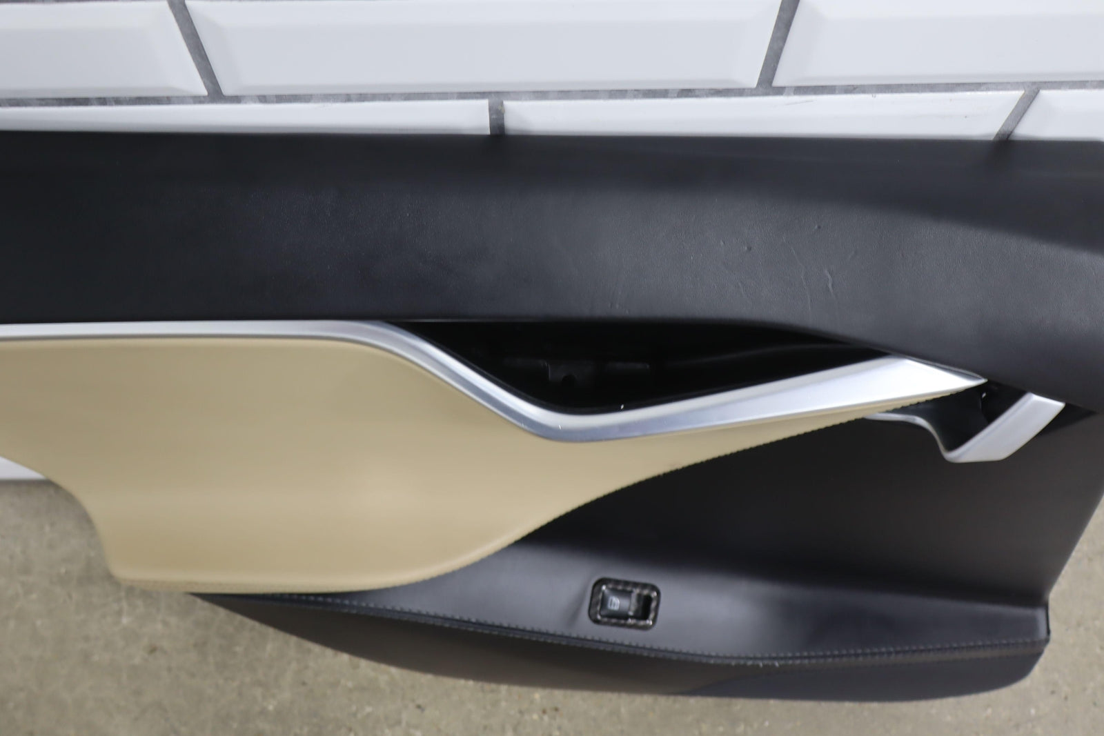 Lh Rear, Black/tan, Includes Window Switch, Aftermarket Carbon Switch Trim, Mild Wear, Light Staining, Mounted Solid
