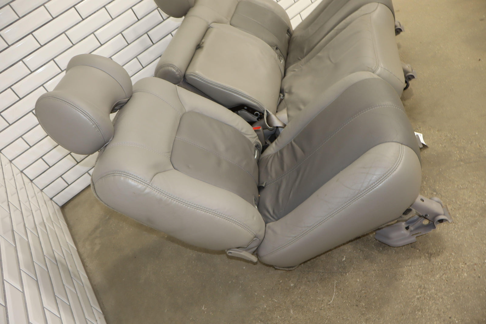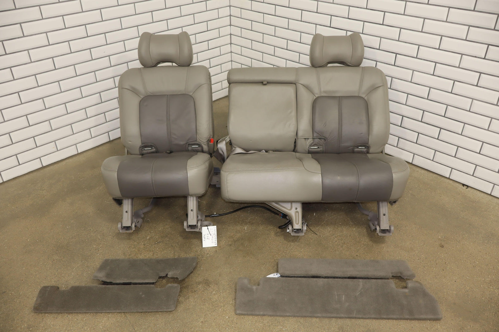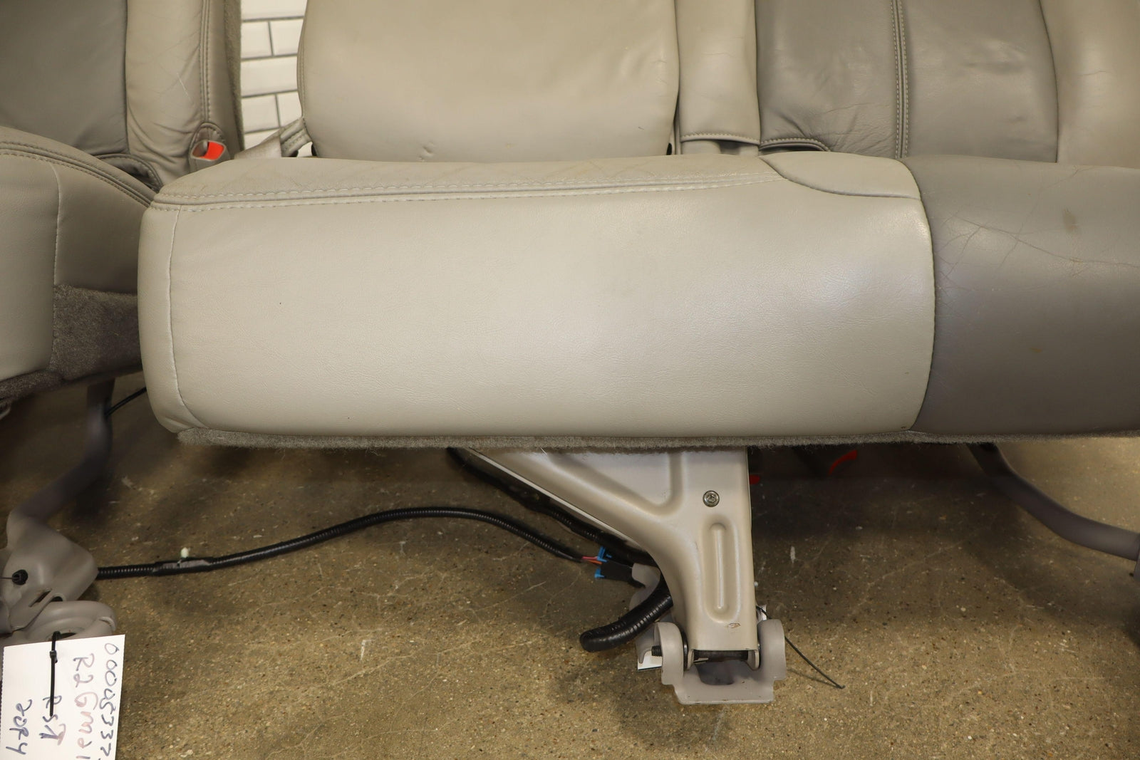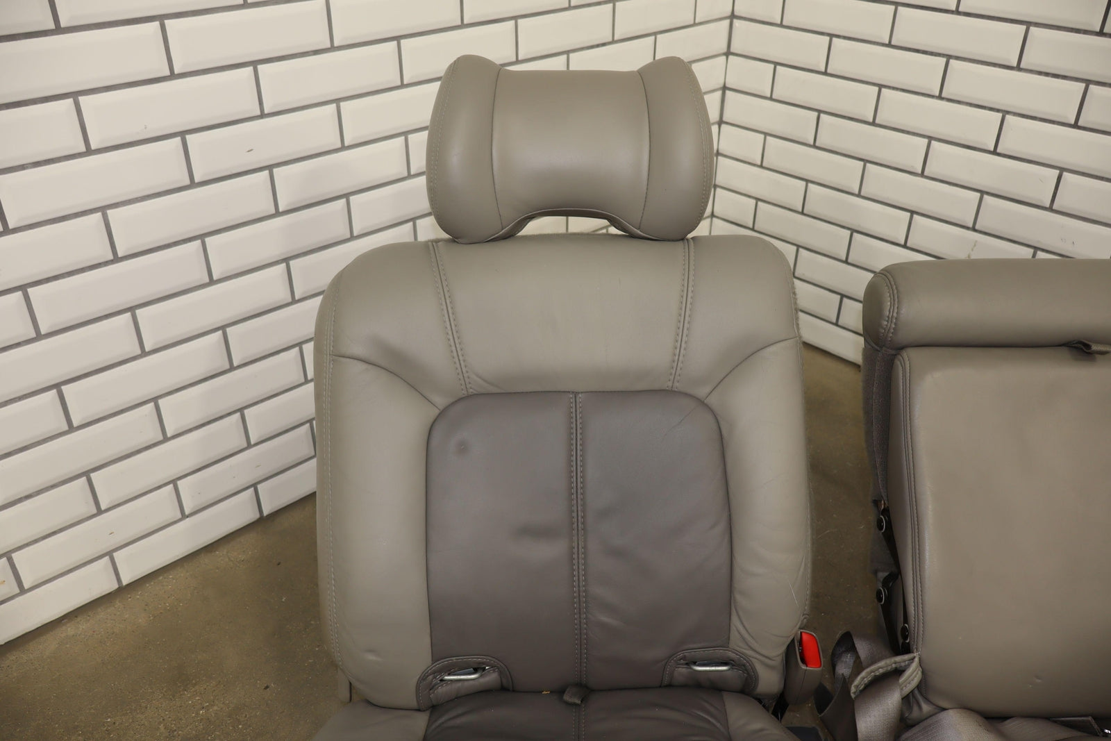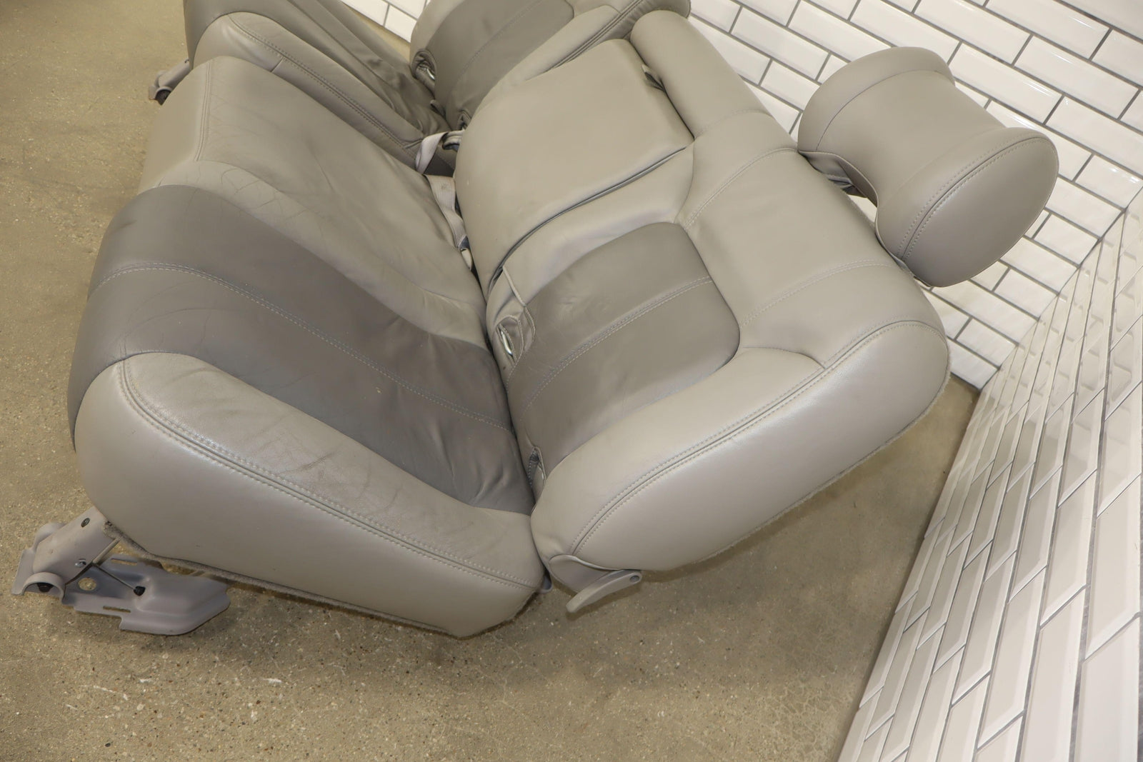 2nd Row Leather Bench Seat, Stone Gray (922), Mild Staining Throughout, Some Wear, Includes Transition Panels