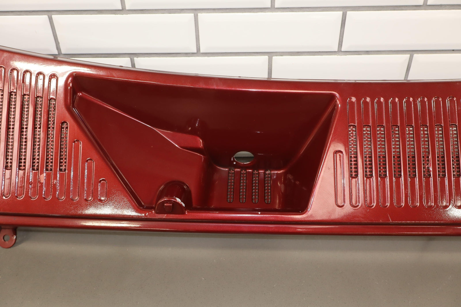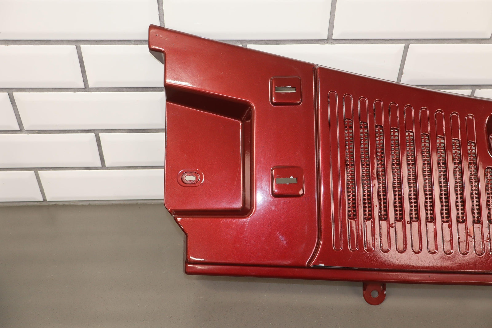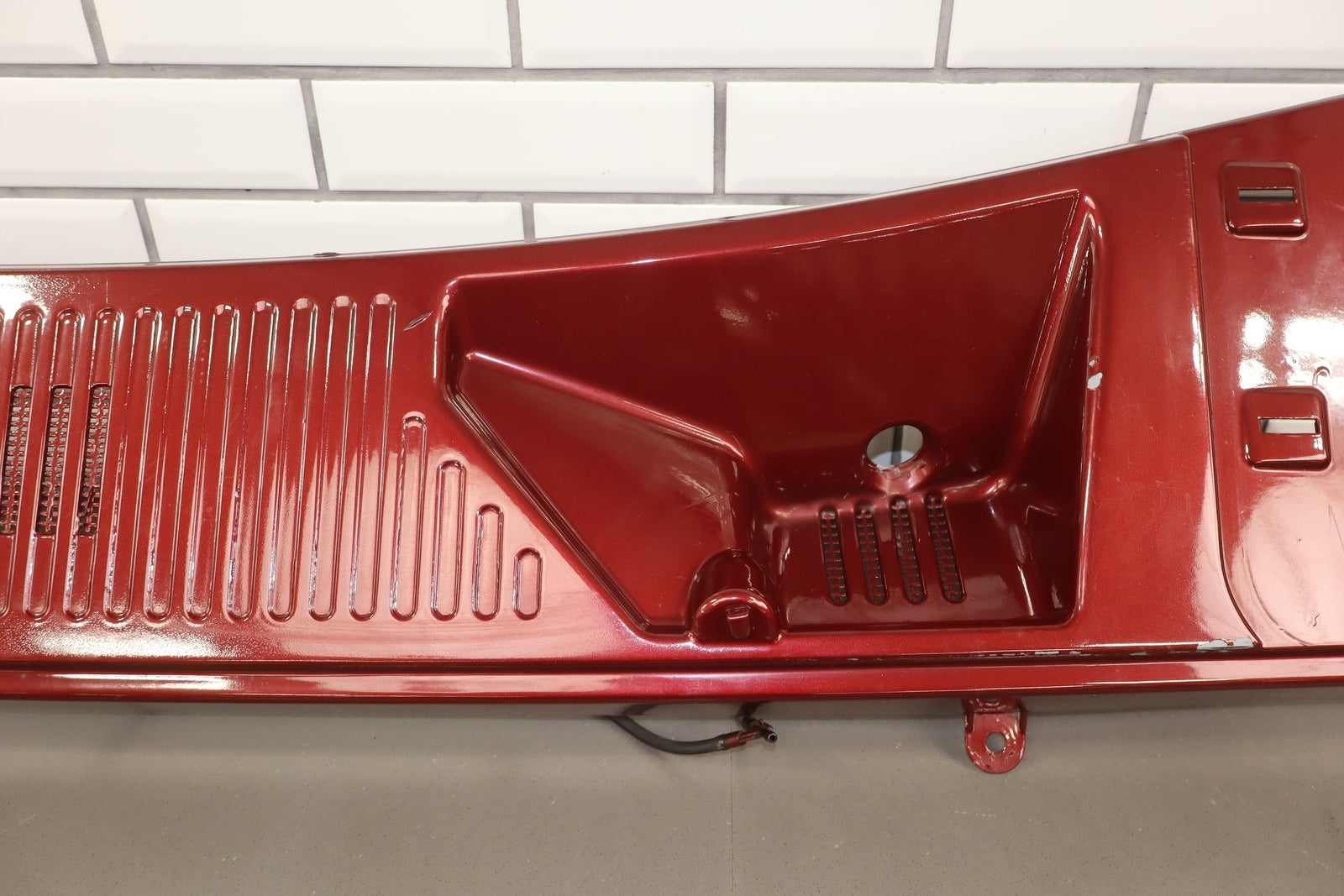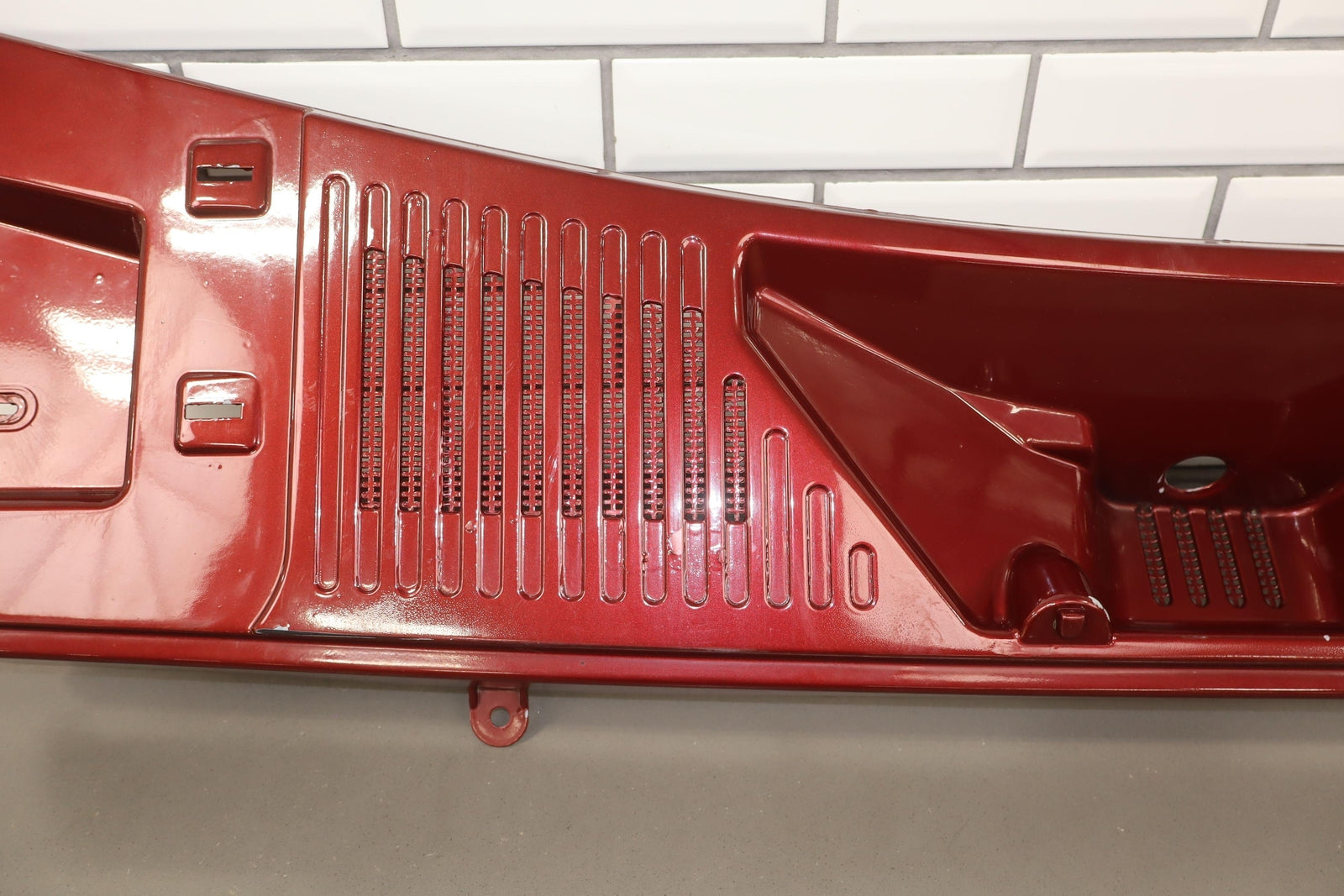 Cowl Vent Panel Center Section, Red Metallic (72u), Poor Respray, 1 Repaired Mount Tab (marked Red), Multiple Paint Chips, Runs