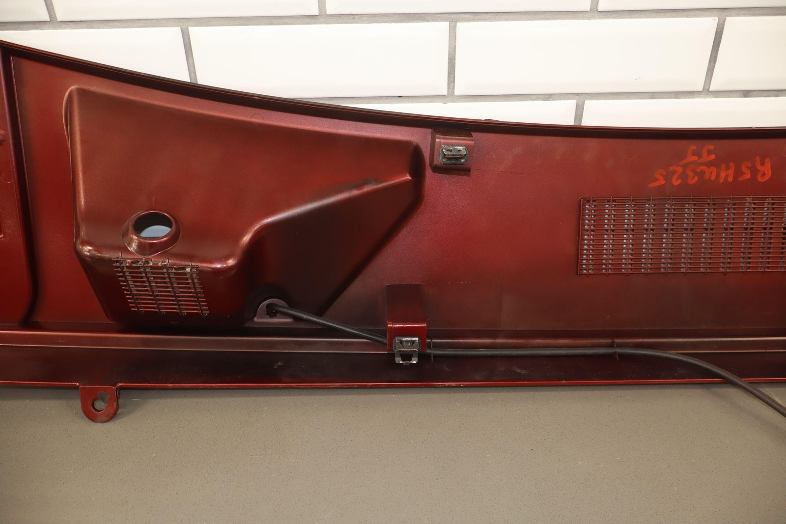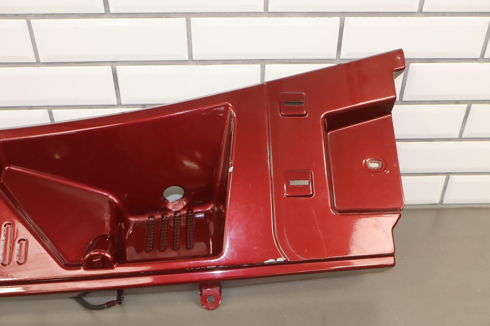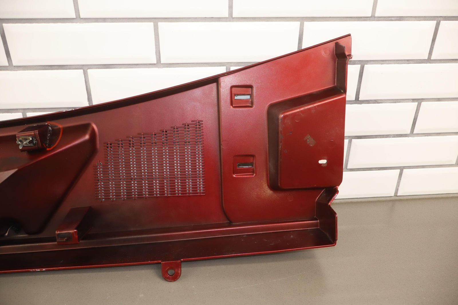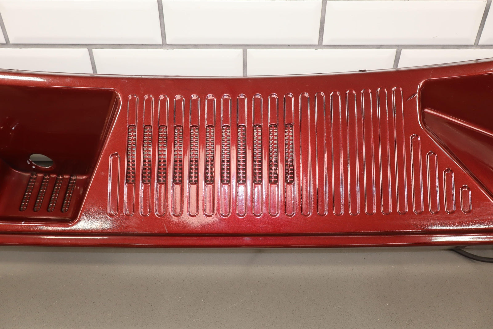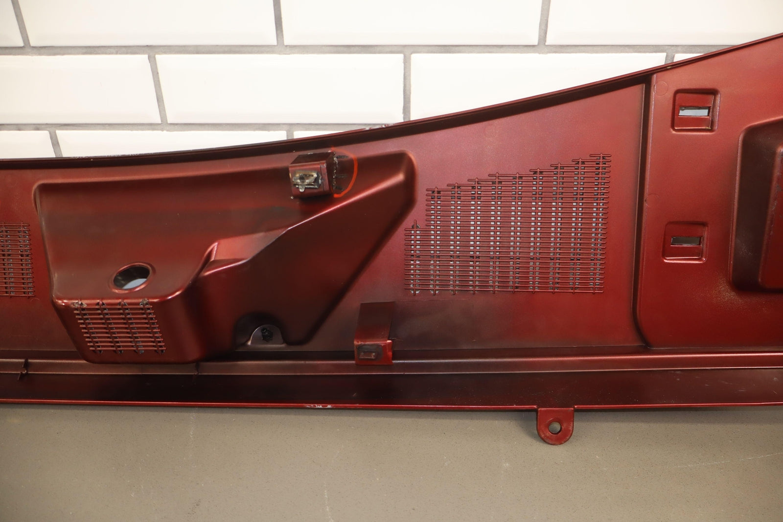 Cowl Vent Panel Center Section, Red Metallic (72u), Poor Respray, 1 Repaired Mount Tab (marked Red), Multiple Paint Chips, Runs