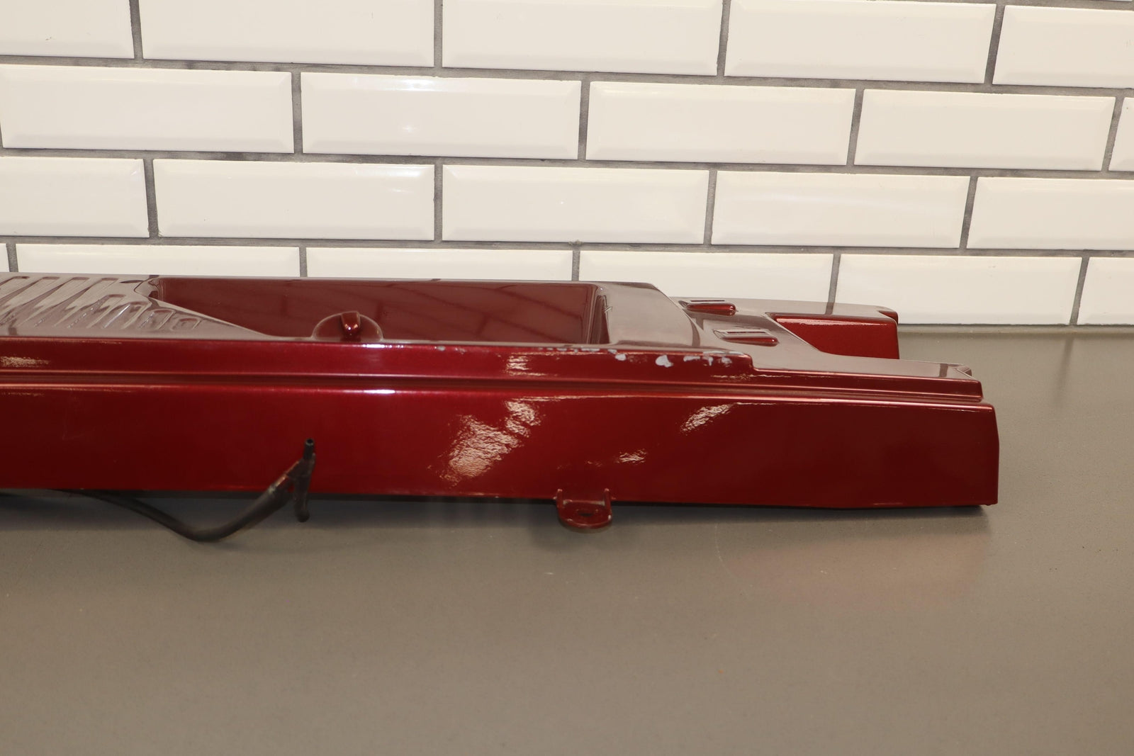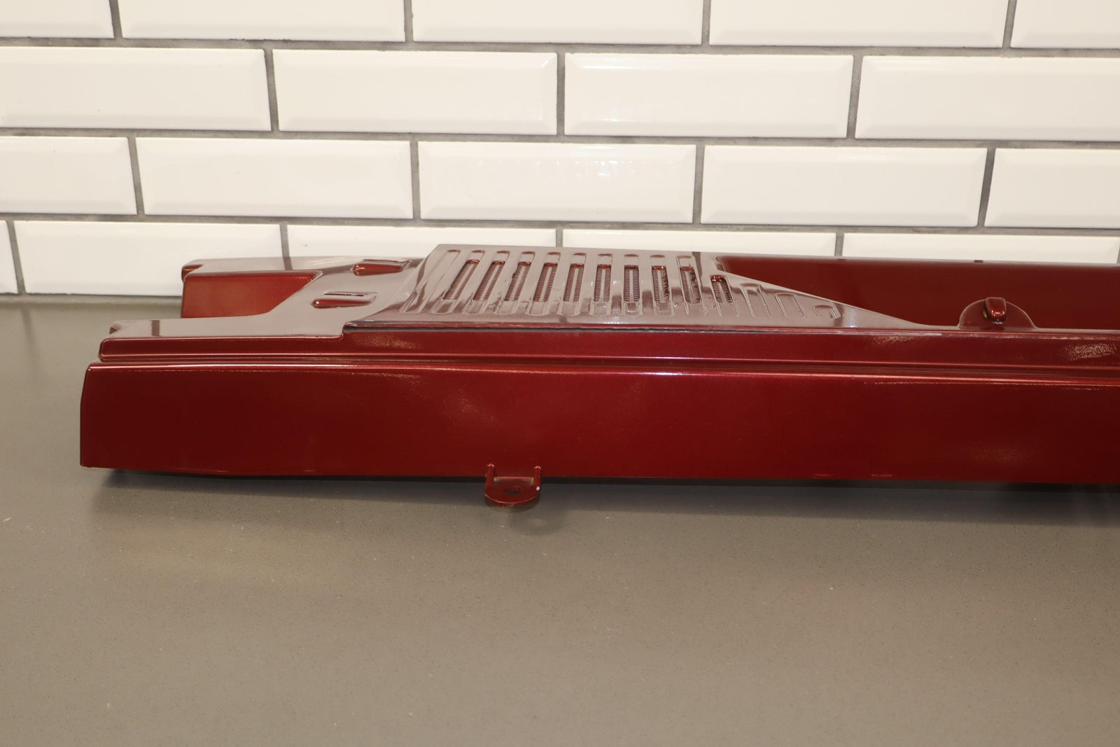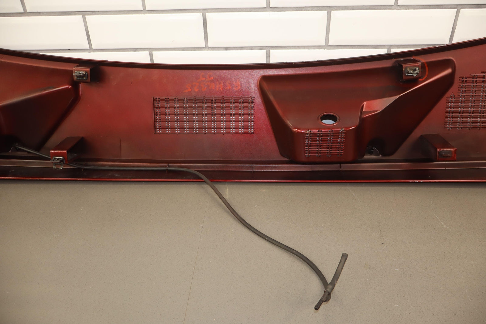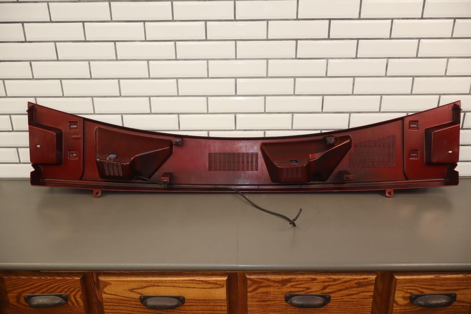 Cowl Vent Panel Center Section, Red Metallic (72u), Poor Respray, 1 Repaired Mount Tab (marked Red), Multiple Paint Chips, Runs