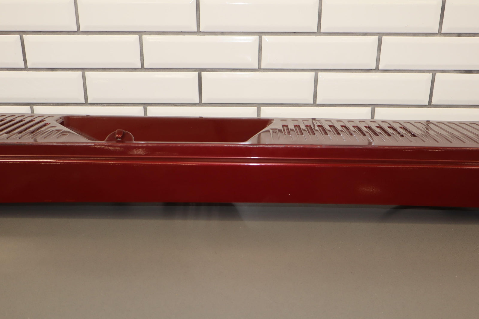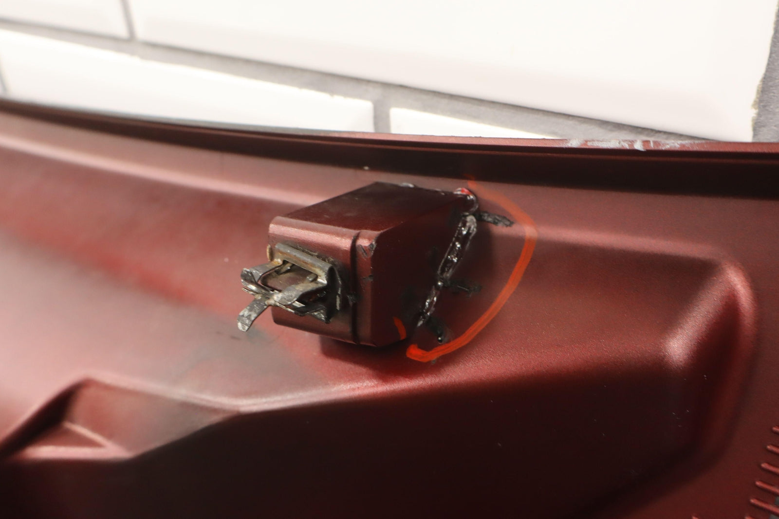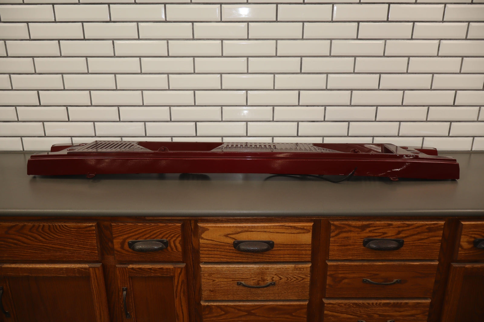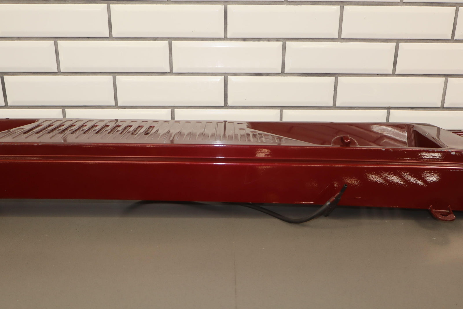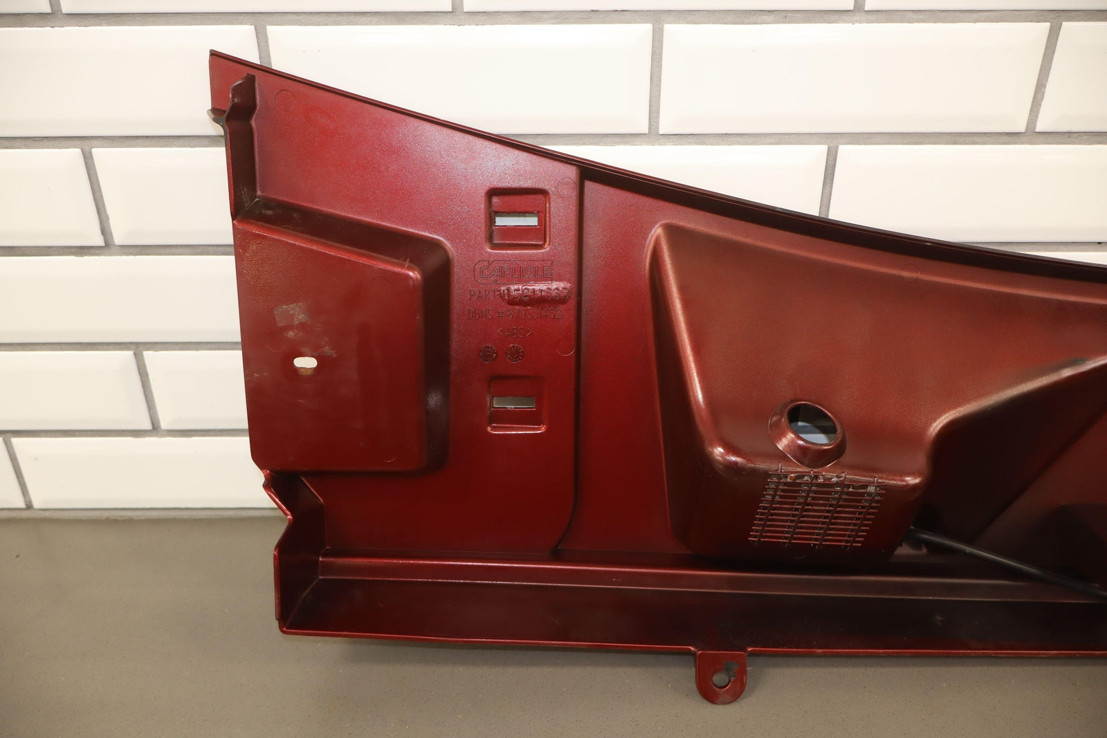 Cowl Vent Panel Center Section, Red Metallic (72u), Poor Respray, 1 Repaired Mount Tab (marked Red), Multiple Paint Chips, Runs