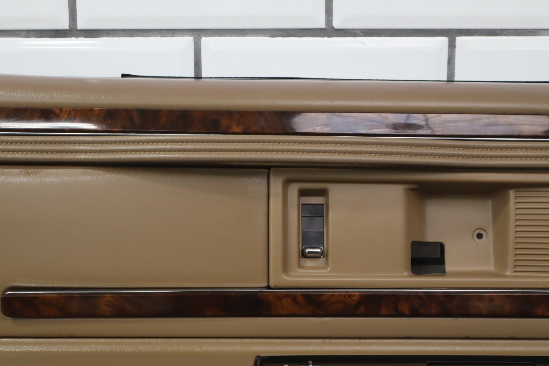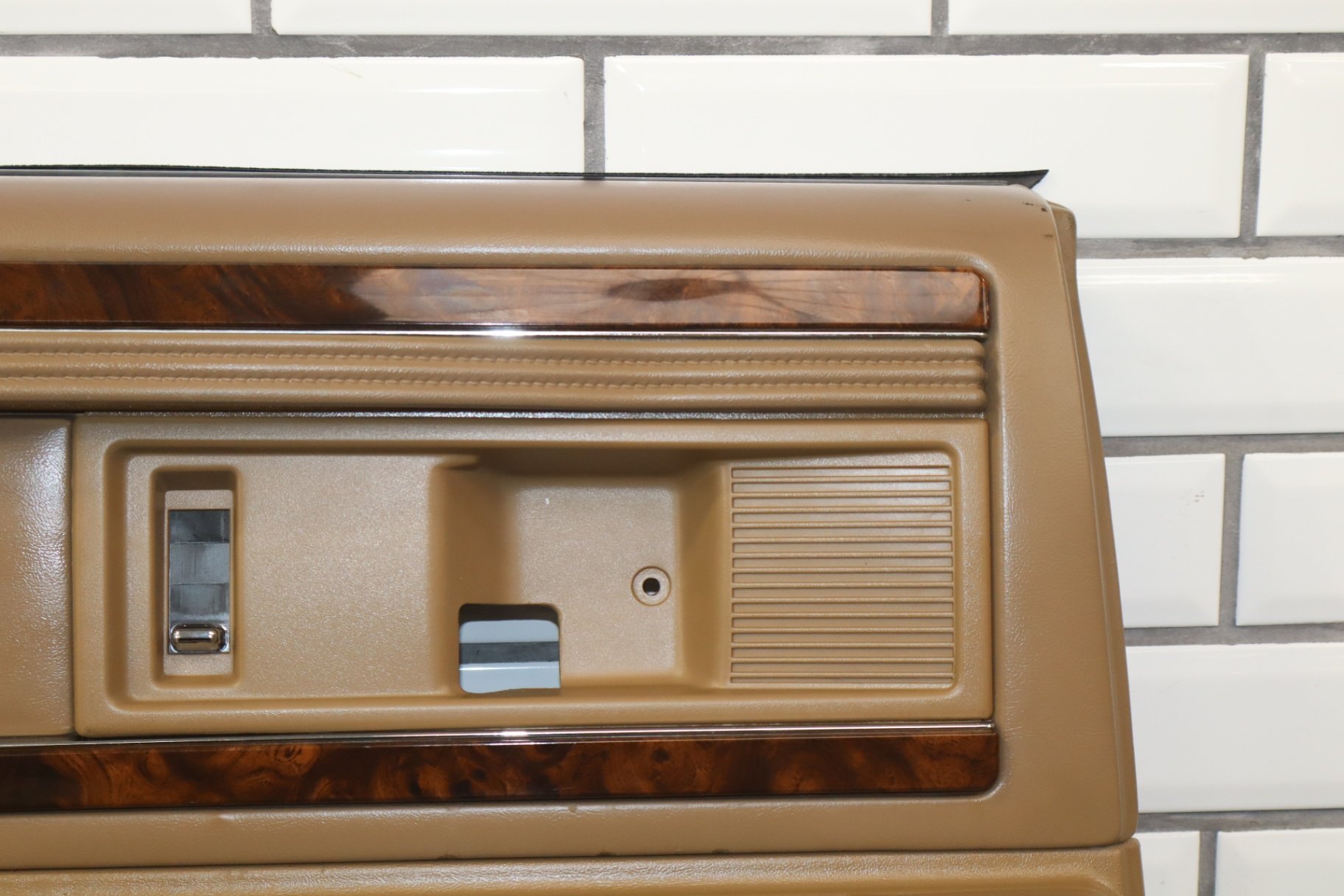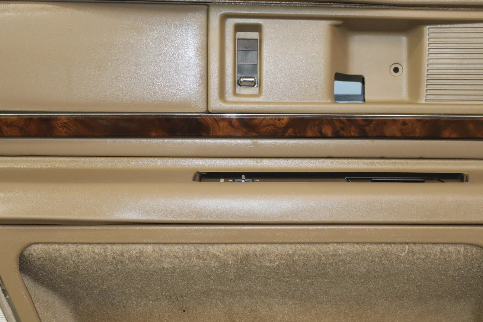 lh rear, includes window switch, decent fade across top, loose lower woodgrain trim, arm rest material starting to lift, minimal staining