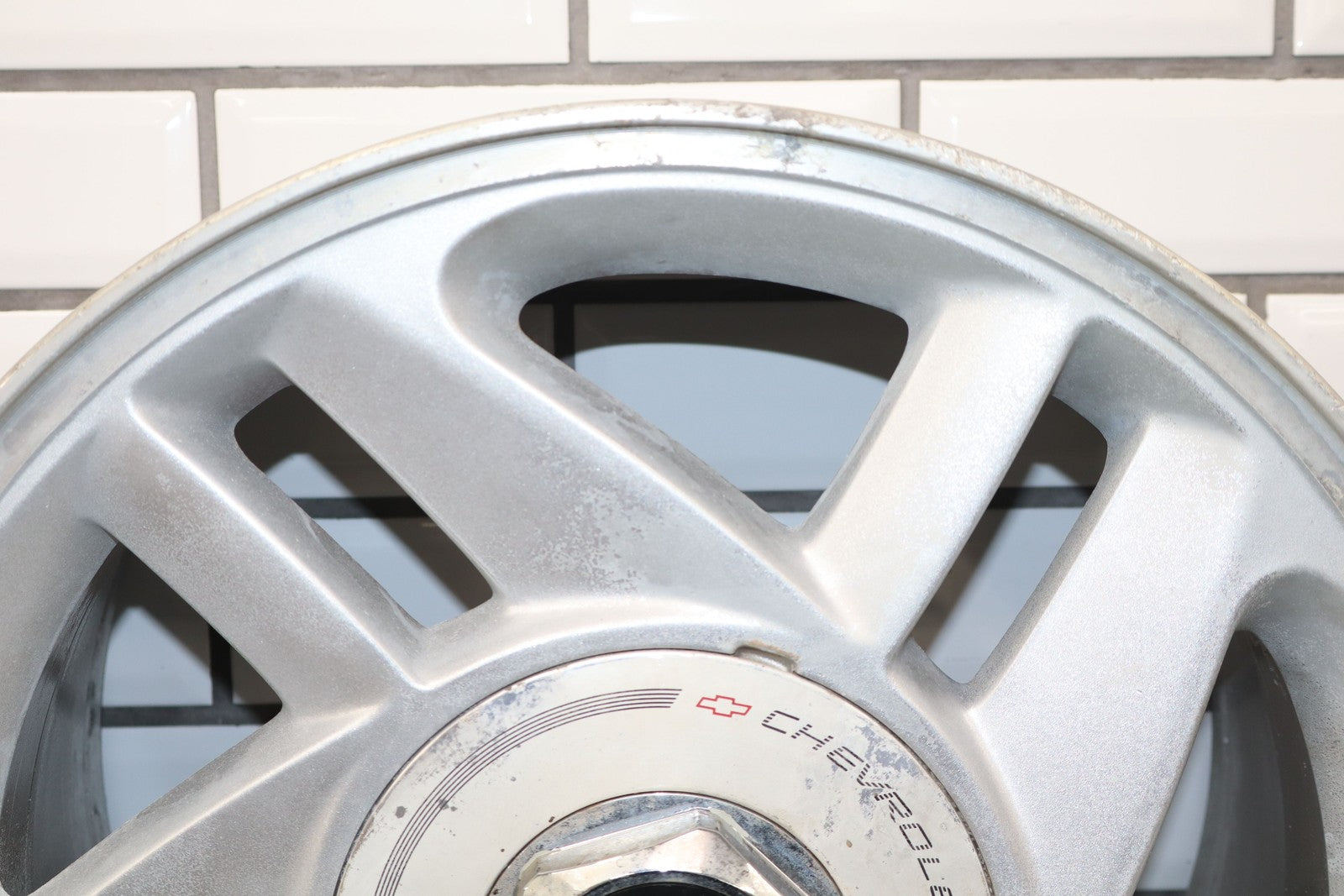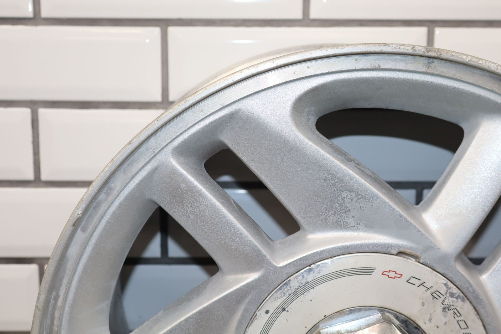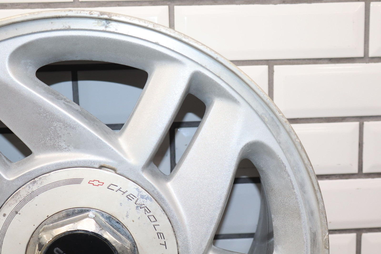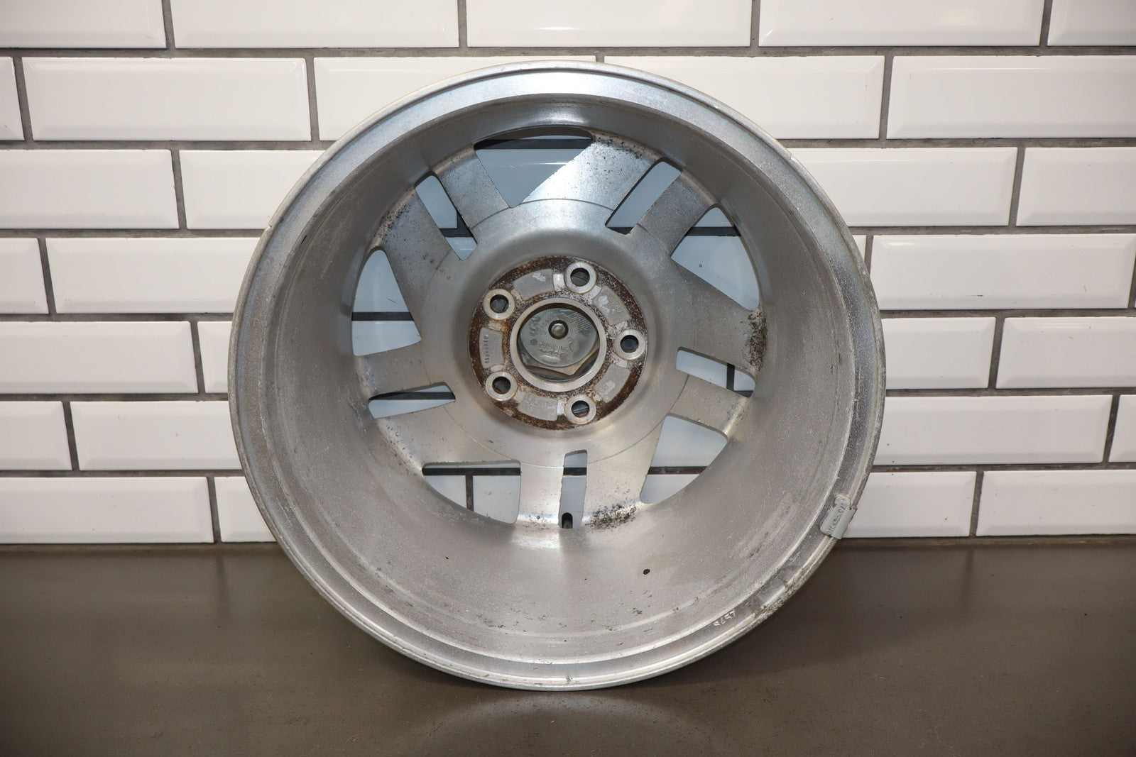 Rh Rear, 16x8 Silver Split 5 Spoke Wheel, Includes Center Cap, Weathered Finish, Some Curb Rash, Spun True