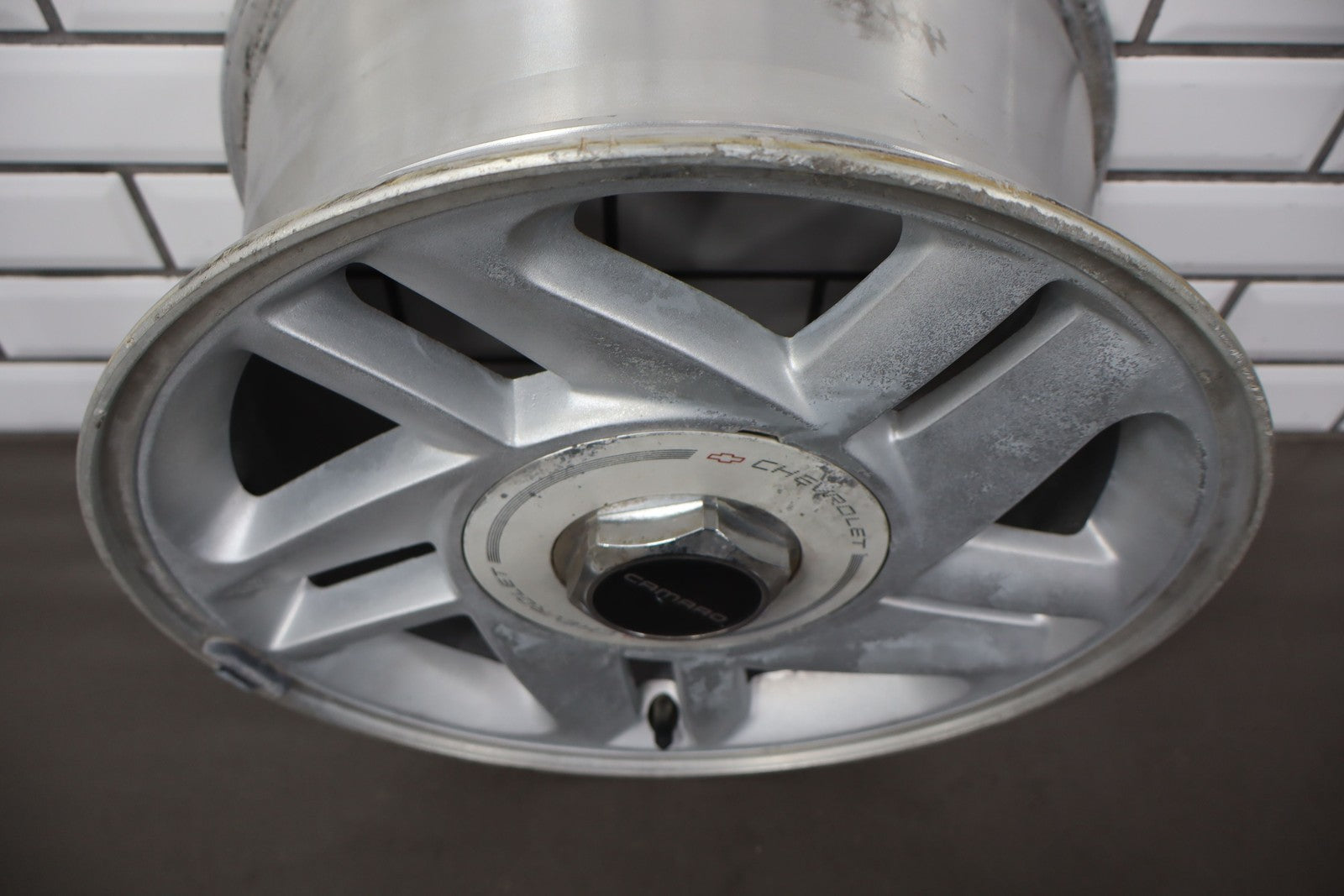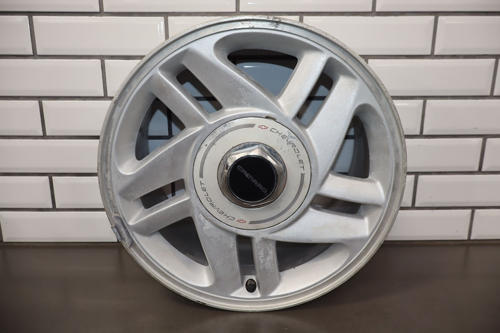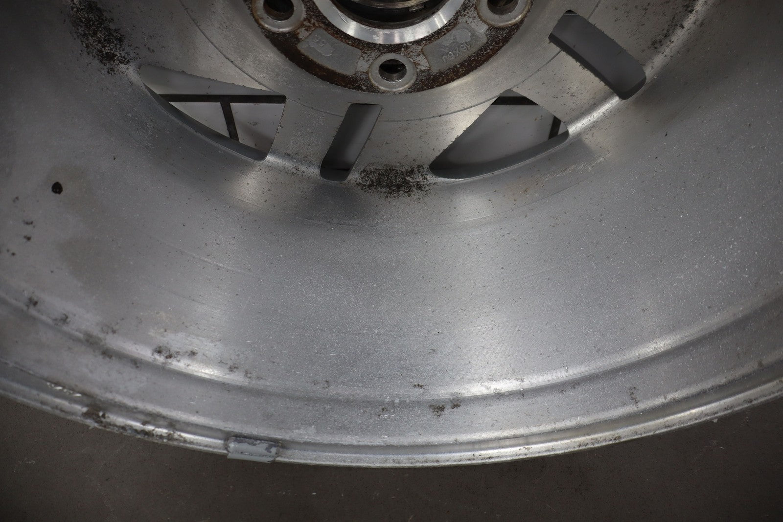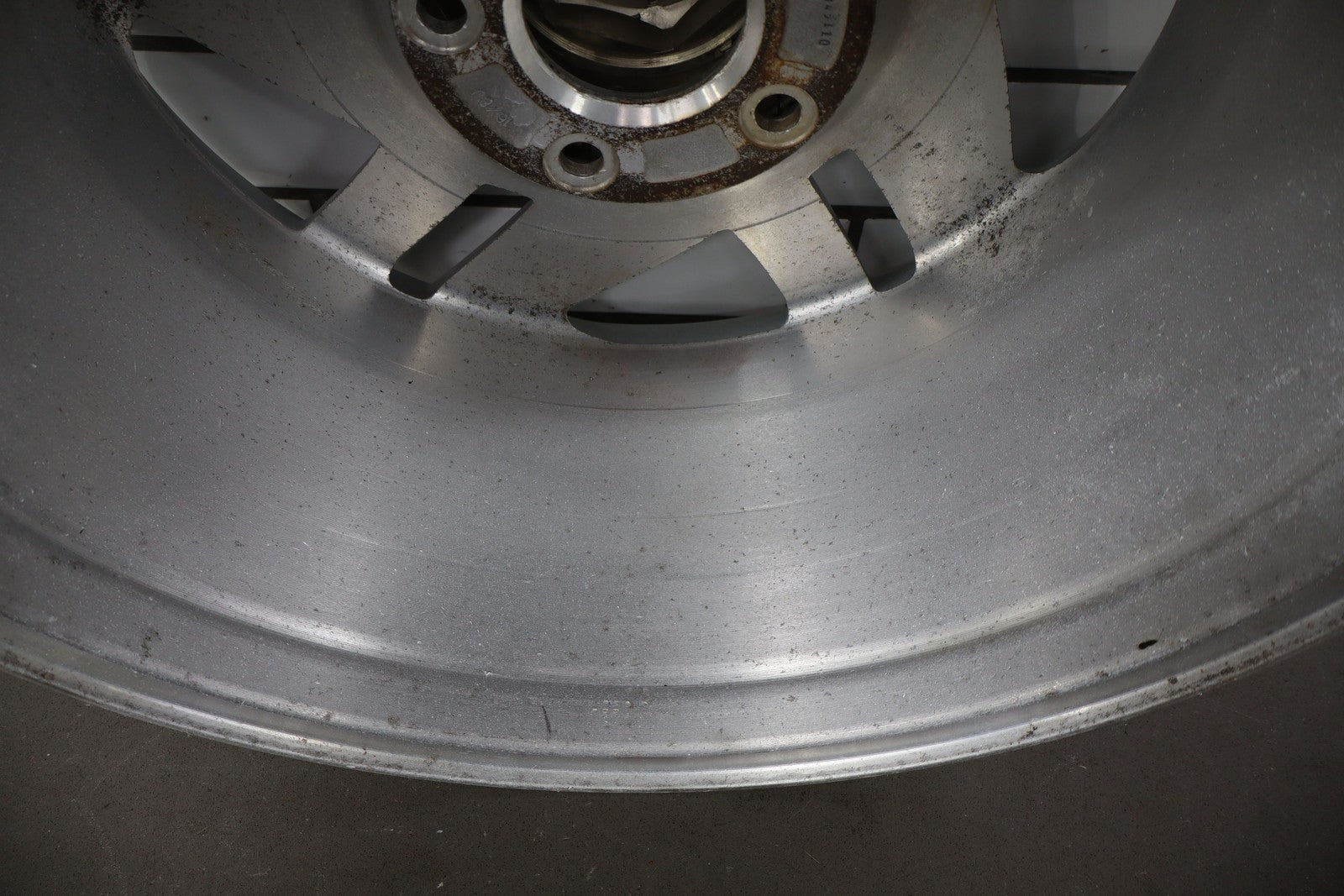 Rh Rear, 16x8 Silver Split 5 Spoke Wheel, Includes Center Cap, Weathered Finish, Some Curb Rash, Spun True