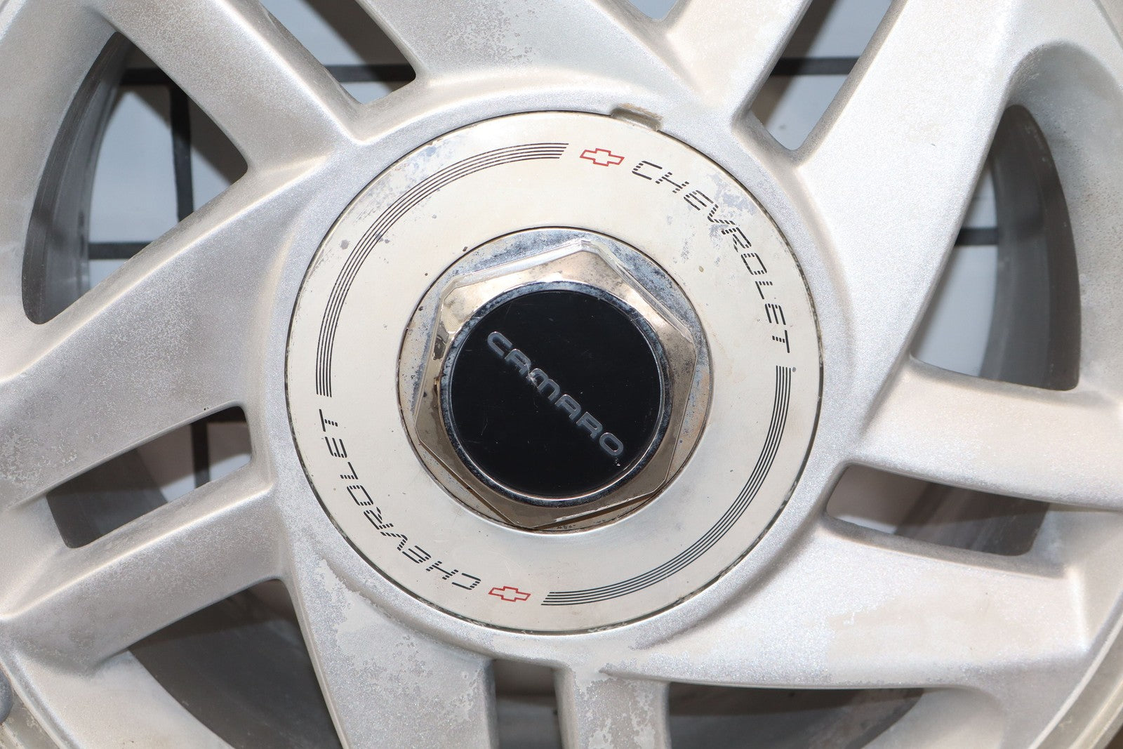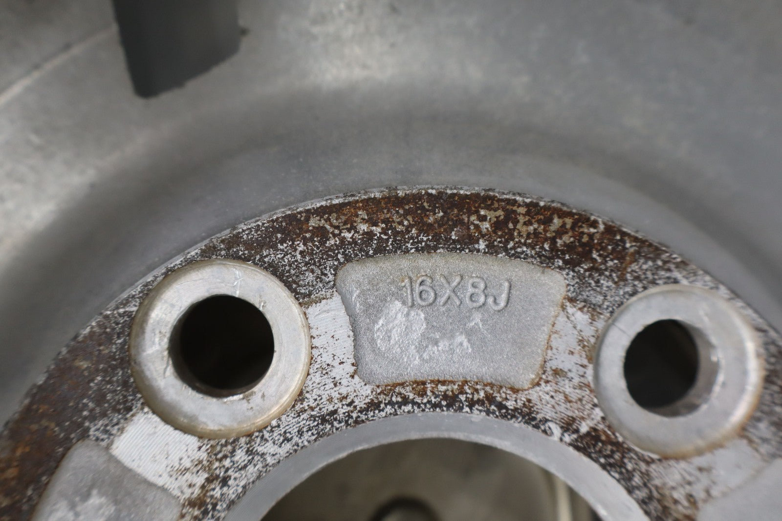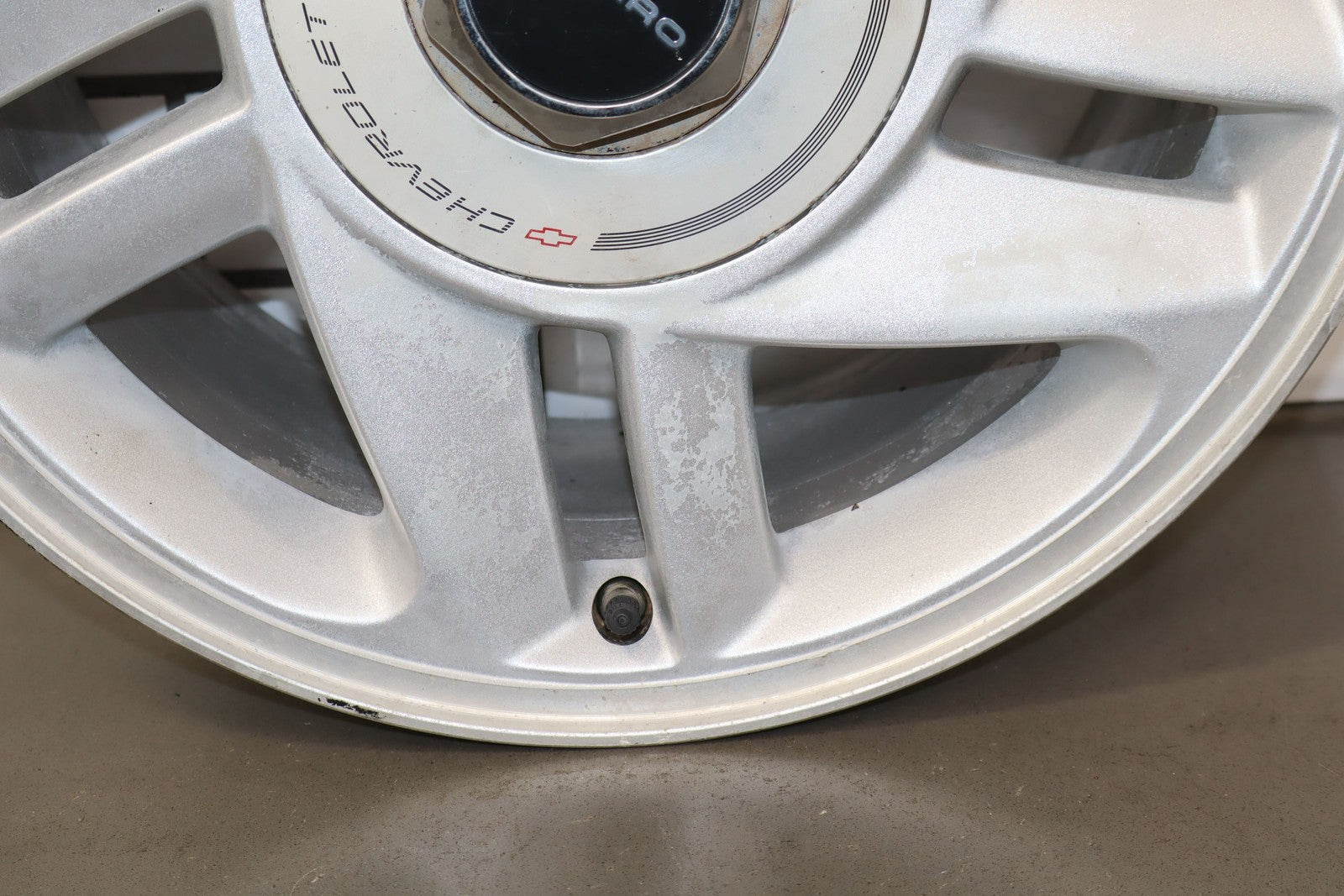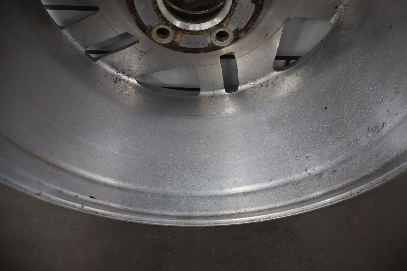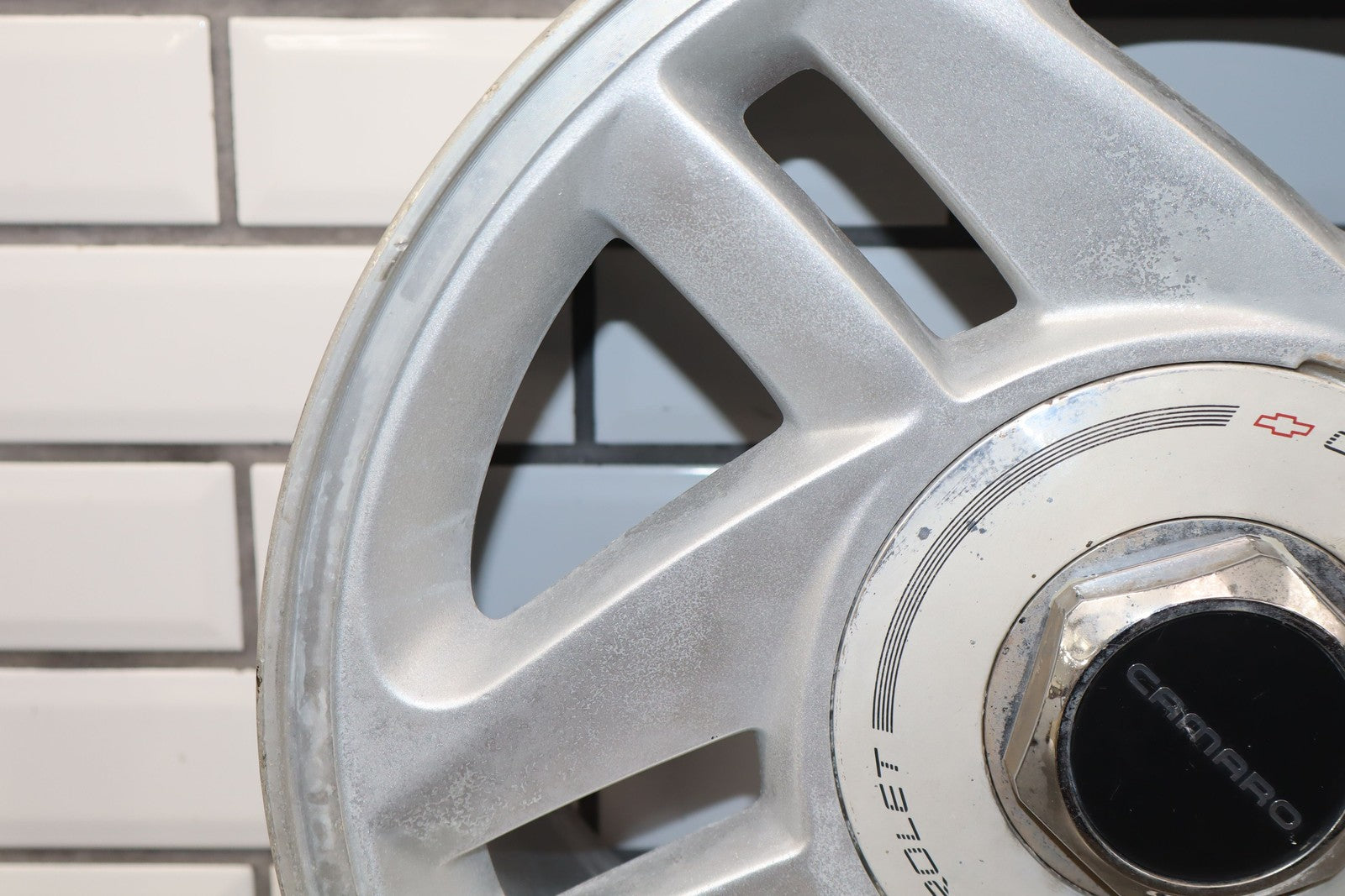 Rh Rear, 16x8 Silver Split 5 Spoke Wheel, Includes Center Cap, Weathered Finish, Some Curb Rash, Spun True