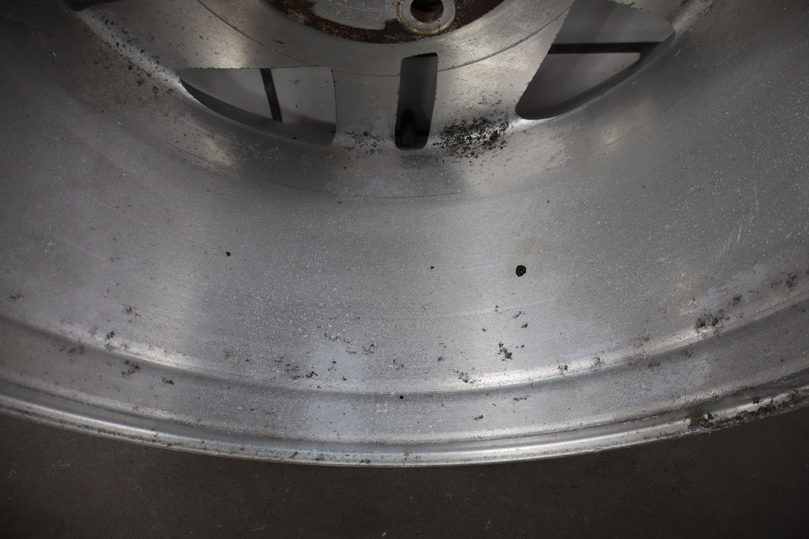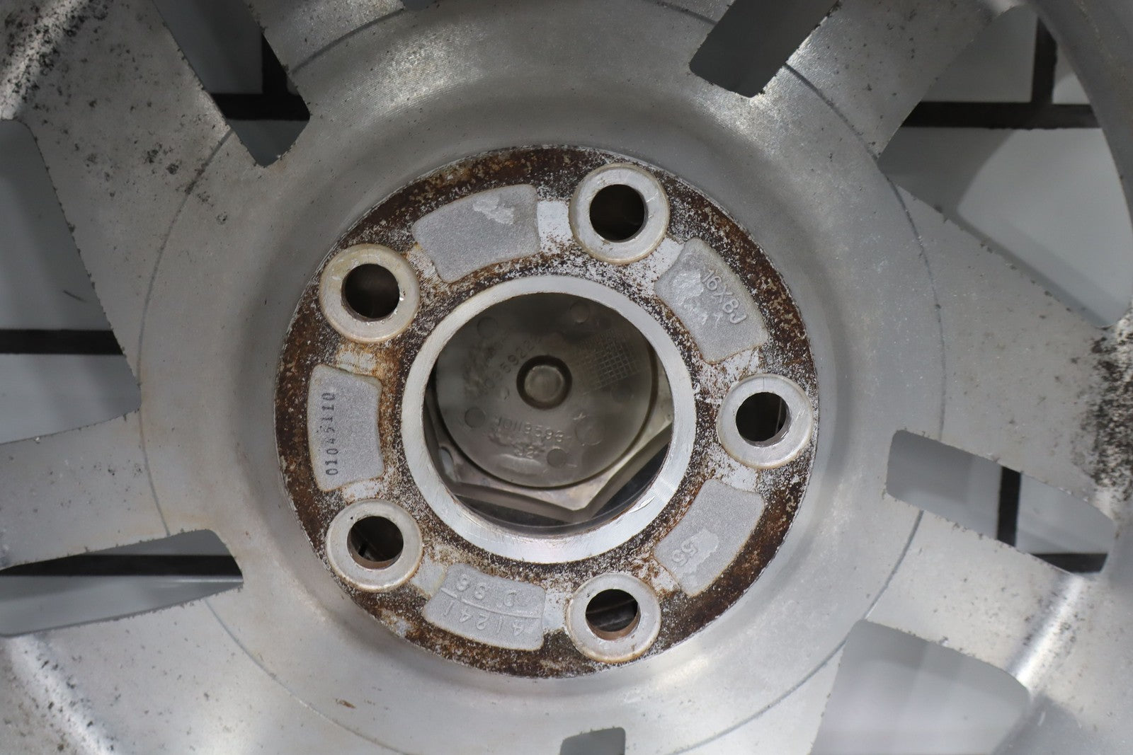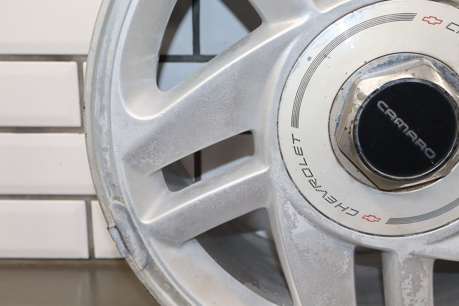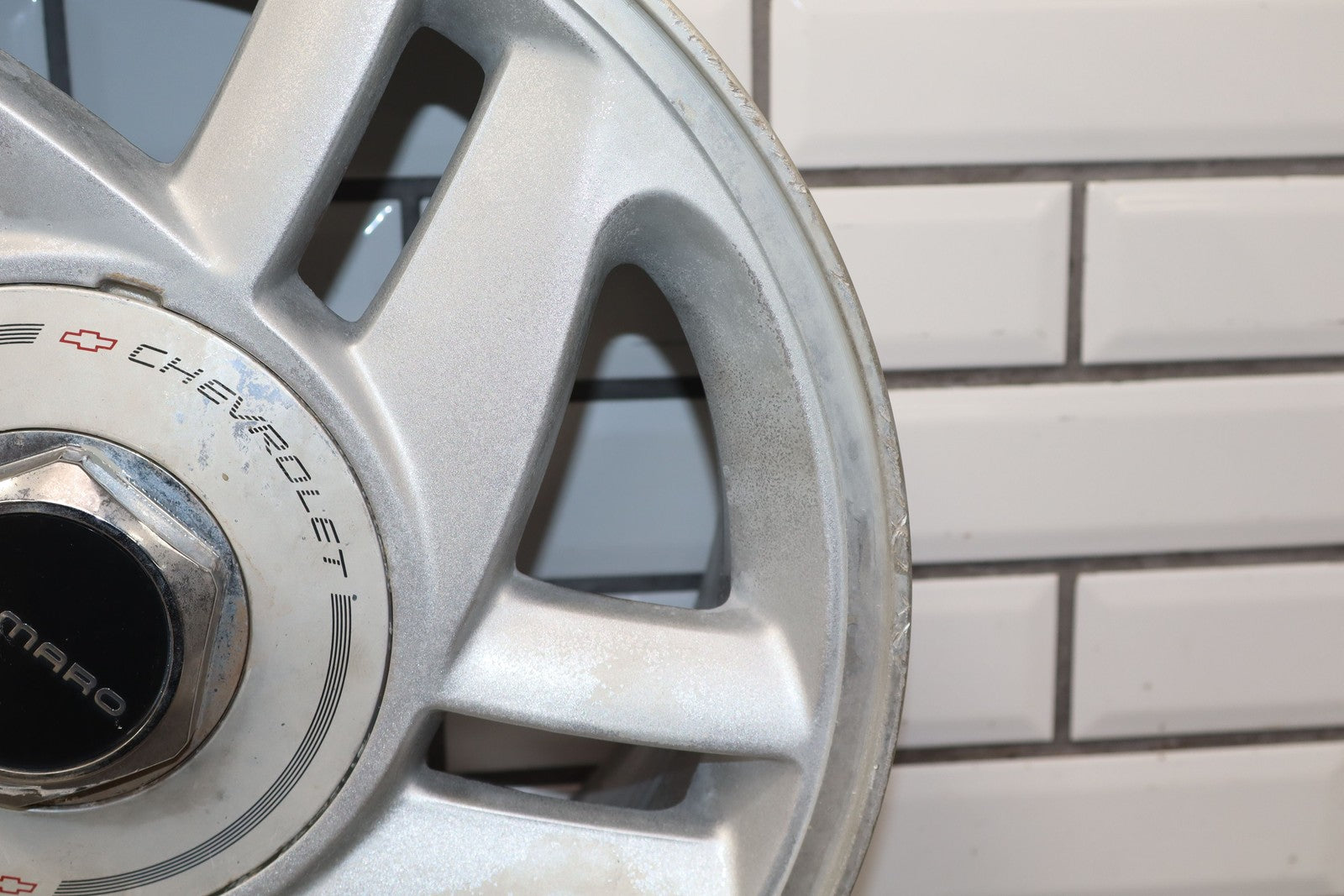 Rh Rear, 16x8 Silver Split 5 Spoke Wheel, Includes Center Cap, Weathered Finish, Some Curb Rash, Spun True