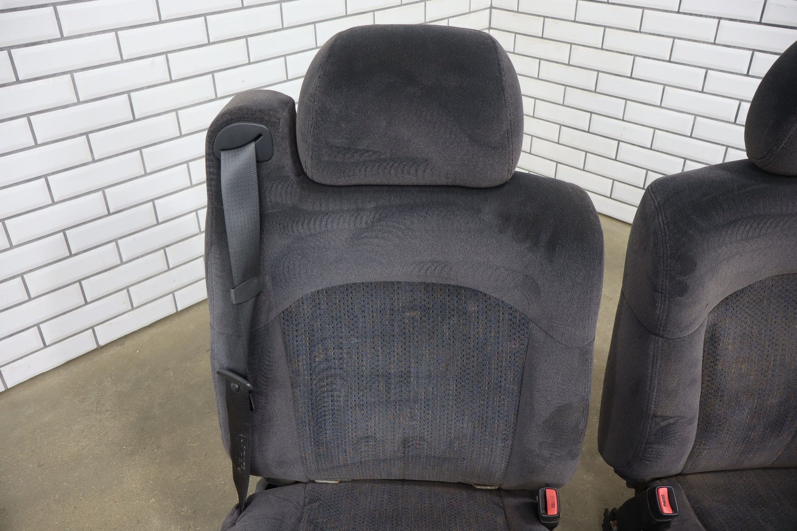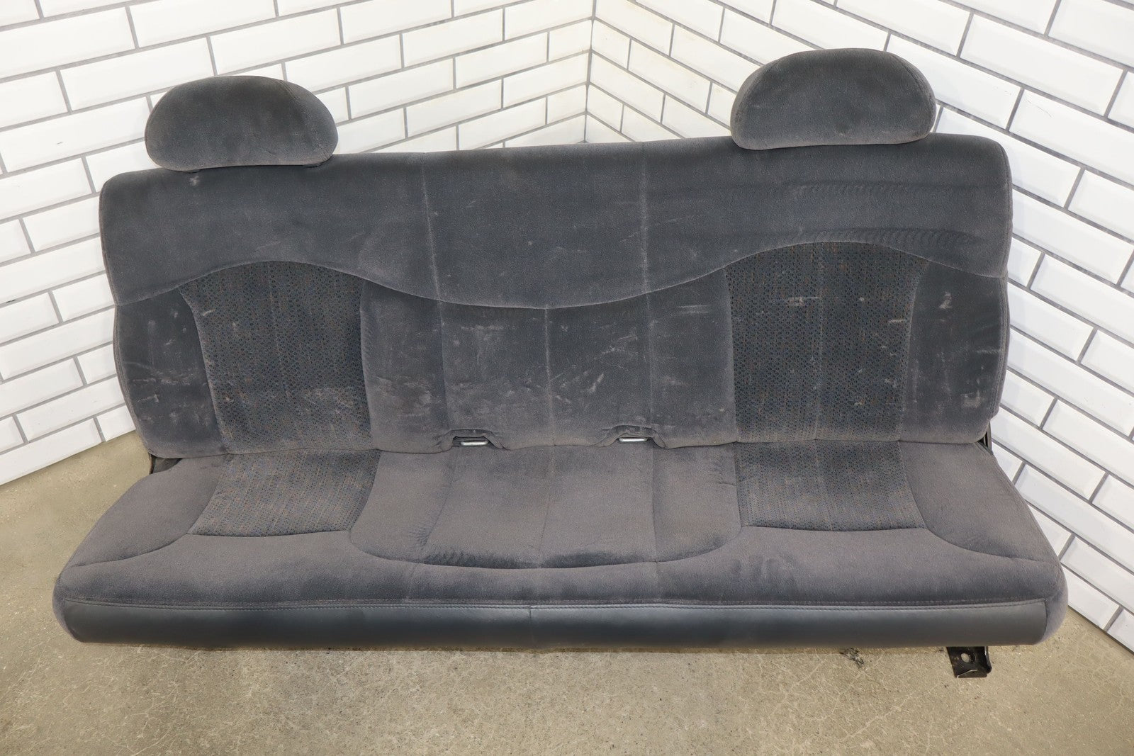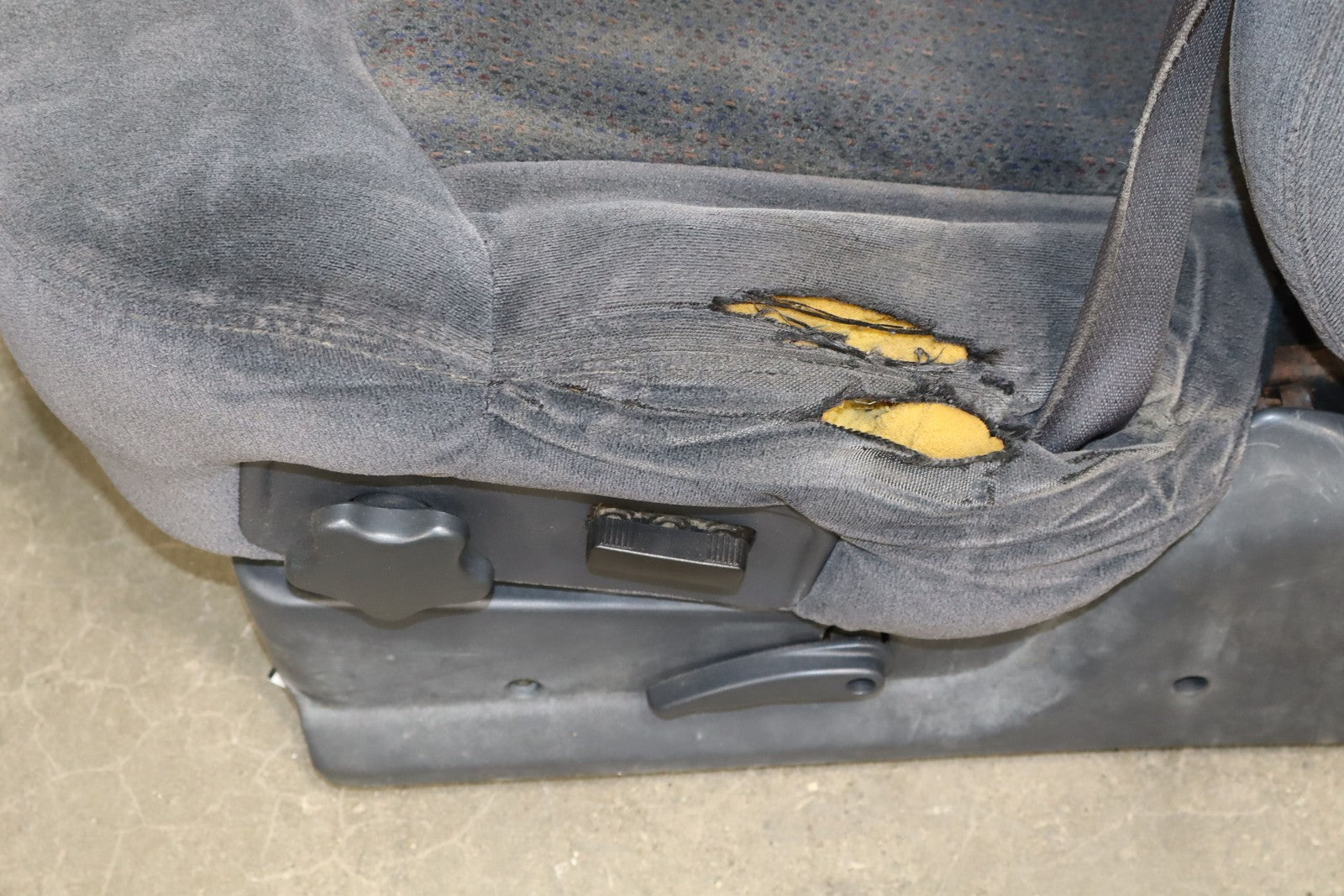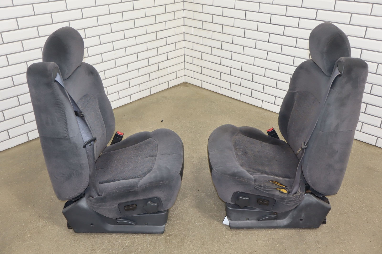 Important notes: Lh Cloth Seat Set (extended Cab), Graphite (12d), Includes Front Jump Seat, Lf Lower Torn, Mild Wear Throughout, Some Staining