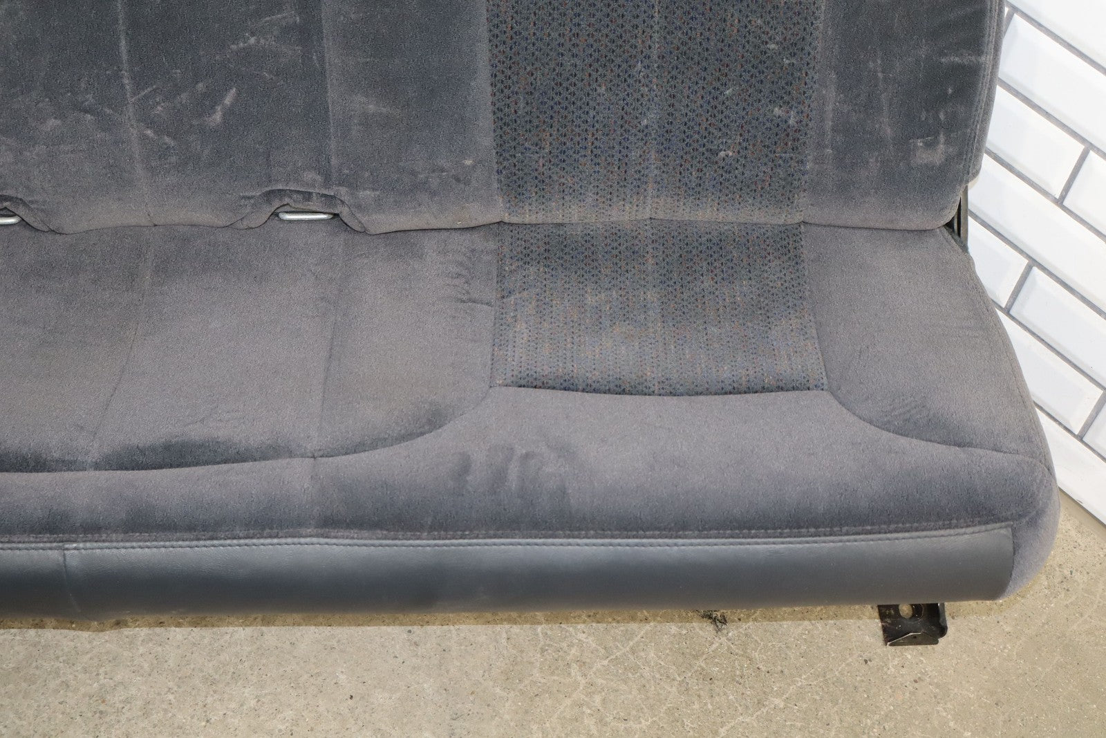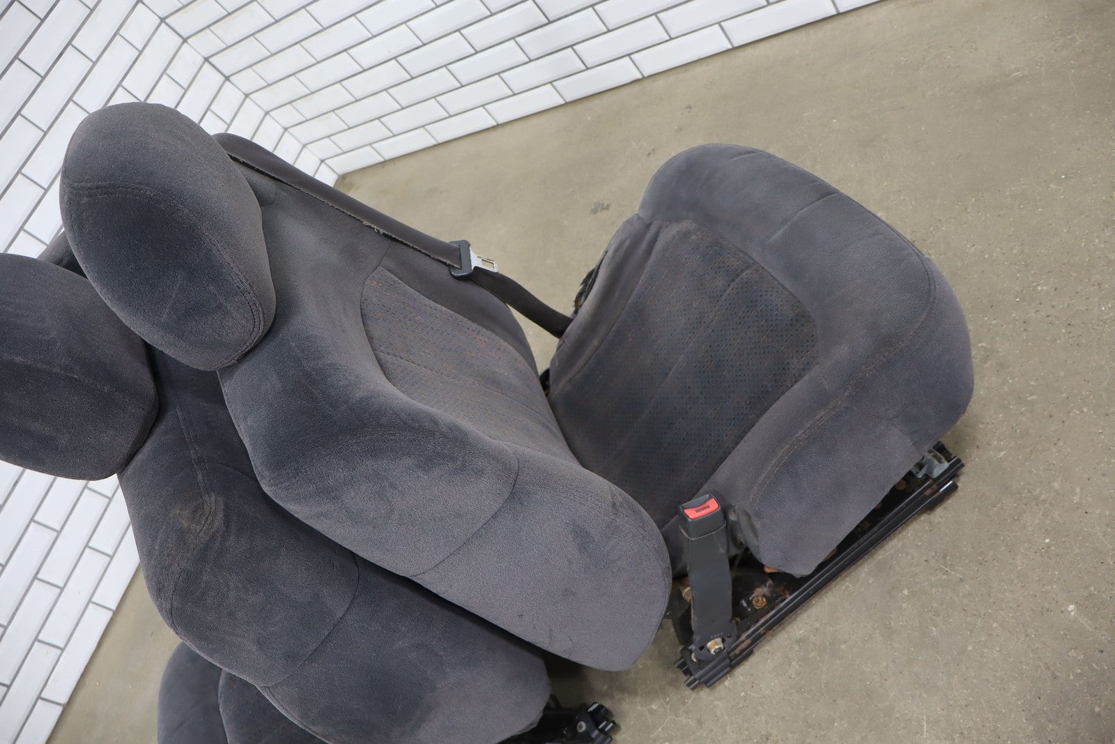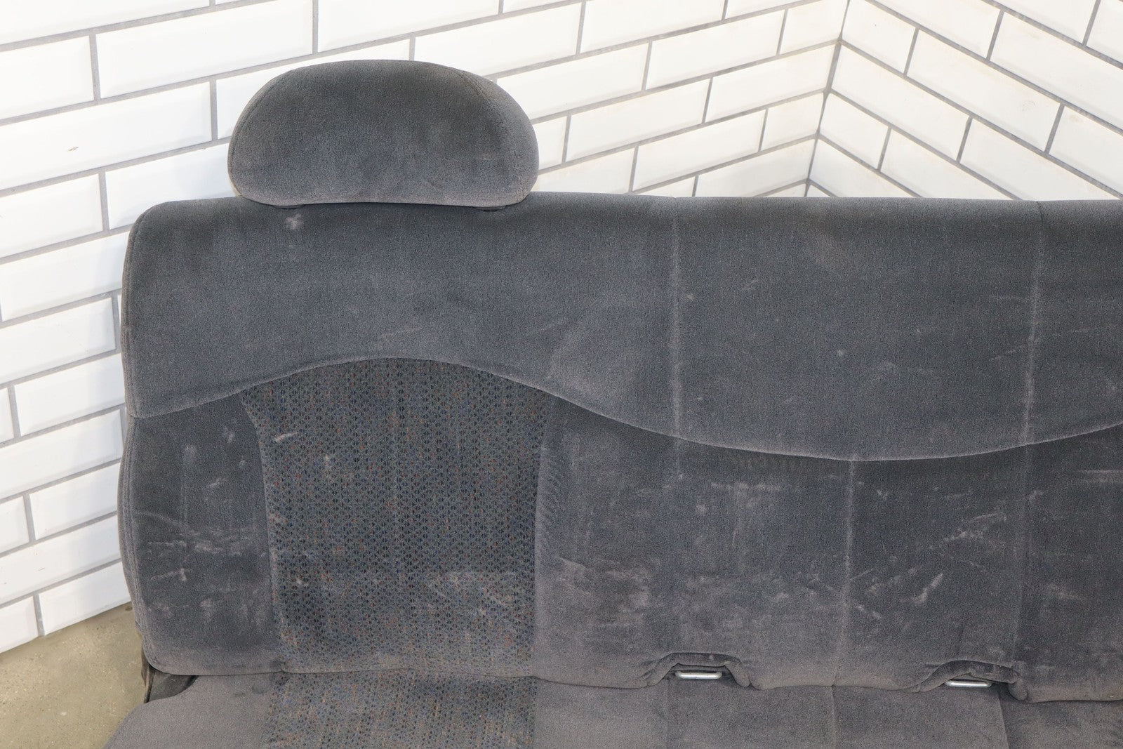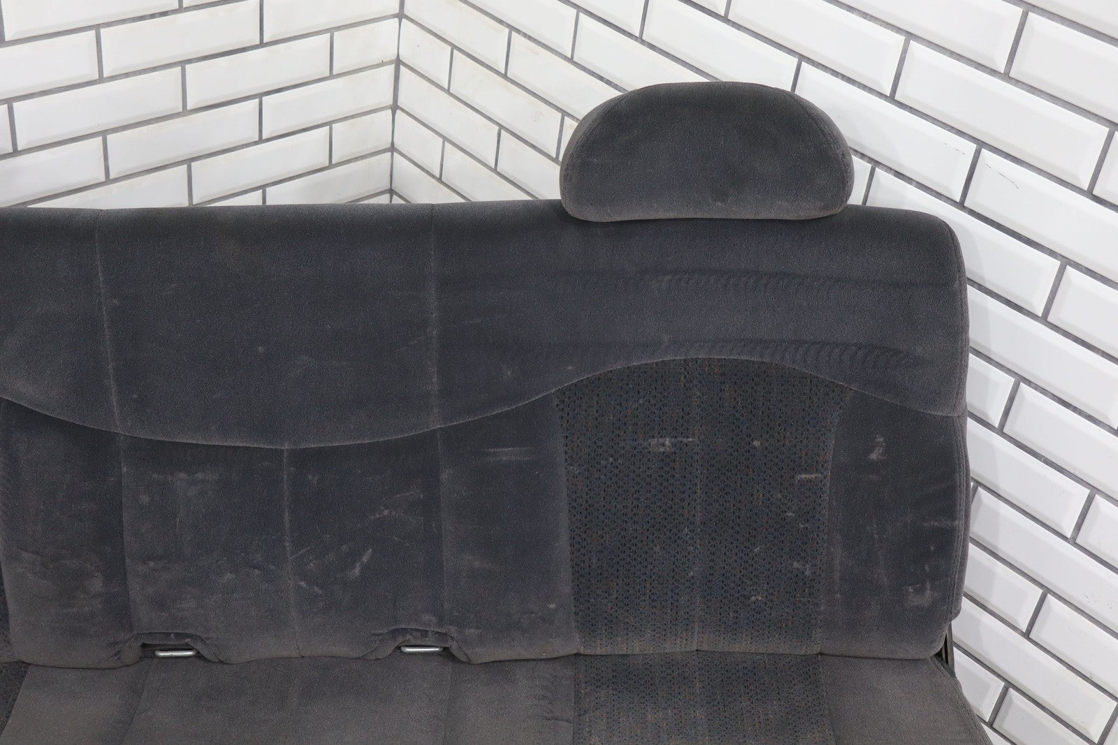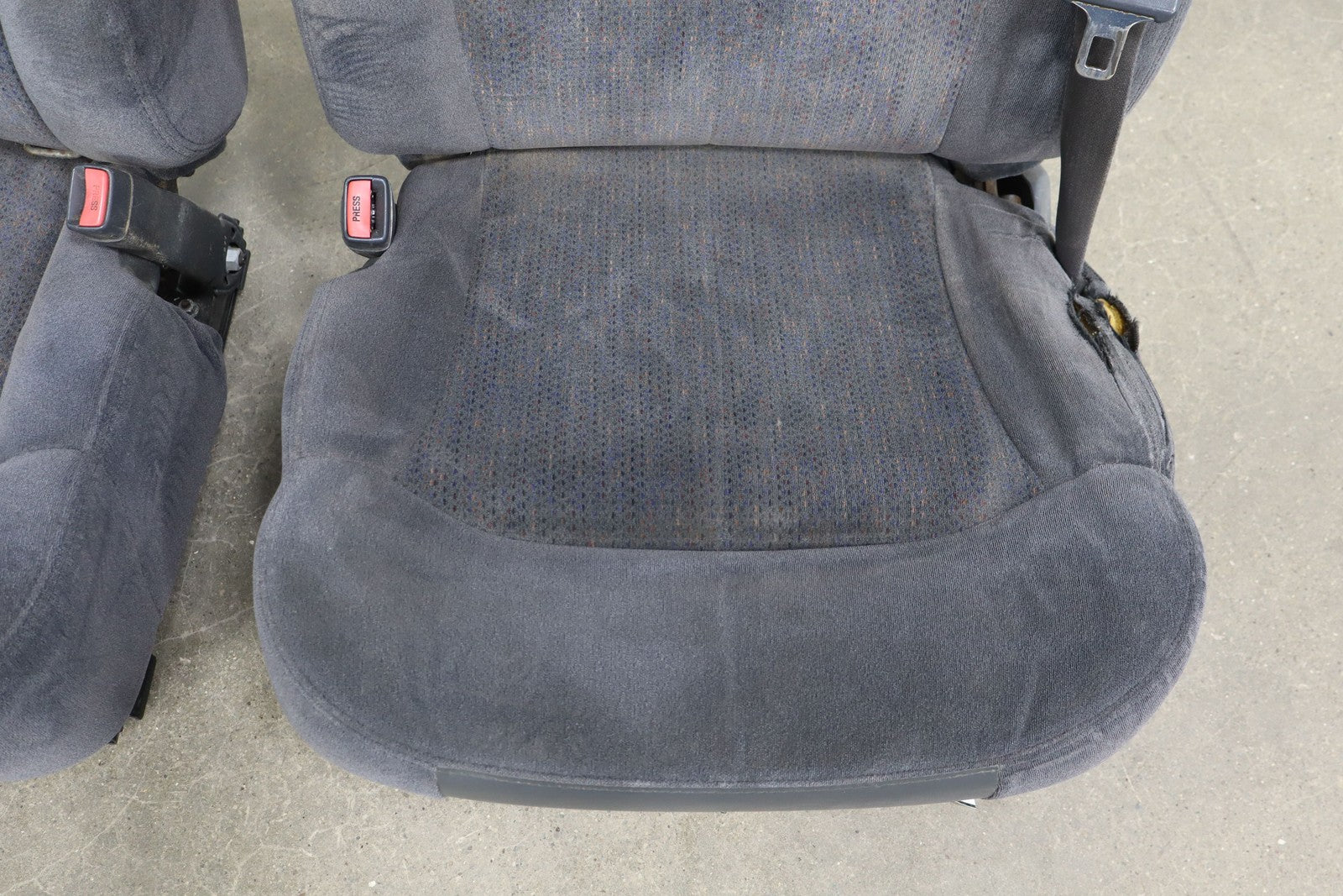 Important notes: Lh Cloth Seat Set (extended Cab), Graphite (12d), Includes Front Jump Seat, Lf Lower Torn, Mild Wear Throughout, Some Staining