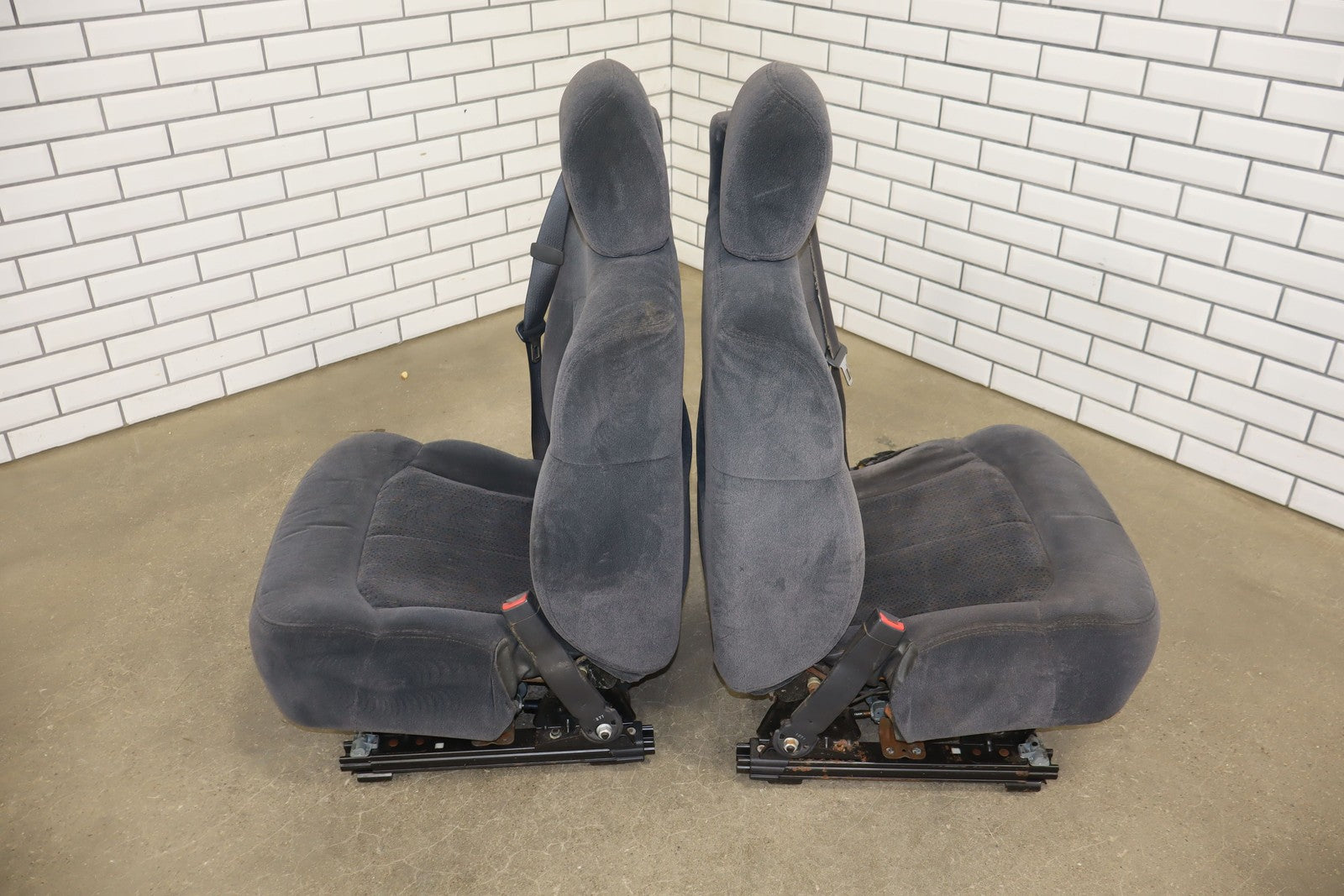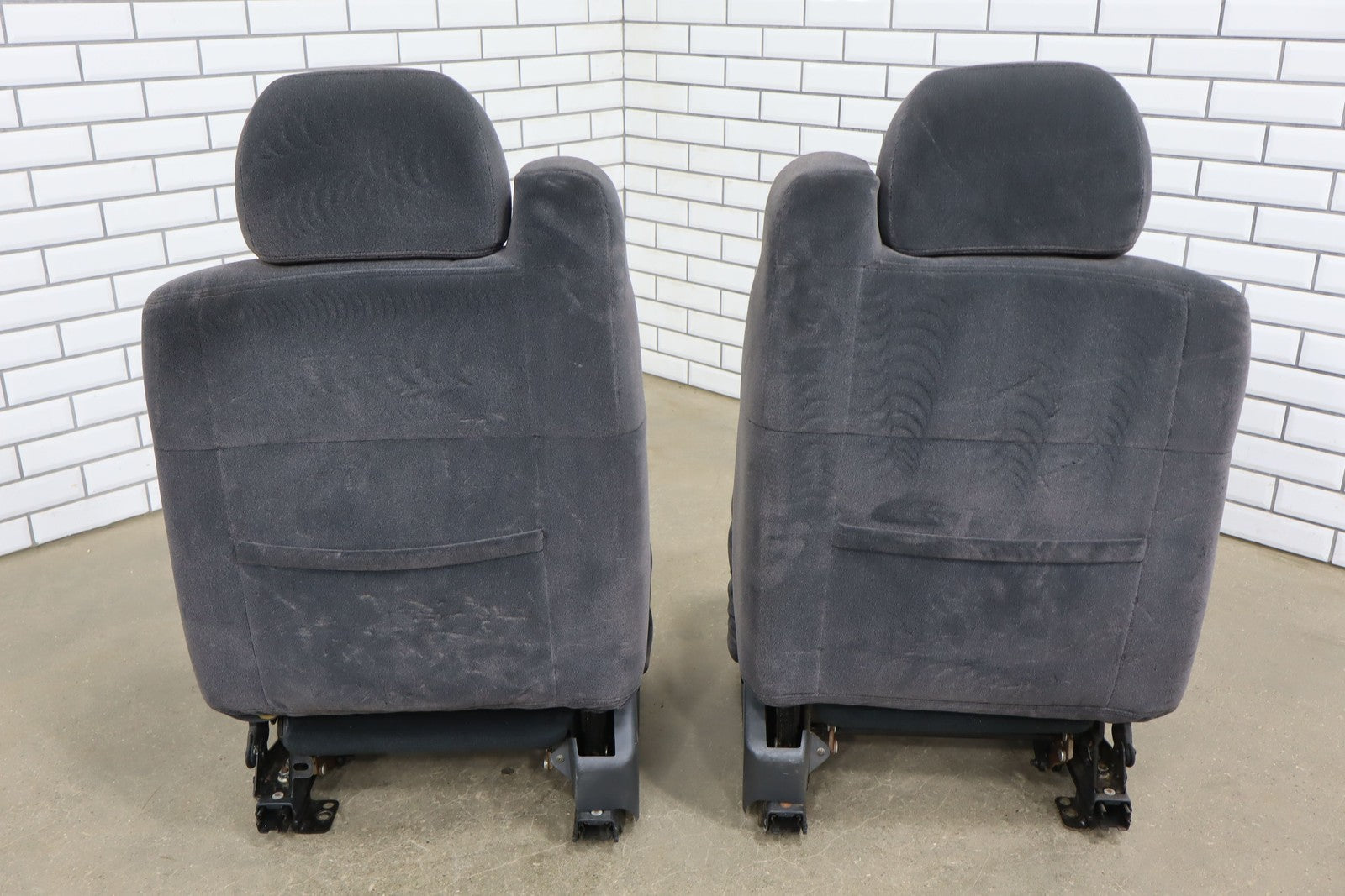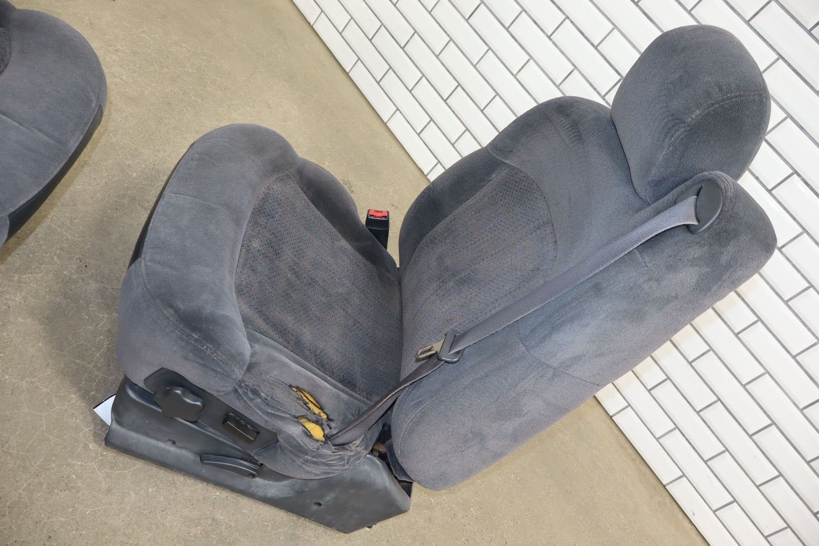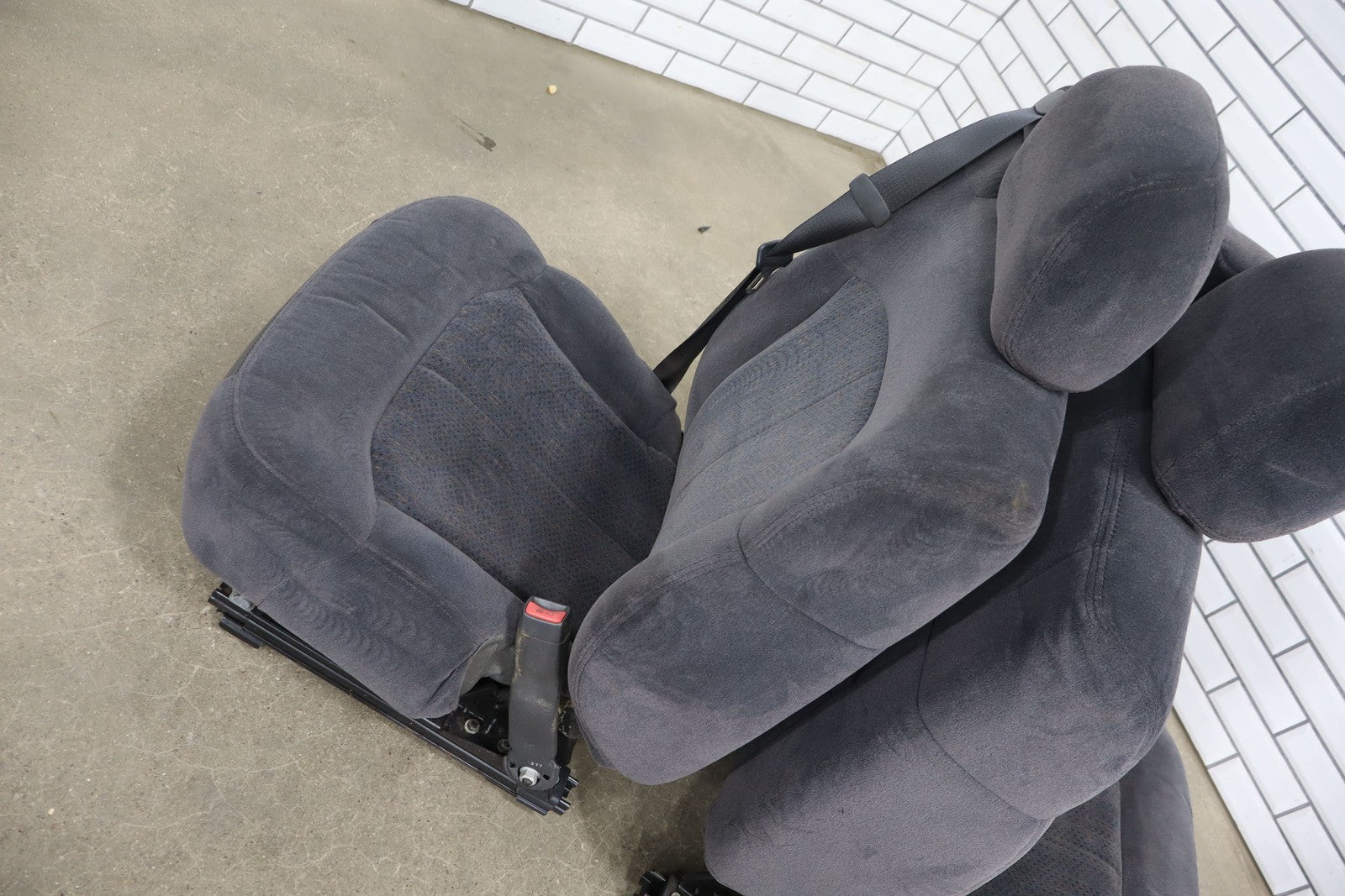 Important notes: Lh Cloth Seat Set (extended Cab), Graphite (12d), Includes Front Jump Seat, Lf Lower Torn, Mild Wear Throughout, Some Staining