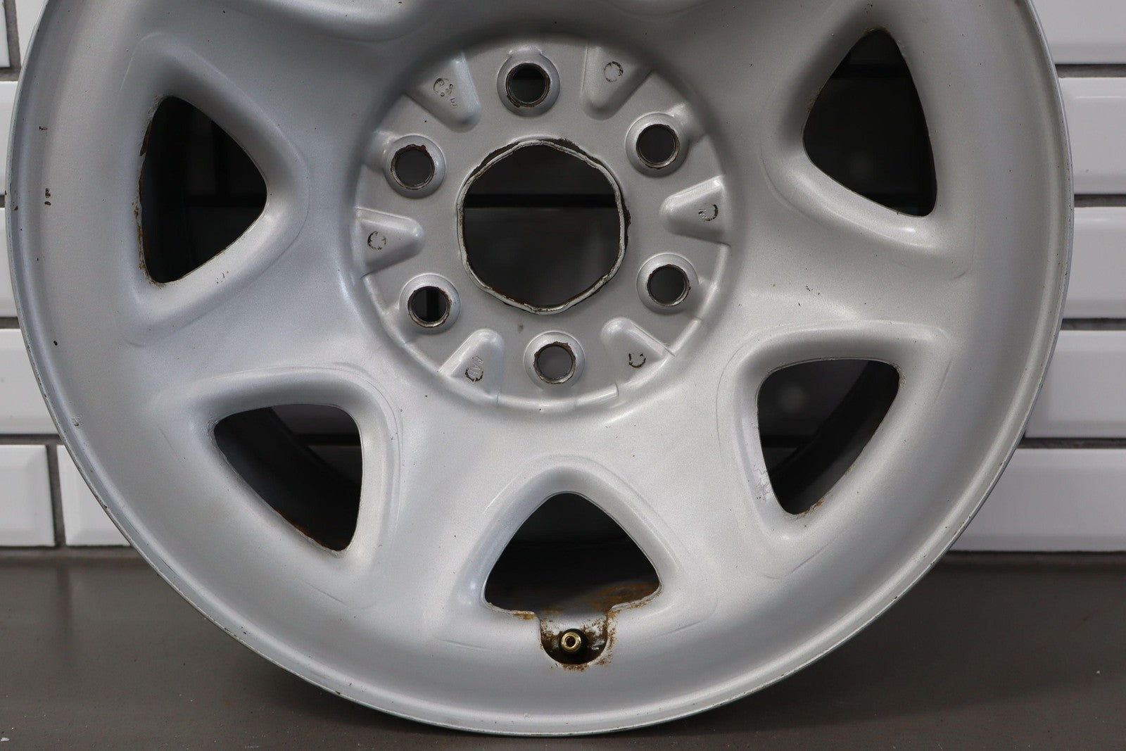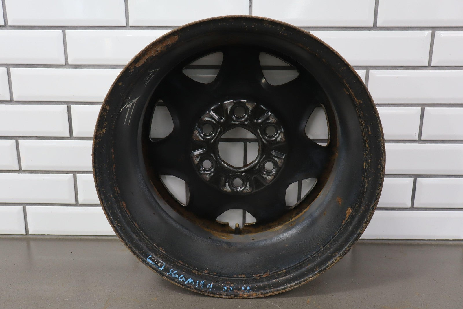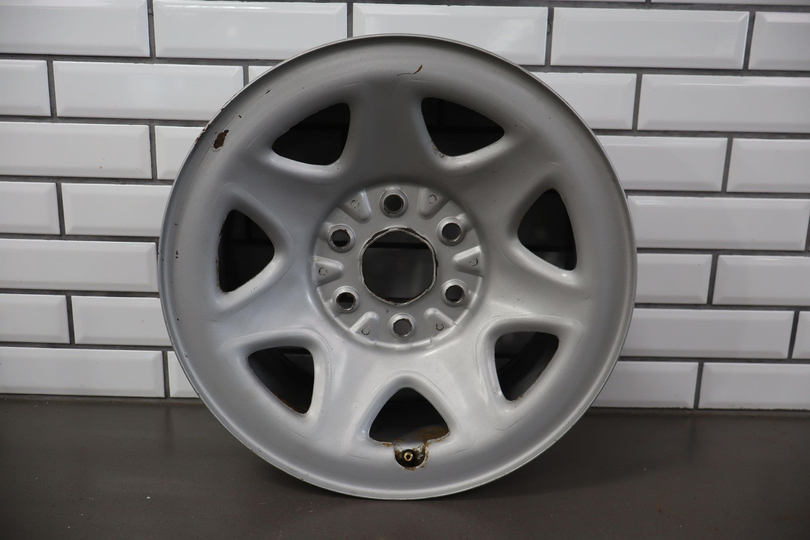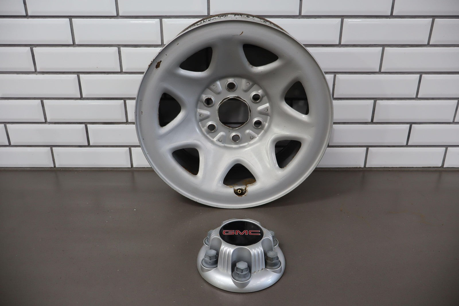 Rh Rear, 17x8 7 Spoke Painted Steel Wheel (opt Rd6), Includes Gmc Center Cap, Decent Surface Rust In Spots-in Barrel, Spun True