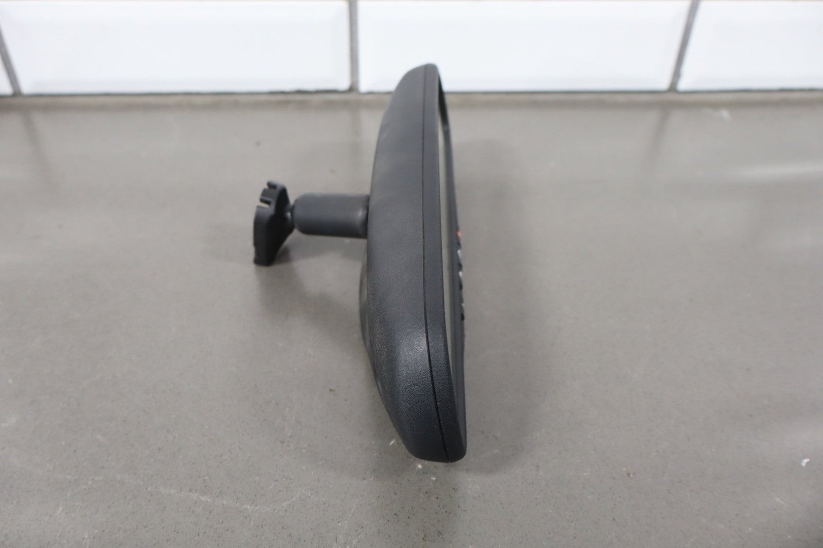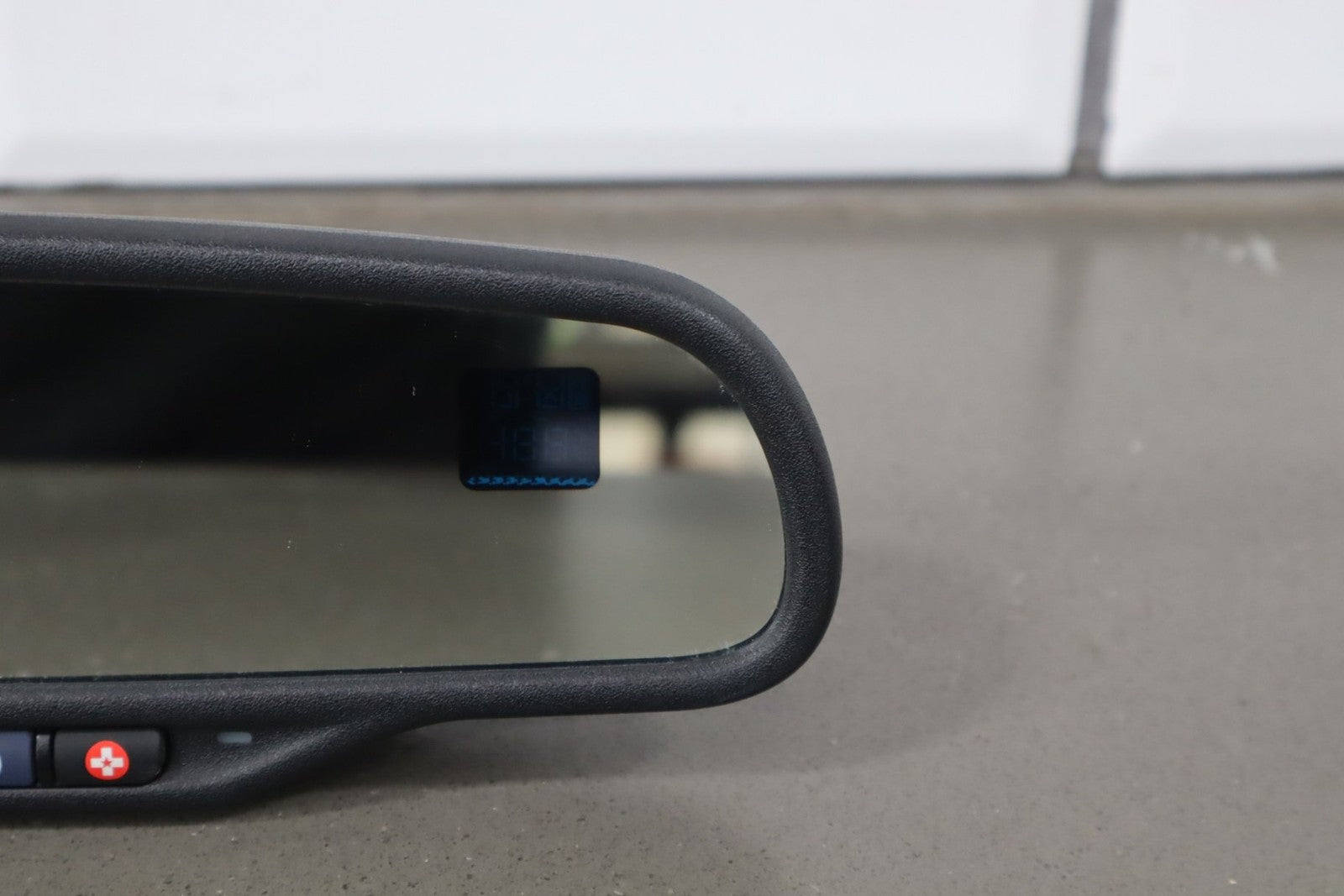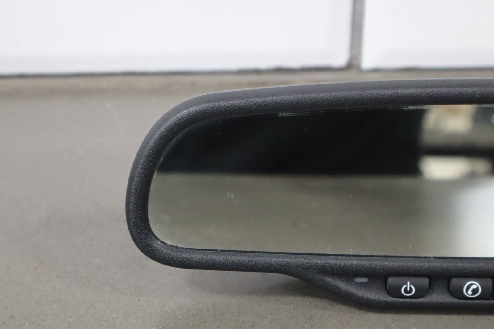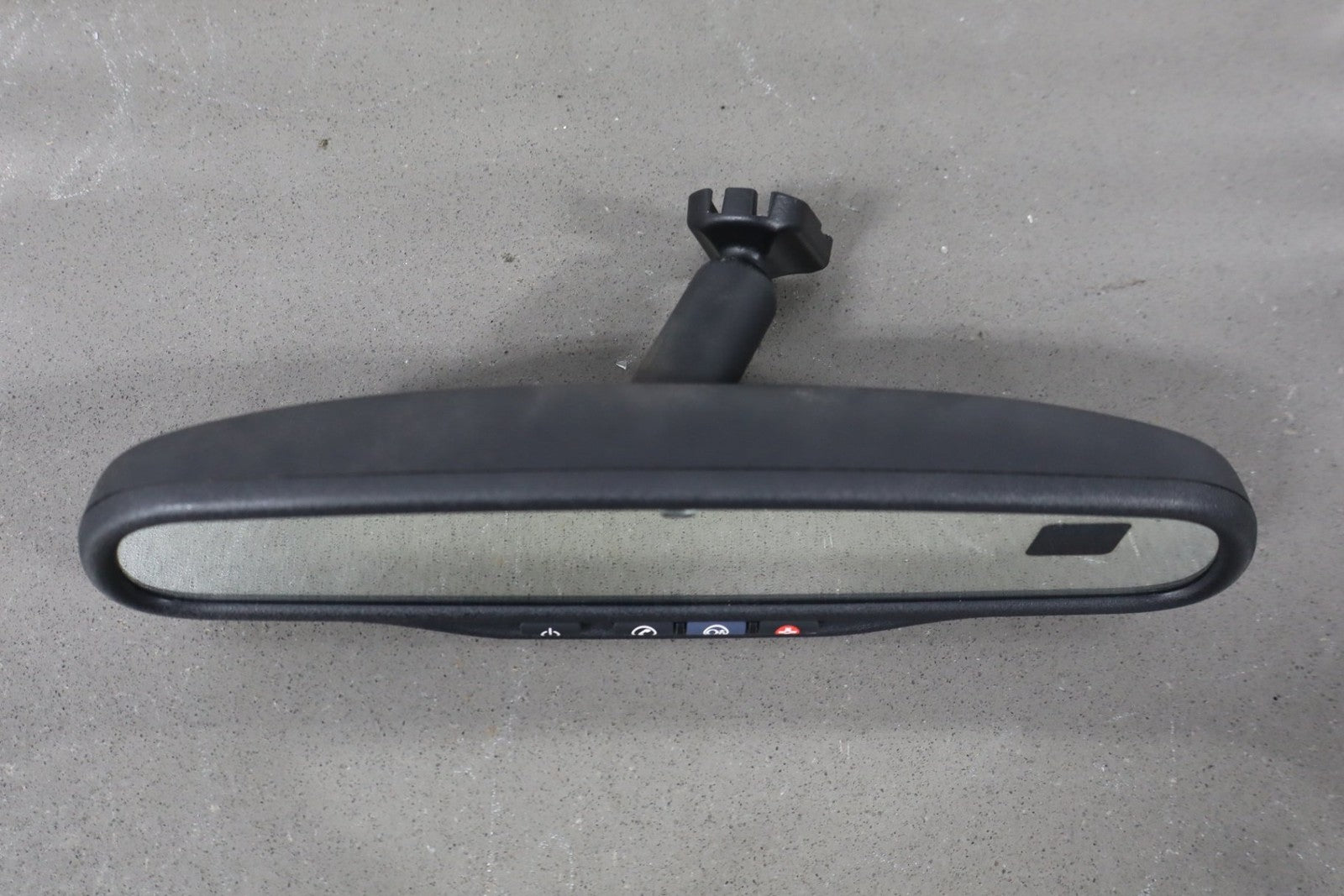 automatic dimming mirror, black textured plastic frame, clean lettering, clear glass, functions properly