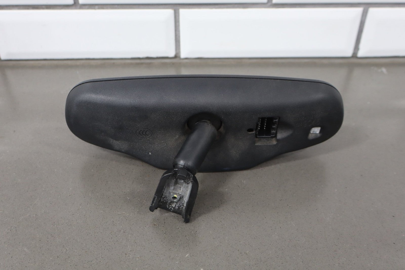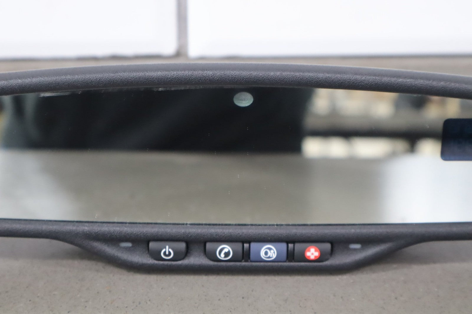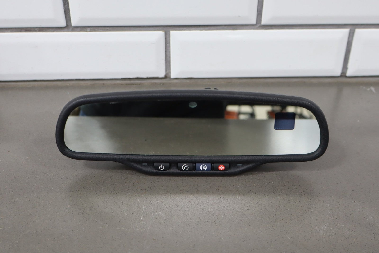 automatic dimming mirror, black textured plastic frame, clean lettering, clear glass, functions properly