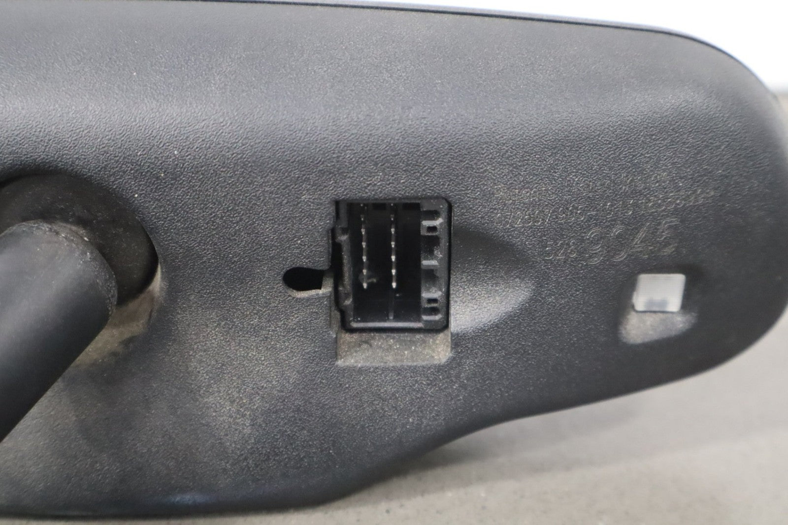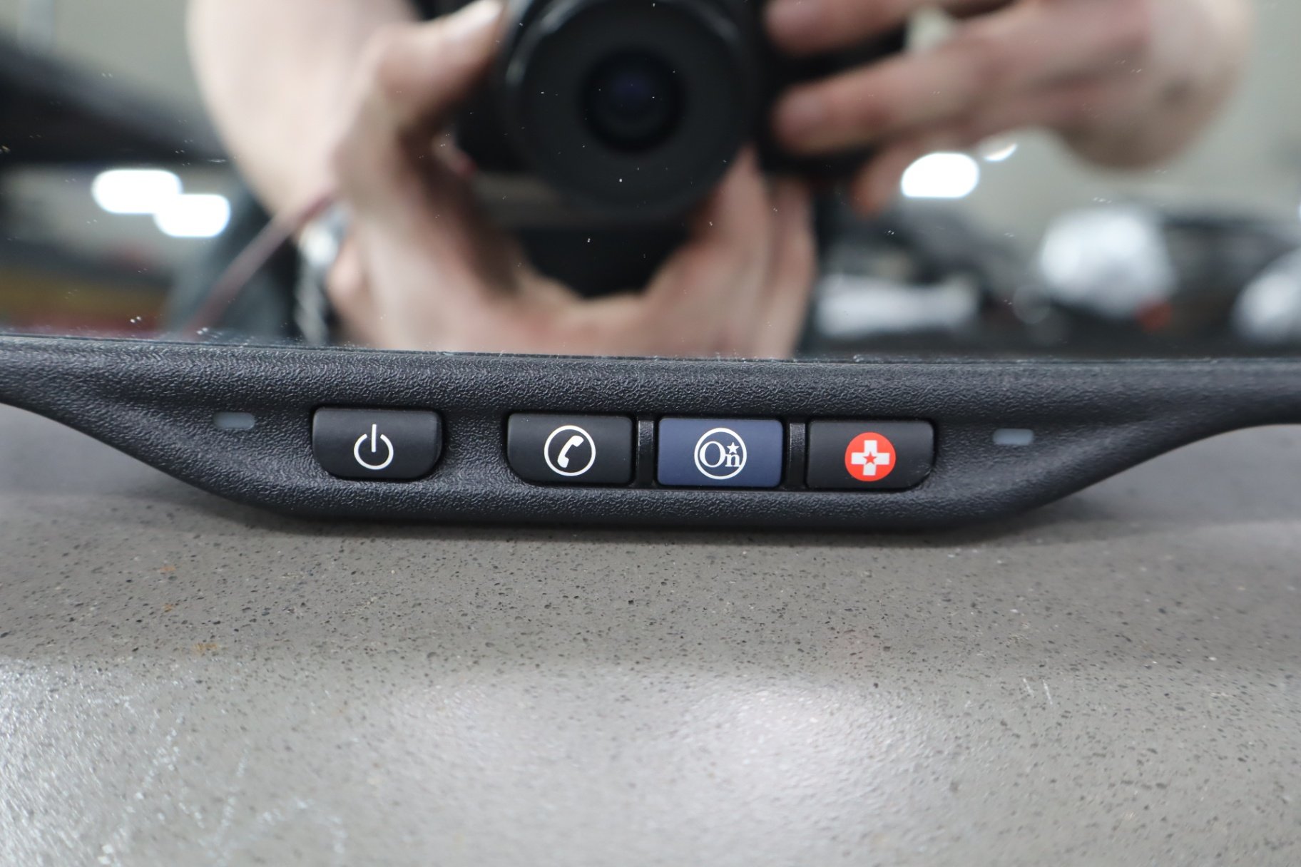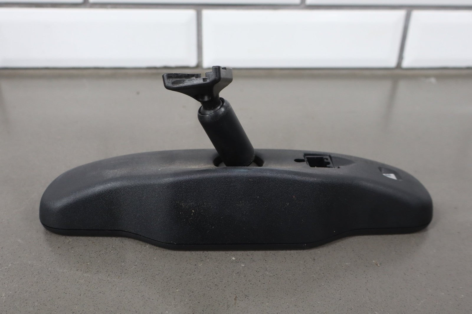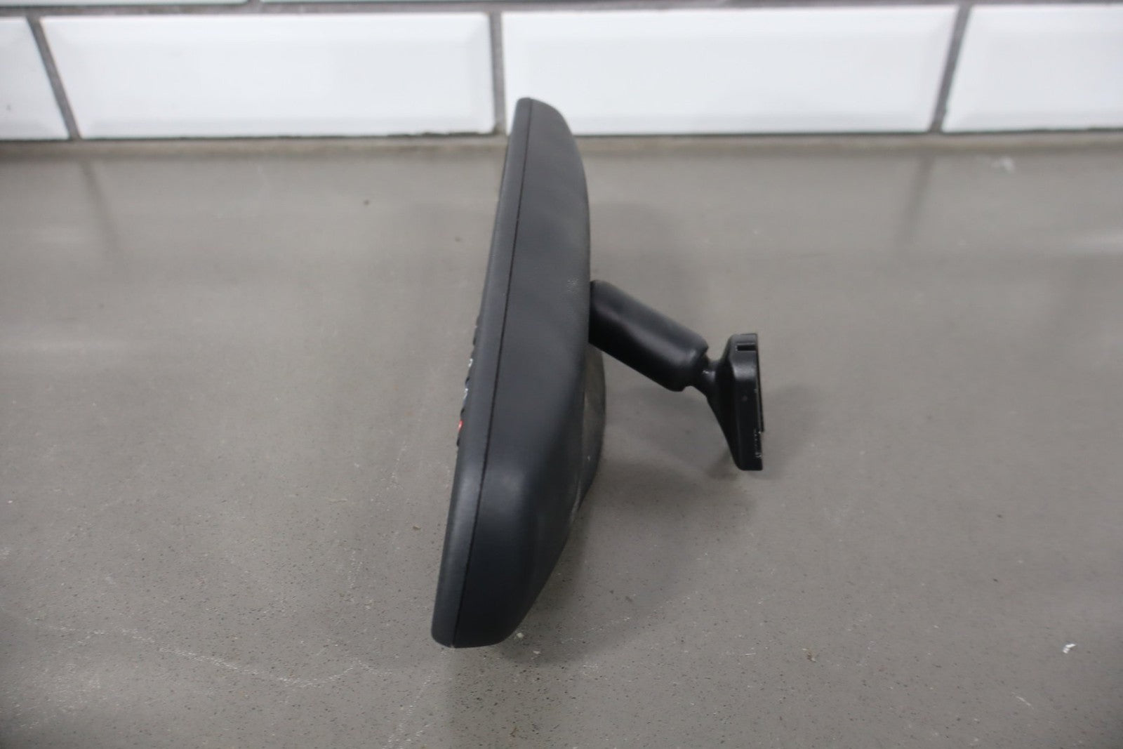 automatic dimming mirror, black textured plastic frame, clean lettering, clear glass, functions properly