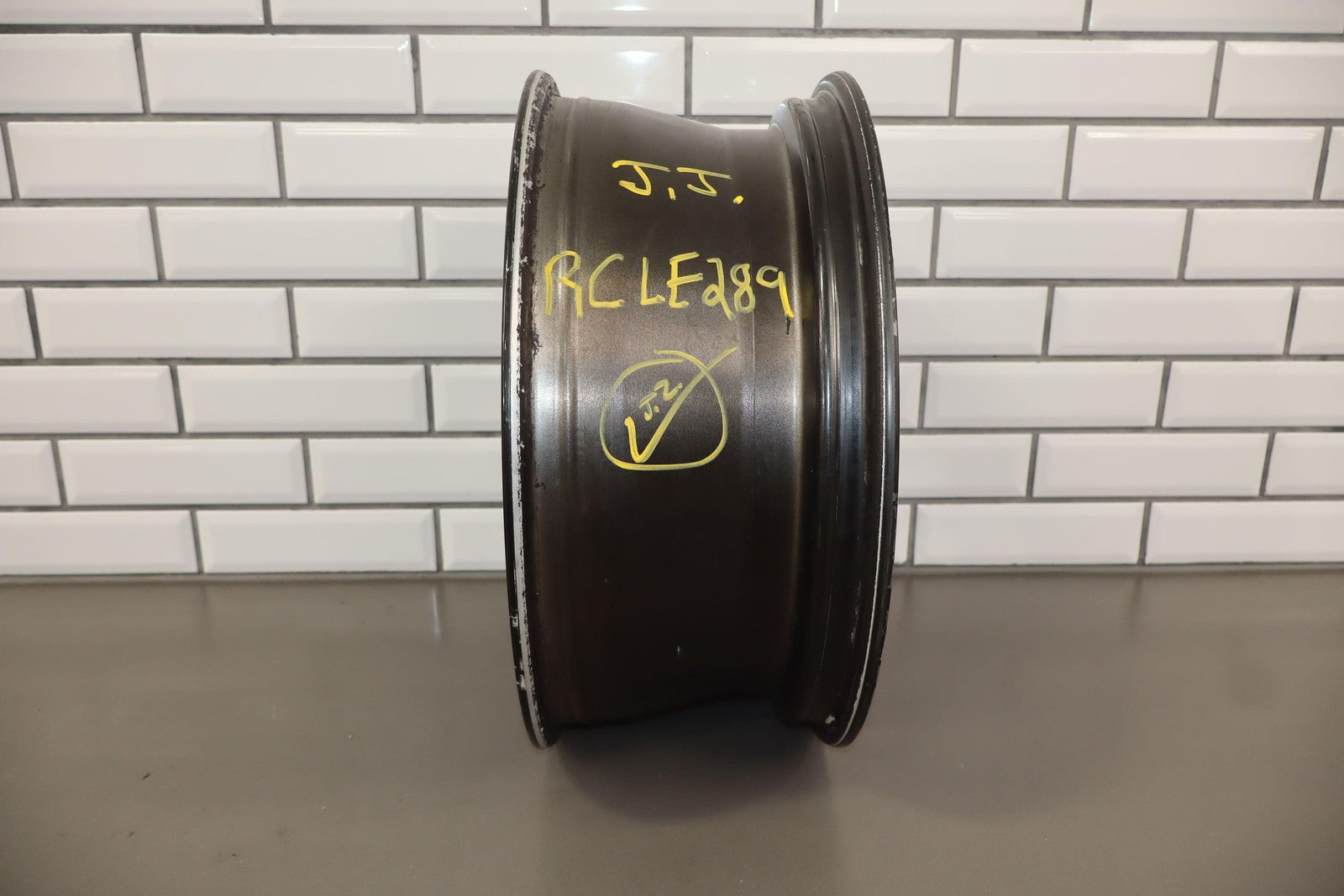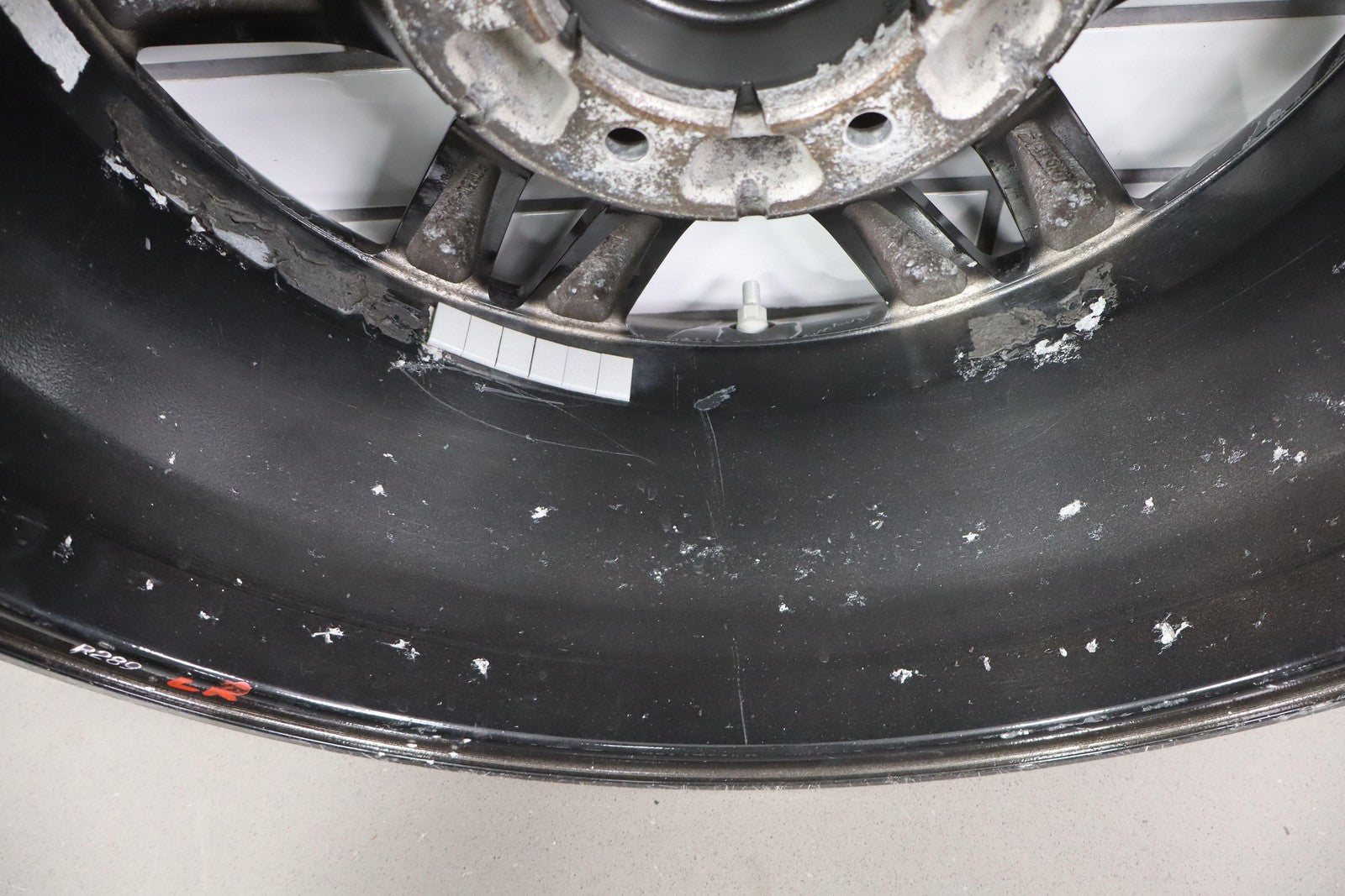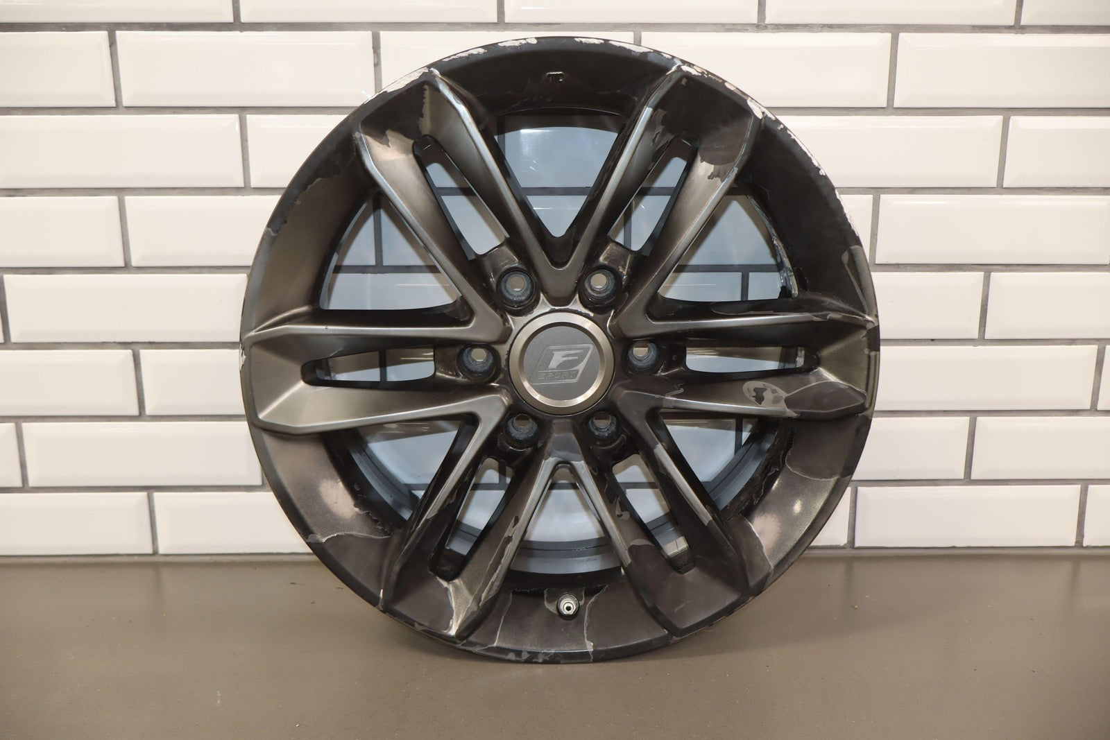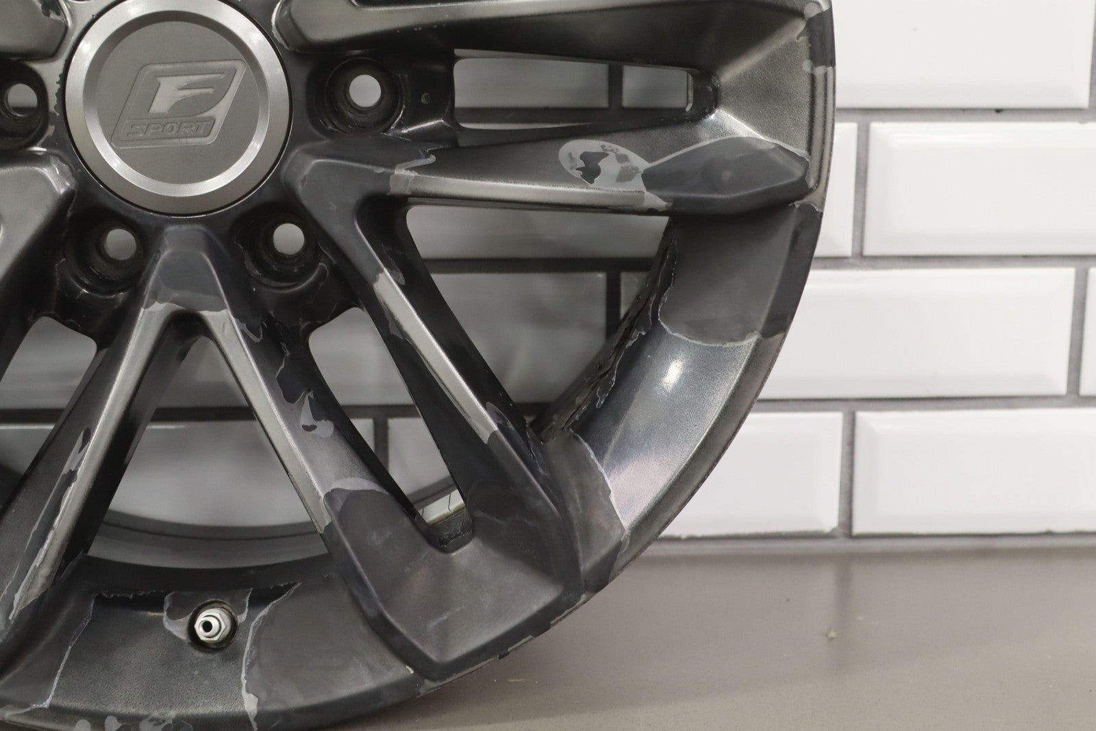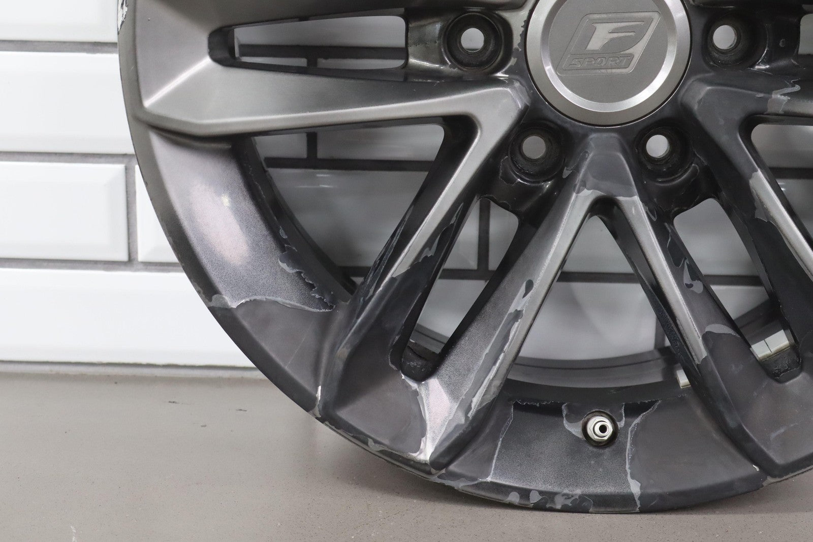 Lh Rear, 18x7.5 Split 6 Spoke Wheel, Gunmetal, Some Curb Rash, Heavy Finish Peel, Spun True