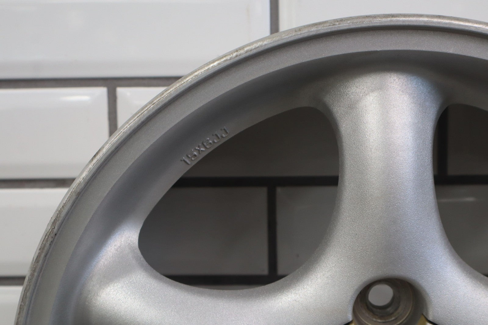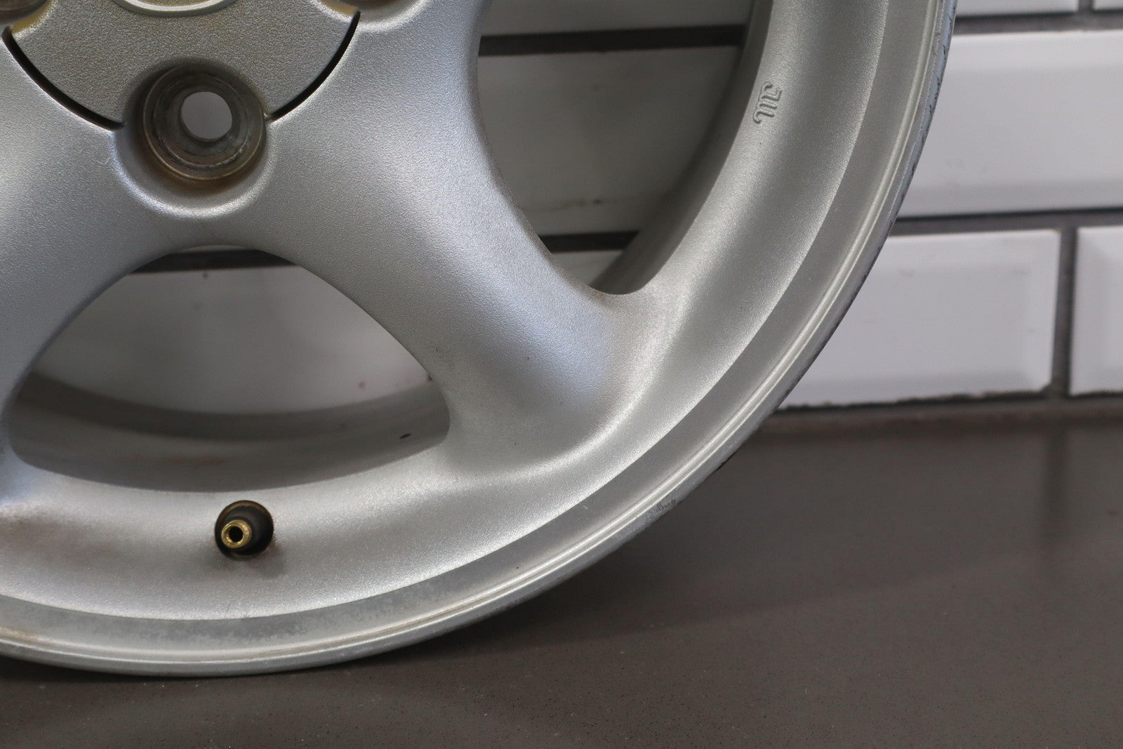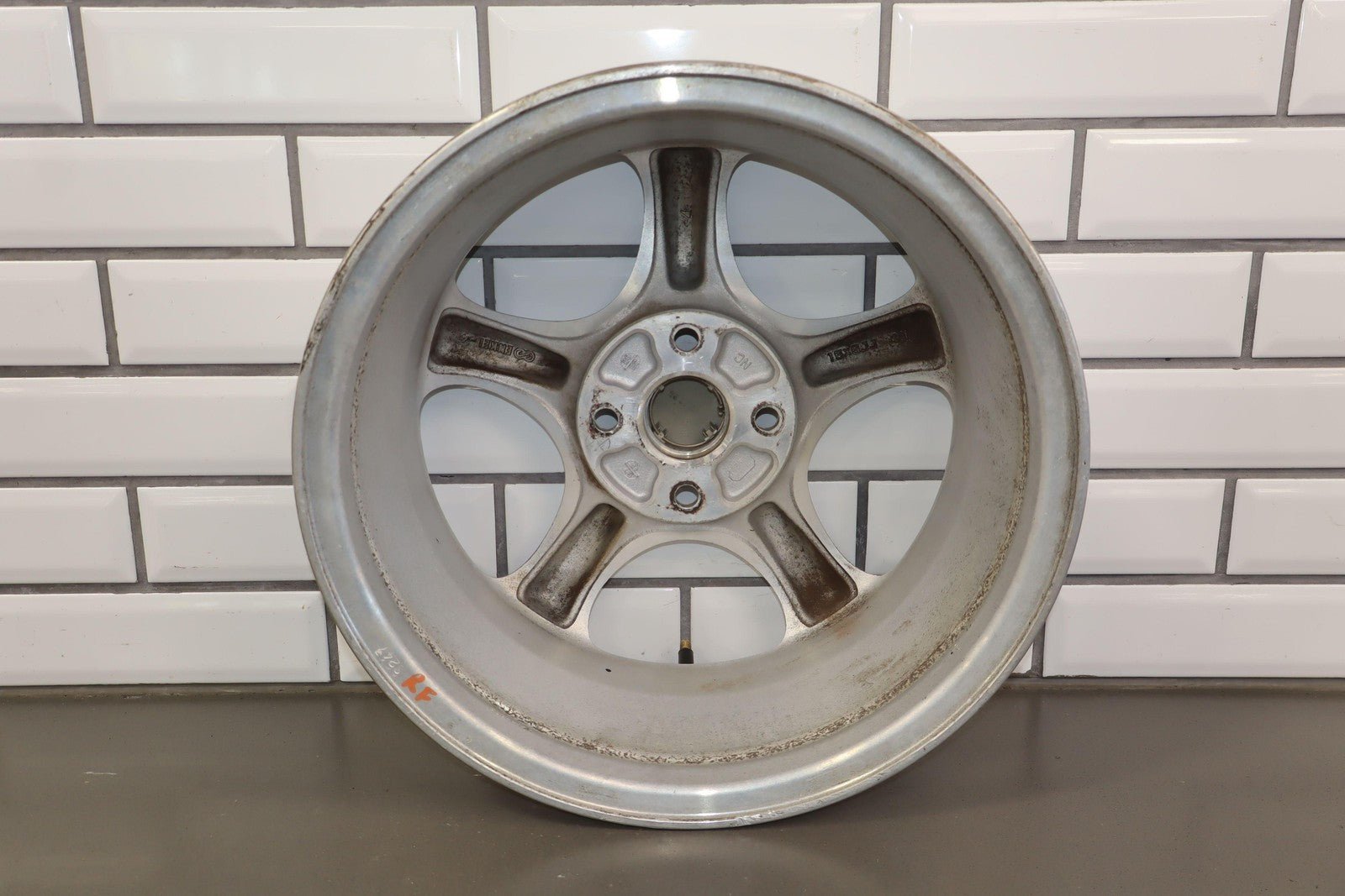 Rh Front, 15x6 Silver 5 Spoke Wheel, Decent Fade Throughout, Minor Curb Rash, Spun True