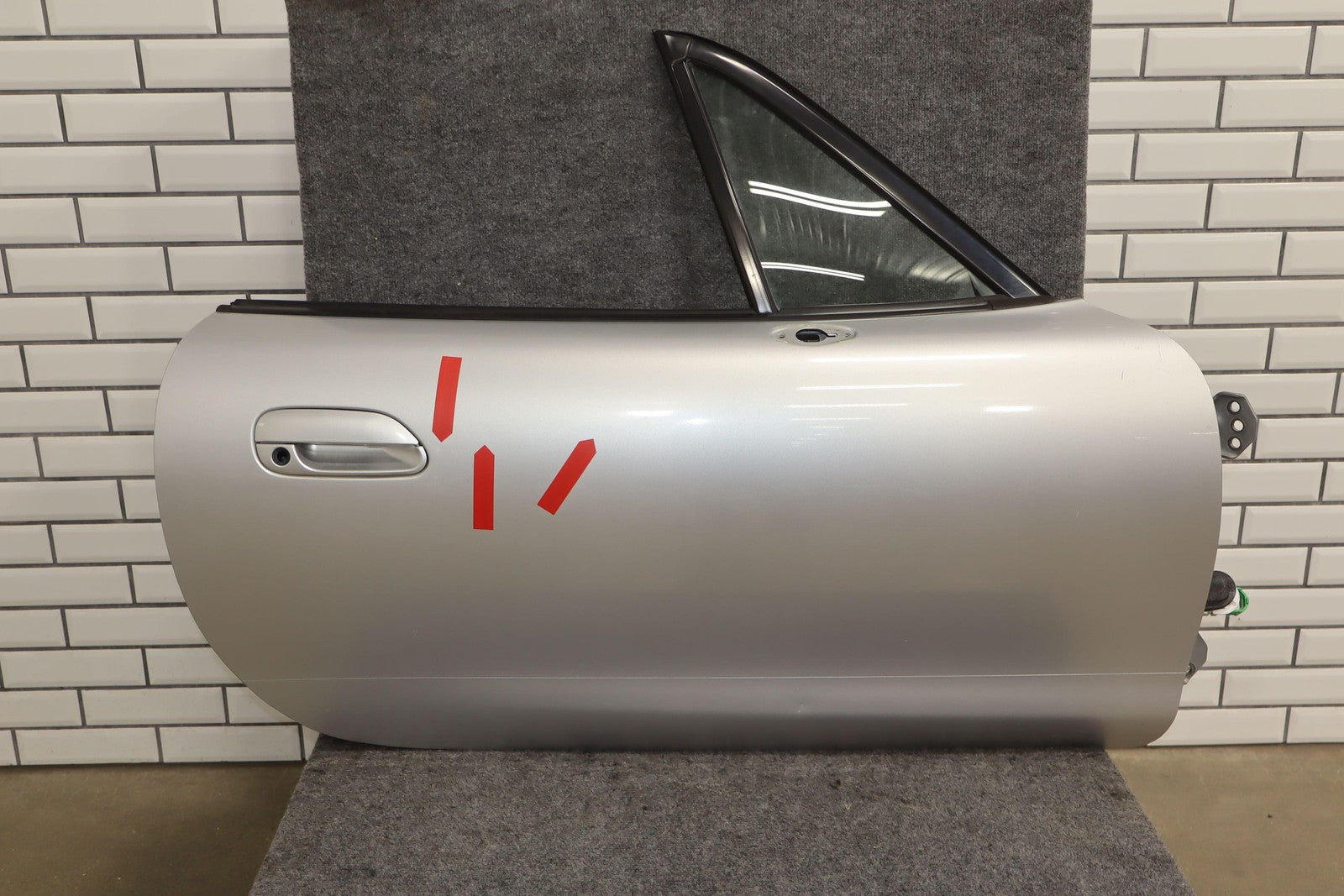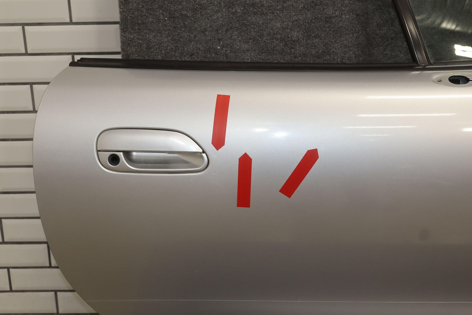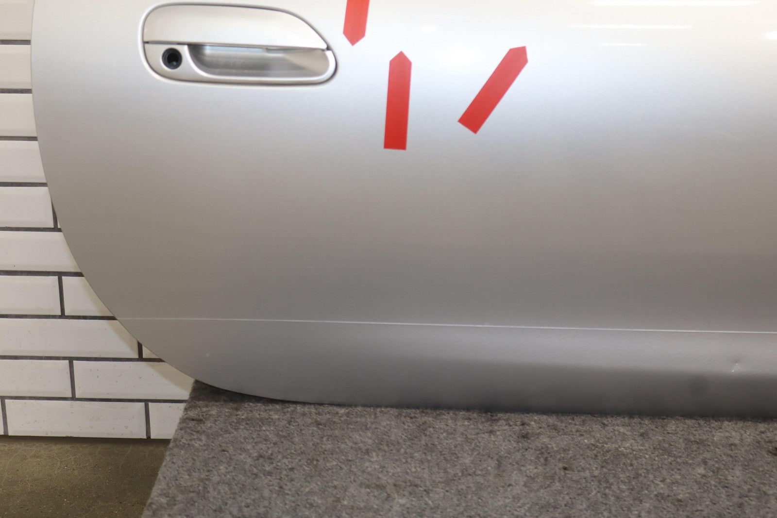 Rh Door Shell, Sunlight Silver Metallic (22v), Sold Less Mirror-trim Panel-glass-regulator, Small Dents Near Handle (red Arrows)