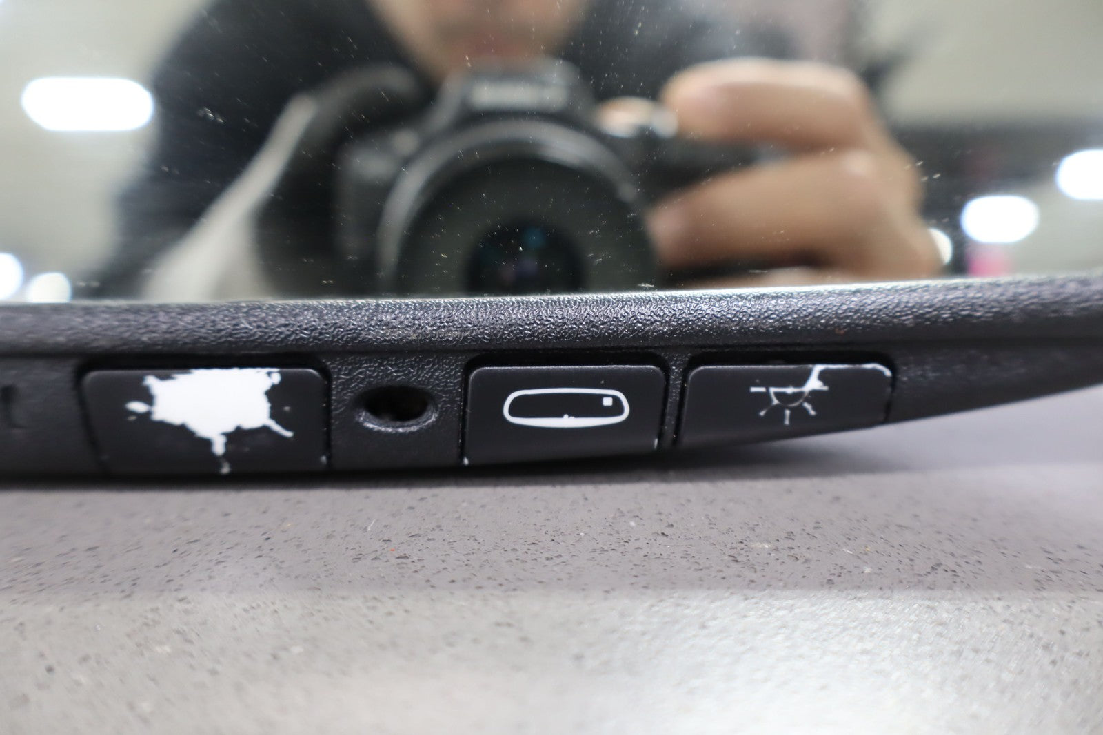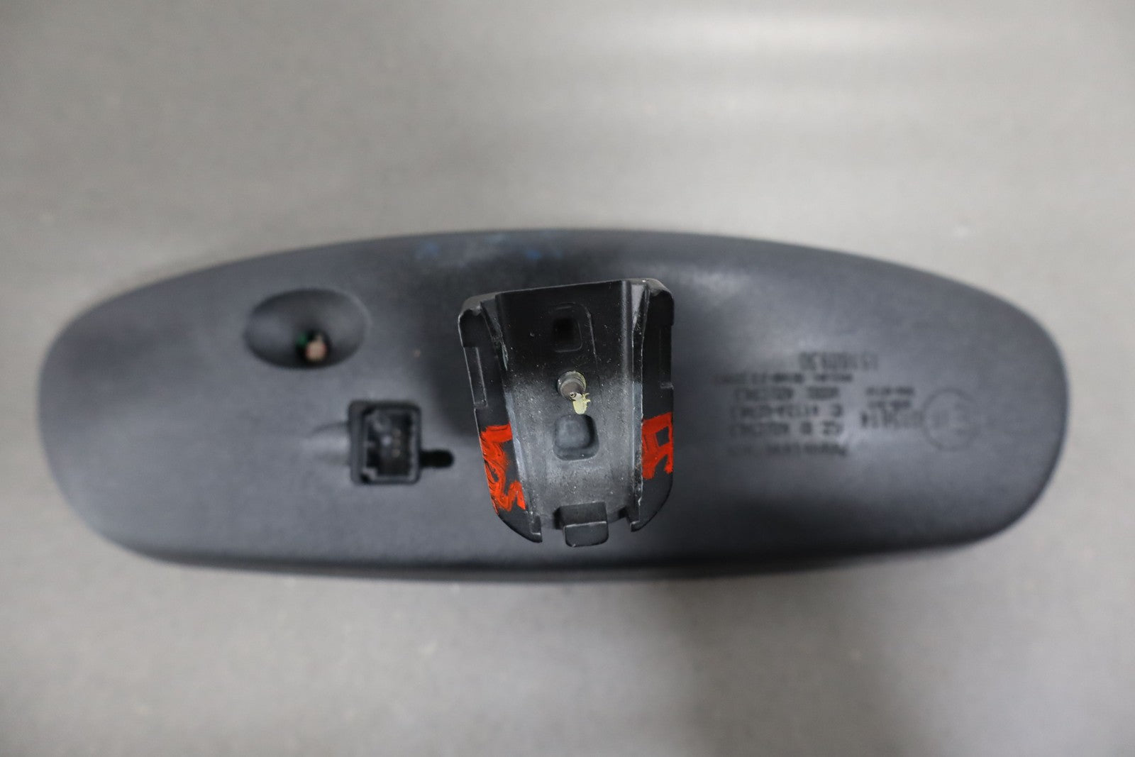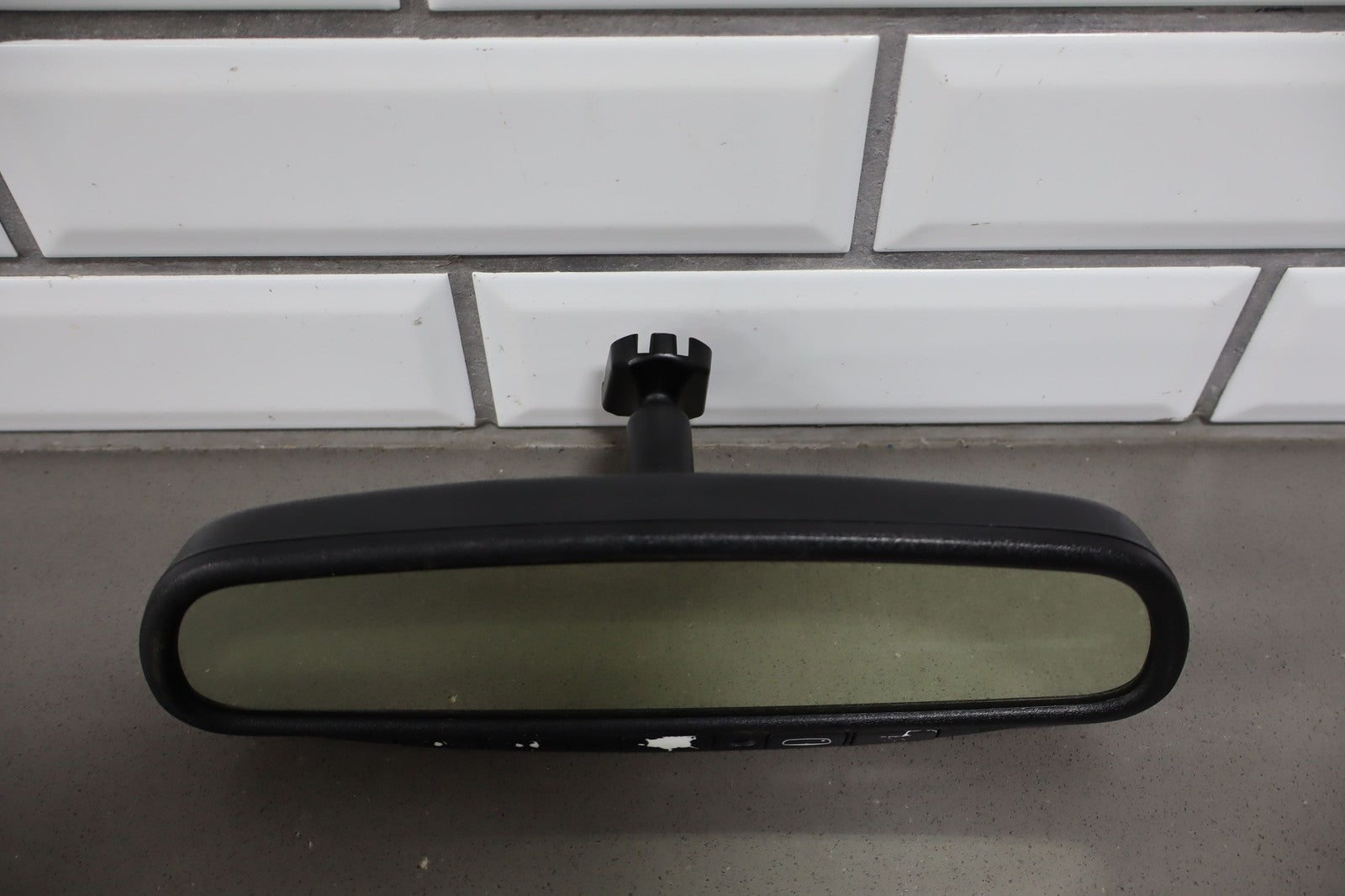Automatic Dimming Mirror, Black Textured Plastic Frame, Clean Glass, Worn Lettering, Functions Properly