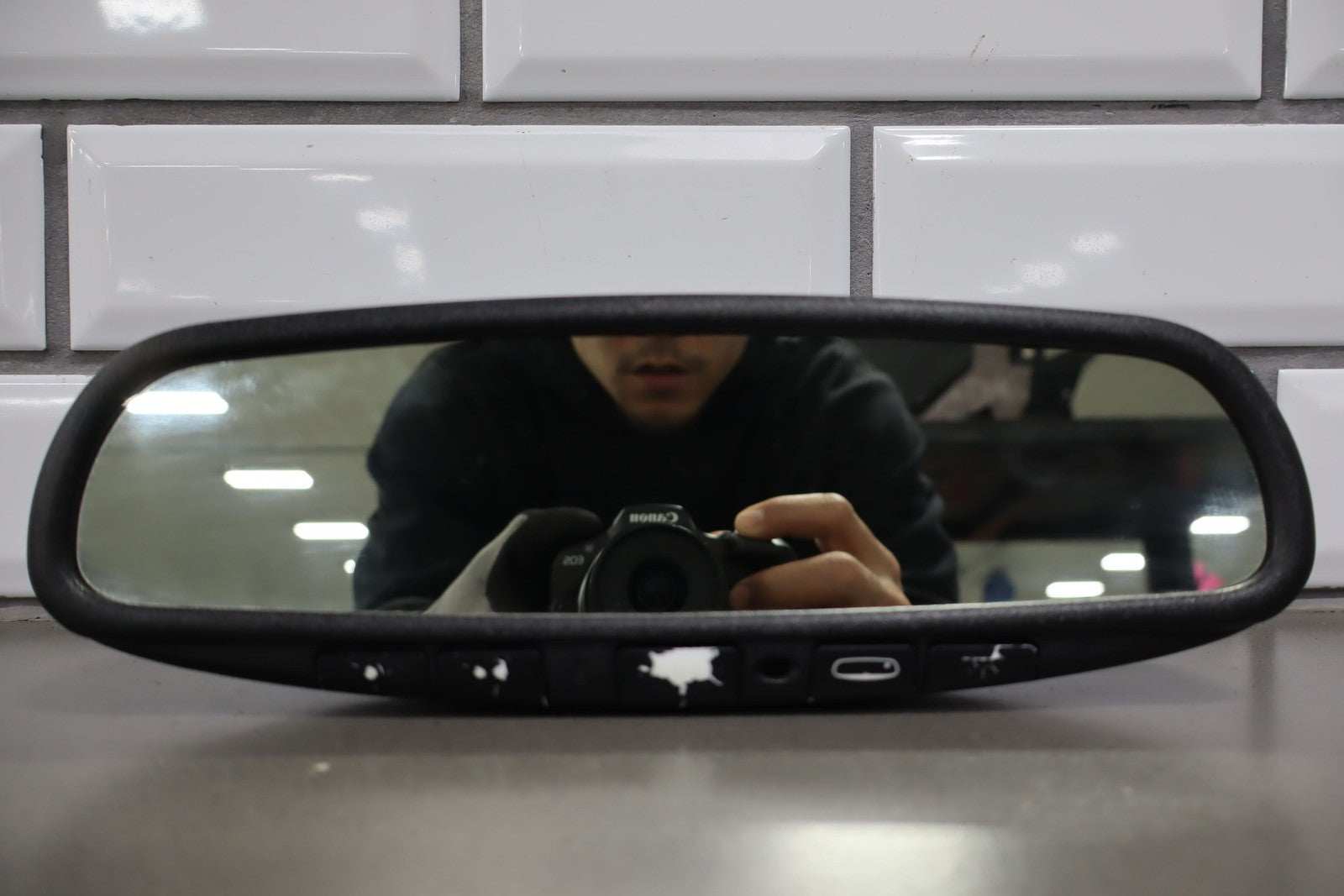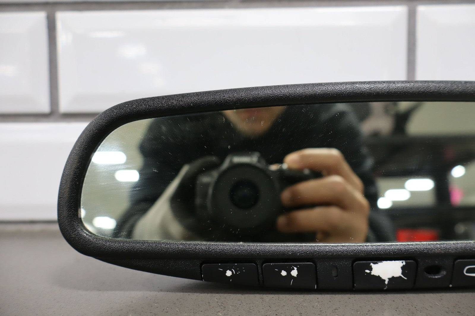 Important notes: Automatic Dimming Mirror, Black Textured Plastic Frame, Clean Glass, Worn Lettering, Functions Properly