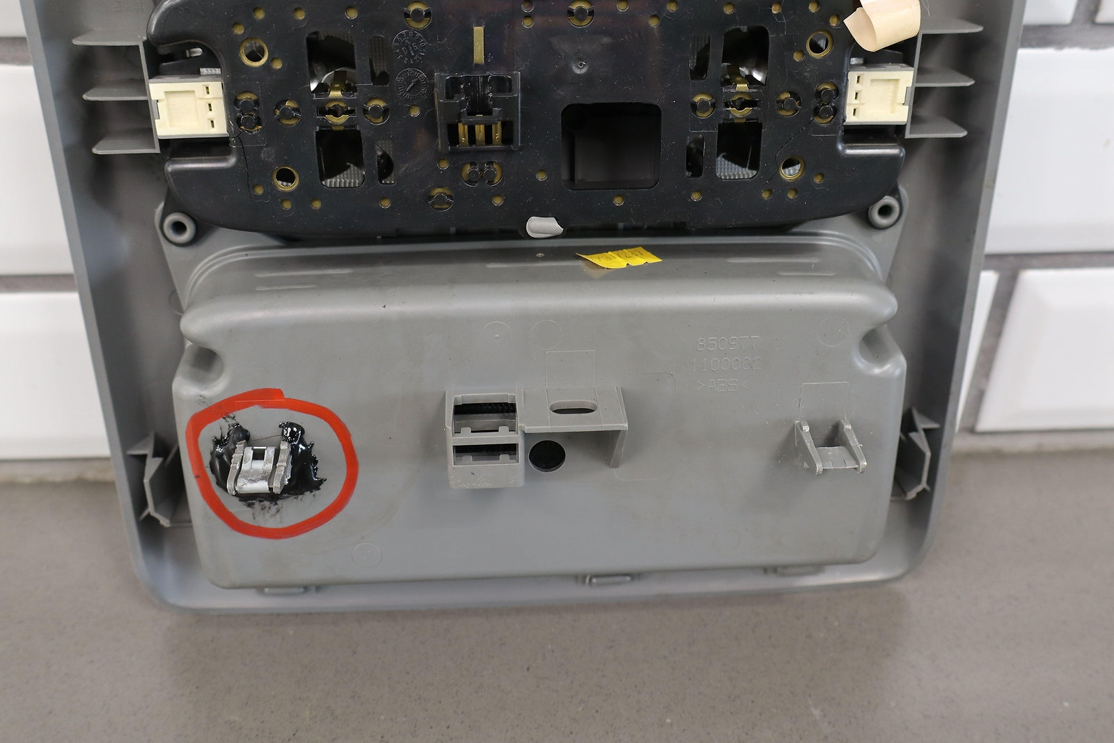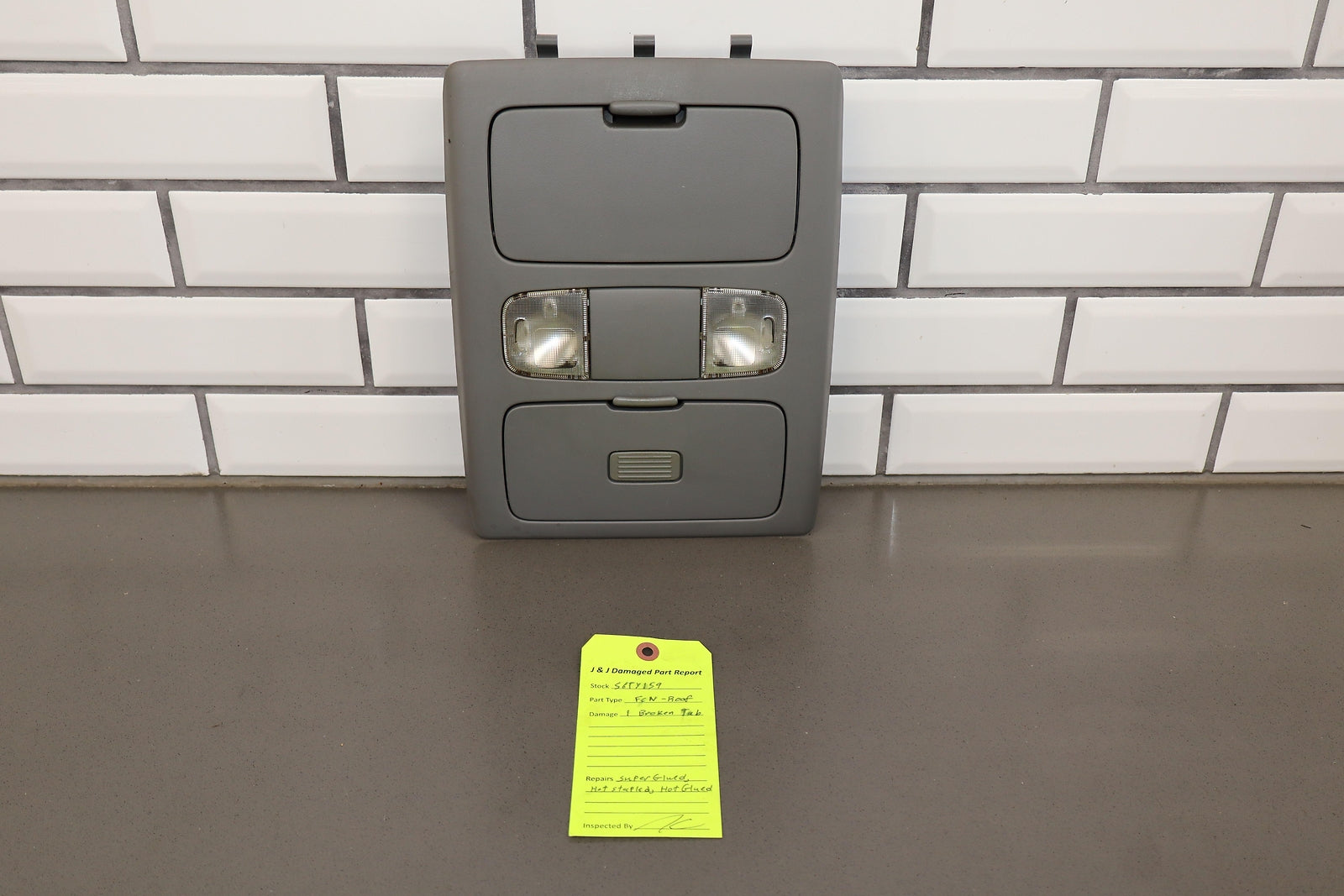 Important notes: Roof Console, Crew Cab, Graphite (13), Both Doors Function Properly, 1 Repaired Tab (marked Red)