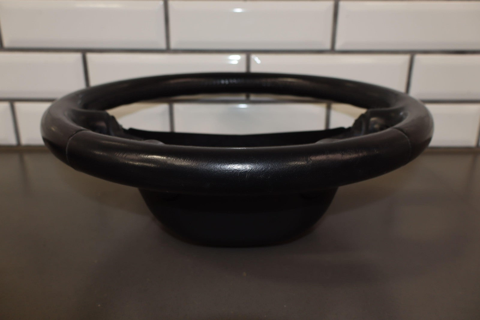 Volante de cuero negro, desgaste regular, múltiples rayones