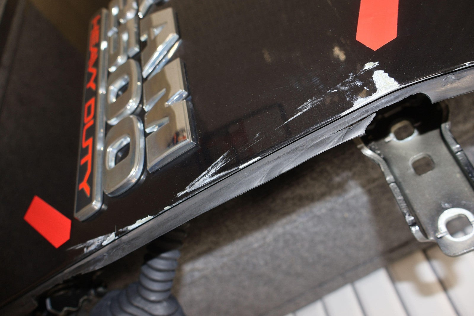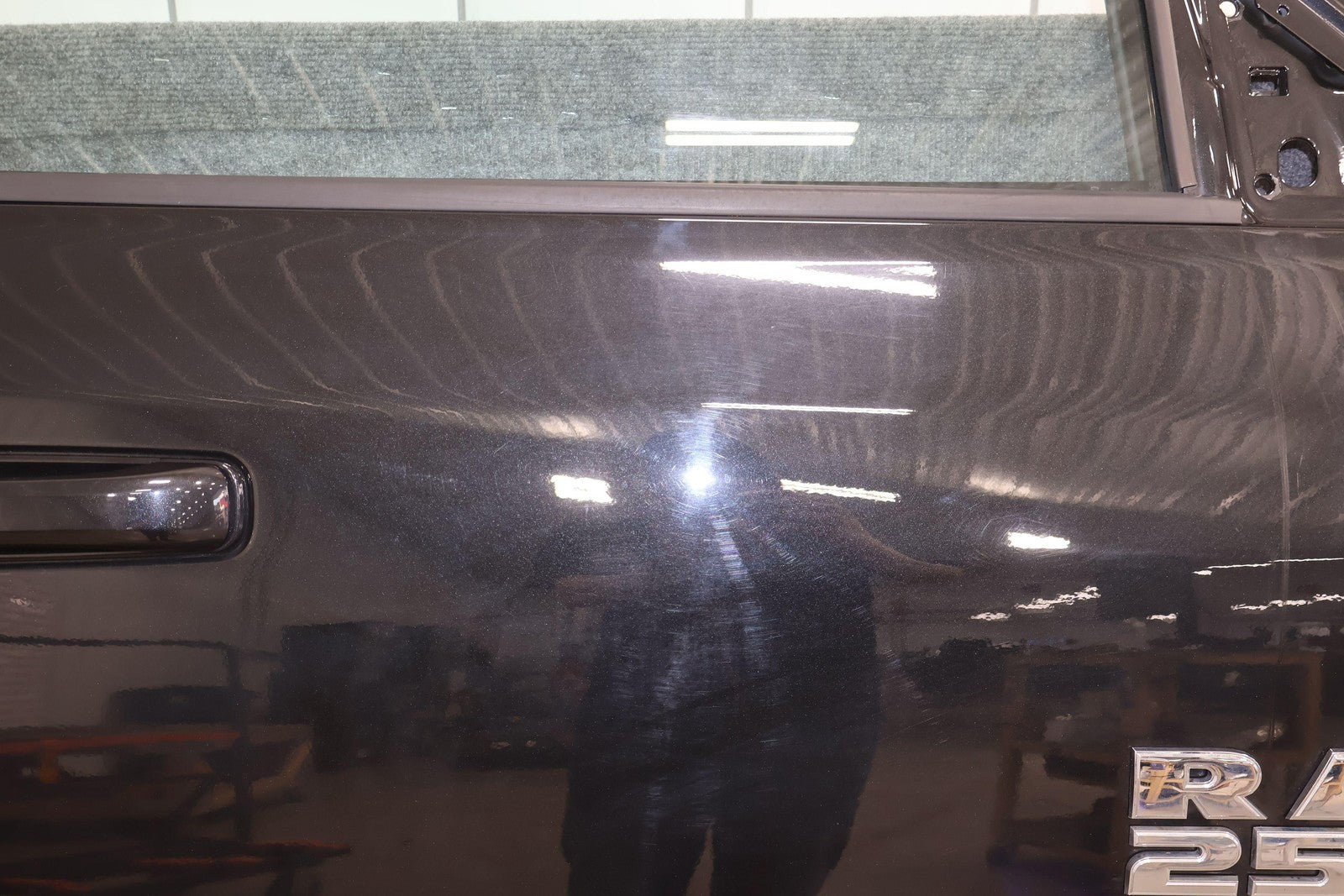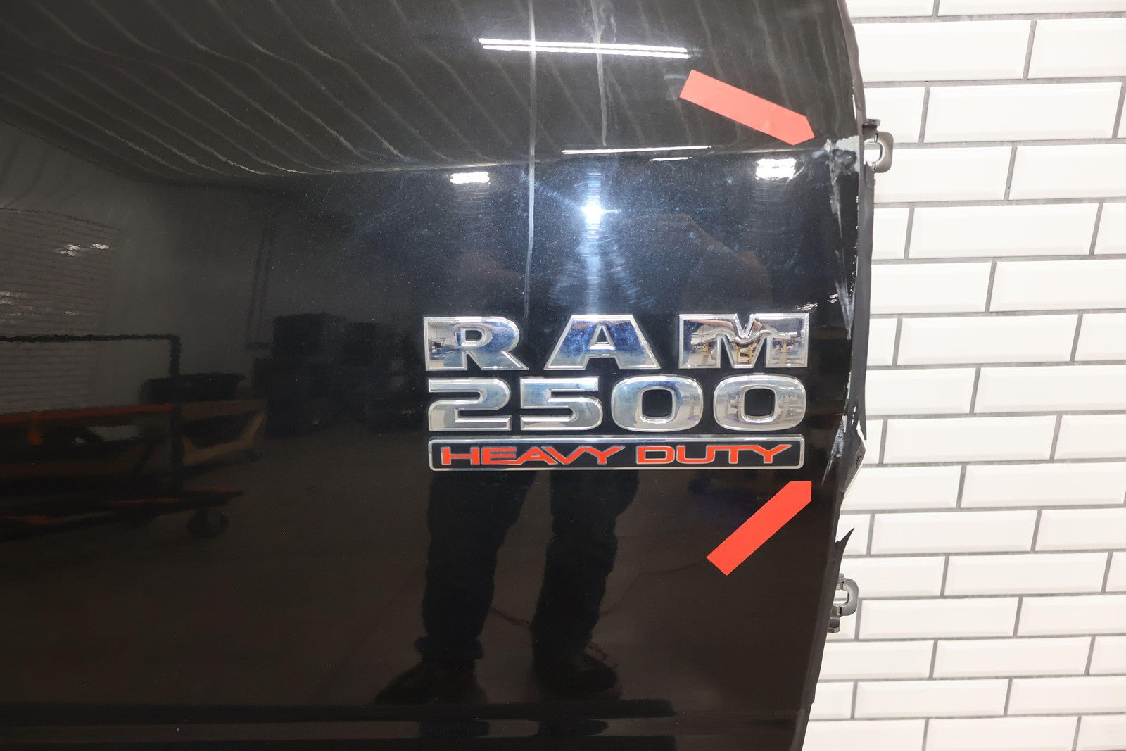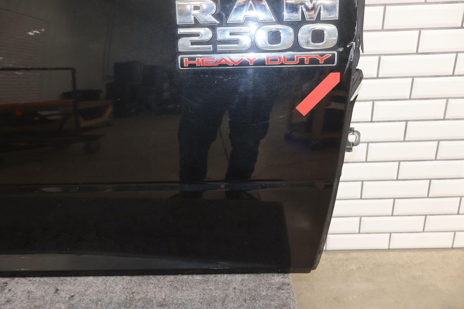 Delantero derecho (cabina Mega), negro brillante (PXR), se vende sin el panel de moldura del espejo, daños en el guardabarros hacia el frente (rojo), un par de desconchones de pintura