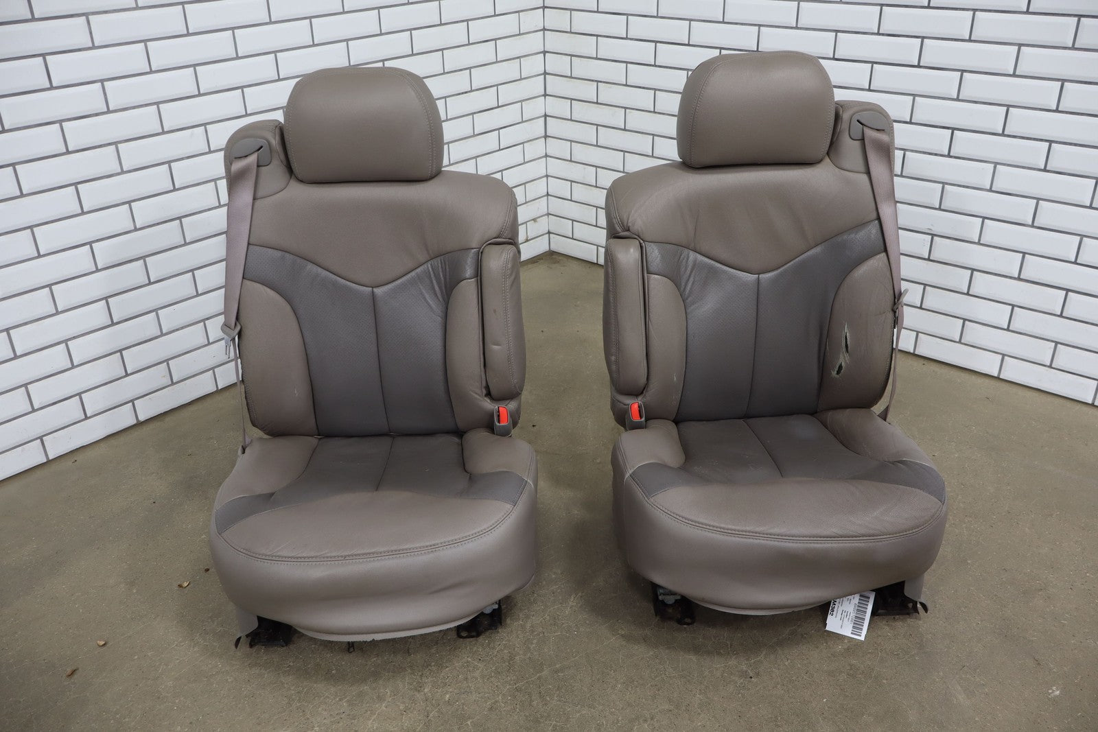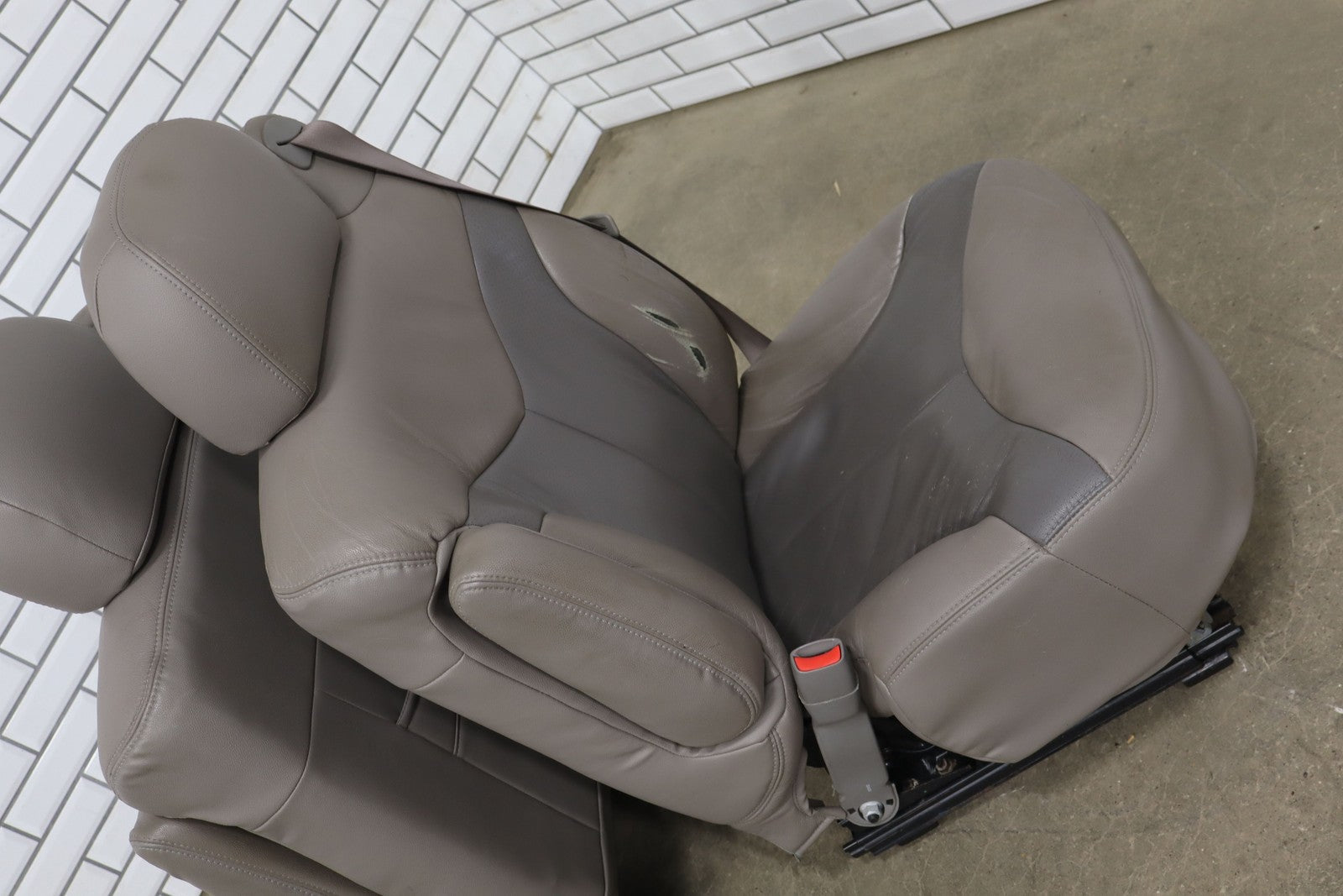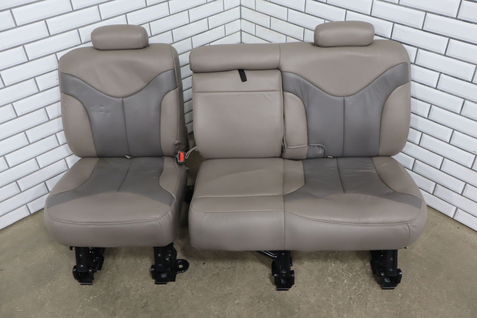 Notas importantes: Juego de asientos de cuero, pizarra/peltre (922), incluye consola, refuerzo izquierdo roto, desgaste considerable, manchas leves, agujeros perforados en la consola
