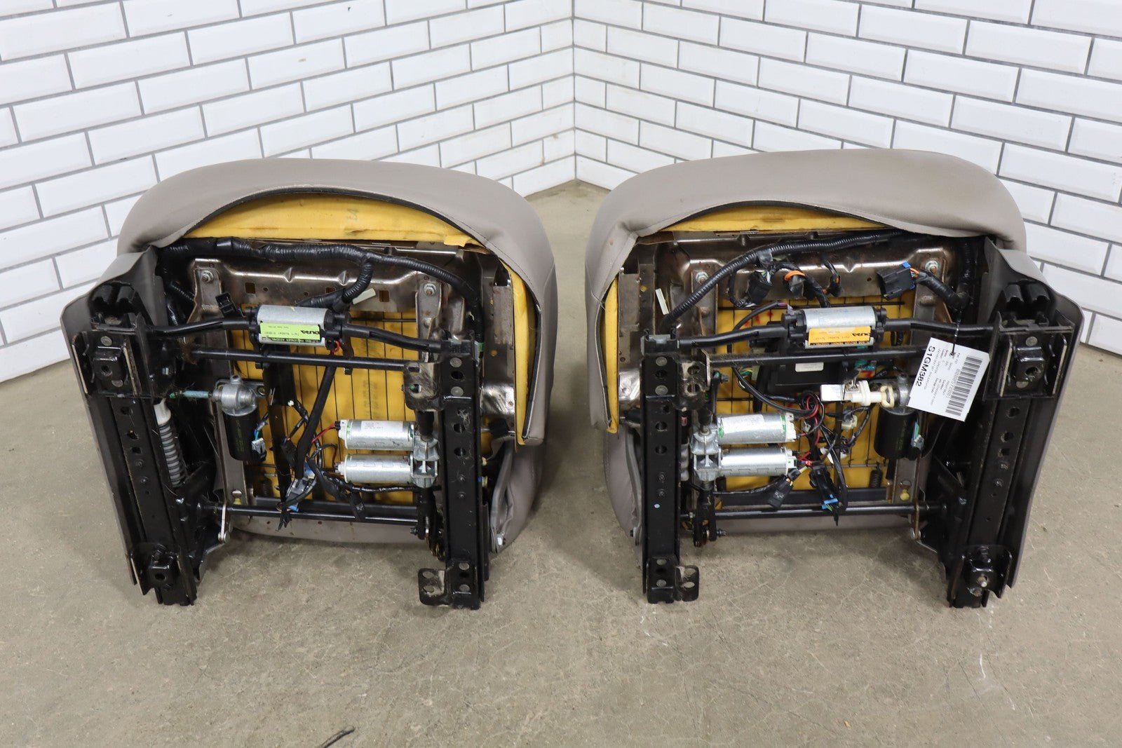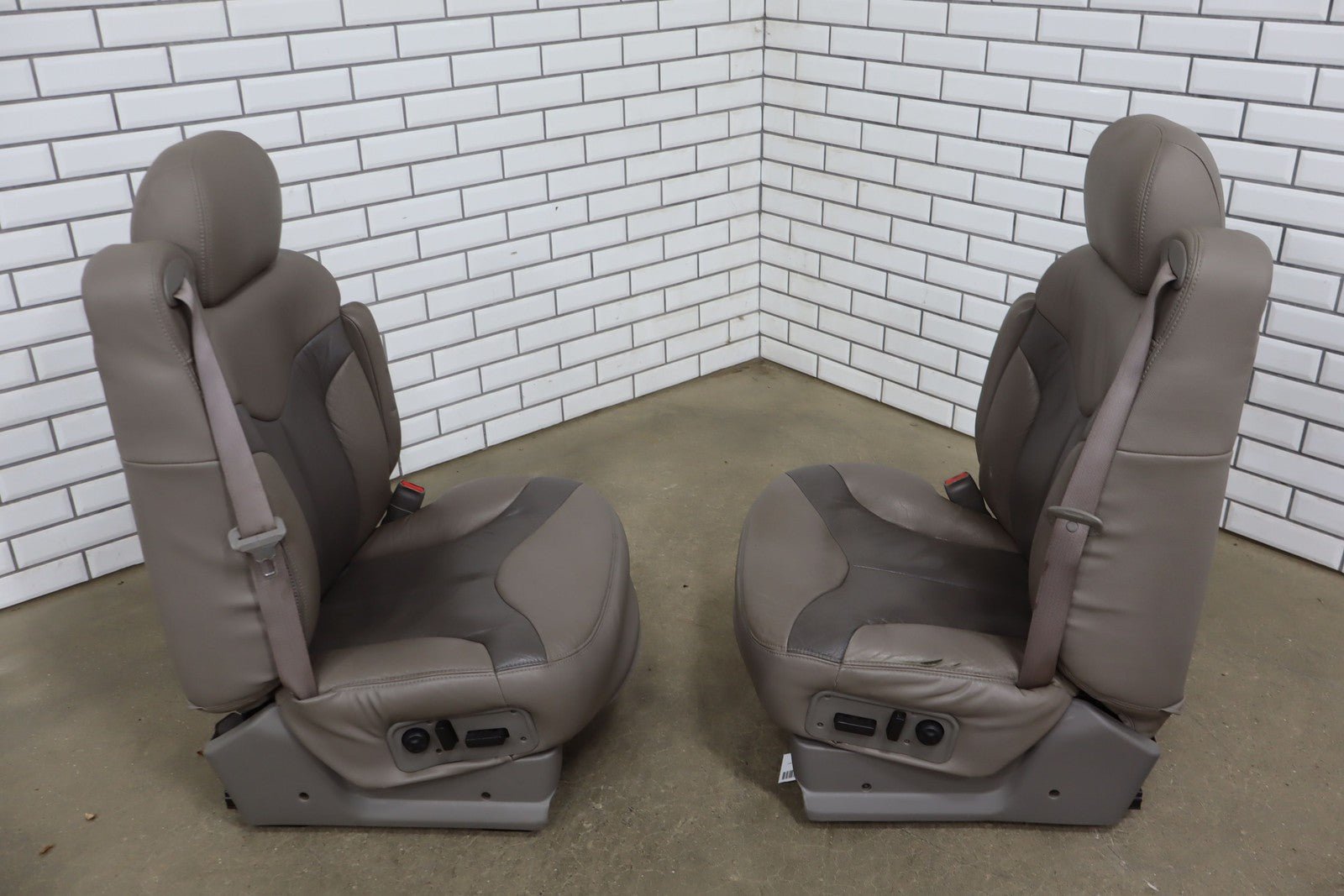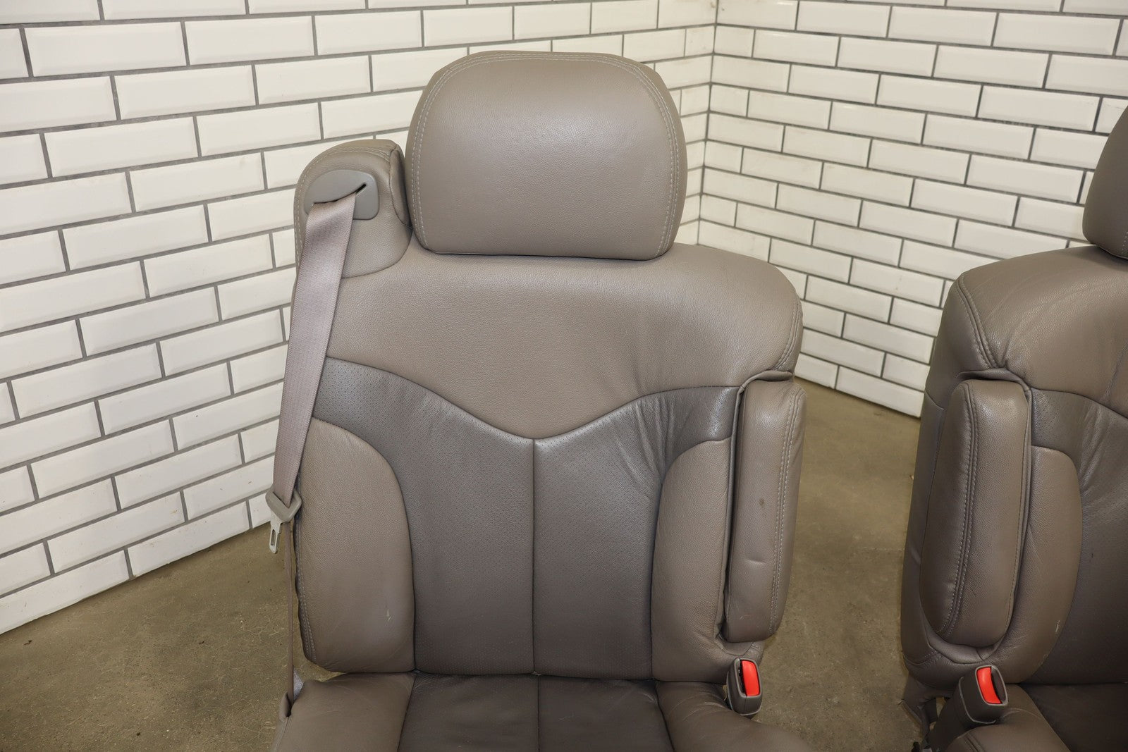Notas importantes: Juego de asientos de cuero, pizarra/peltre (922), incluye consola, refuerzo izquierdo roto, desgaste considerable, manchas leves, agujeros perforados en la consola