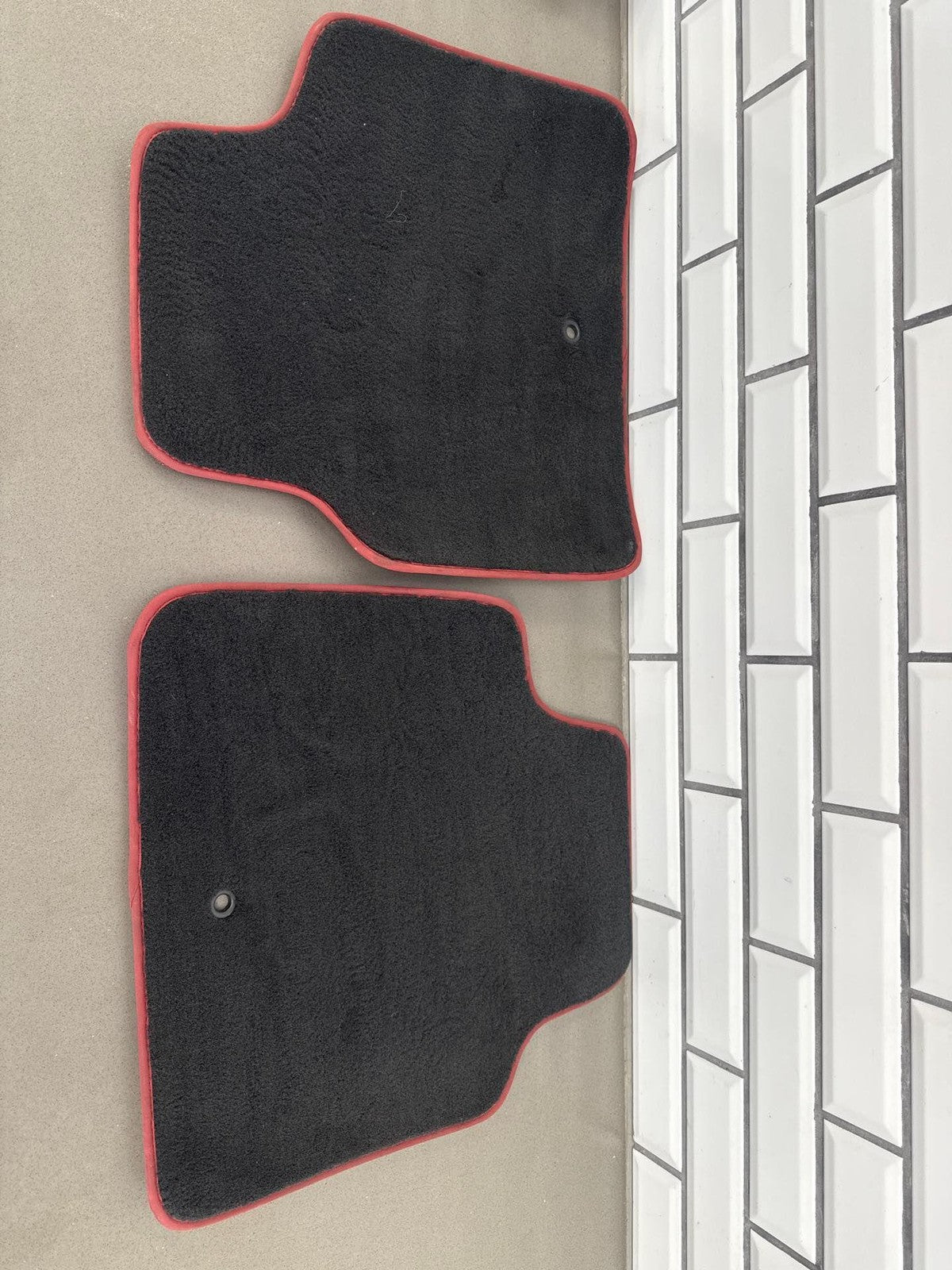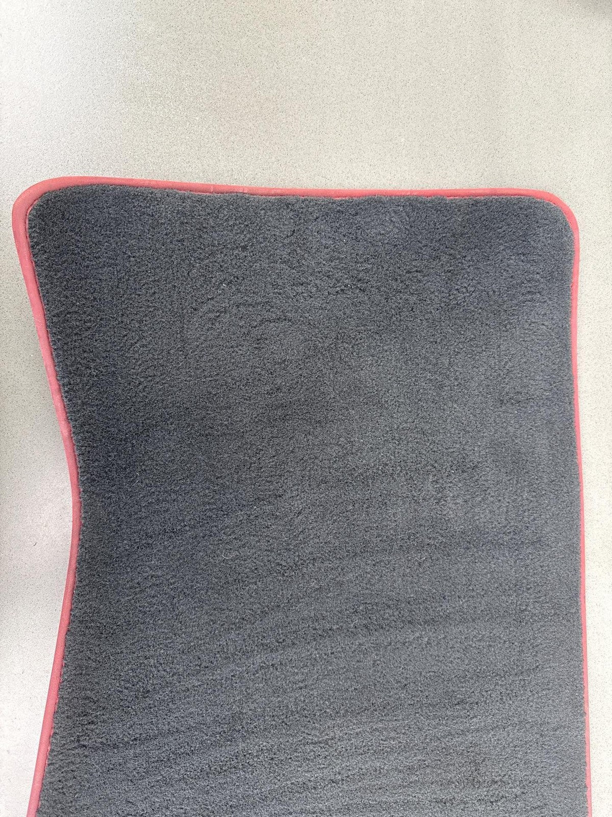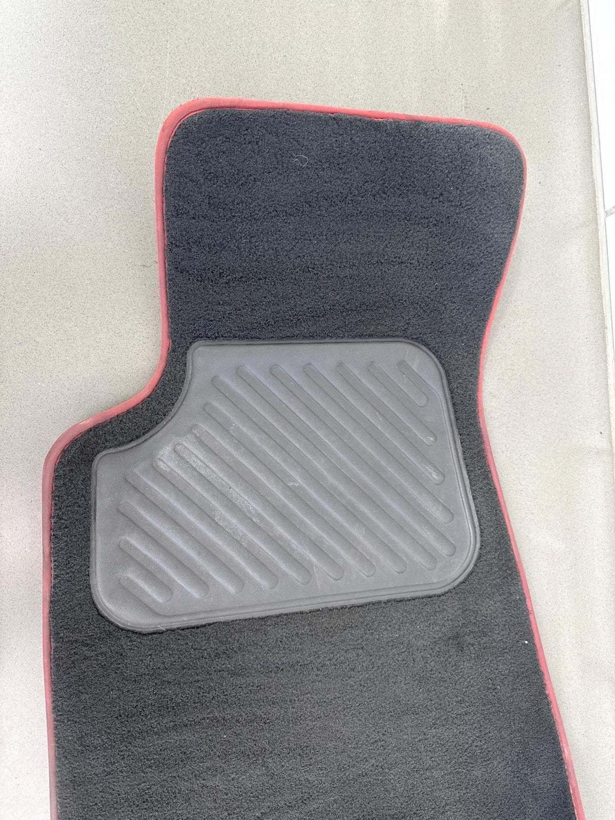 Juego de 4 alfombrillas de moqueta, color negro con ribete rojo, ligeras manchas y ligeros signos de desgaste.