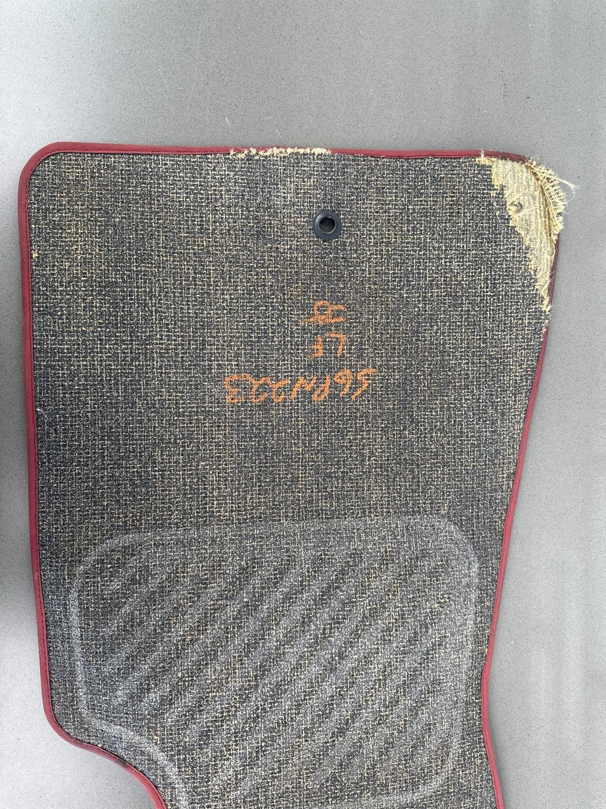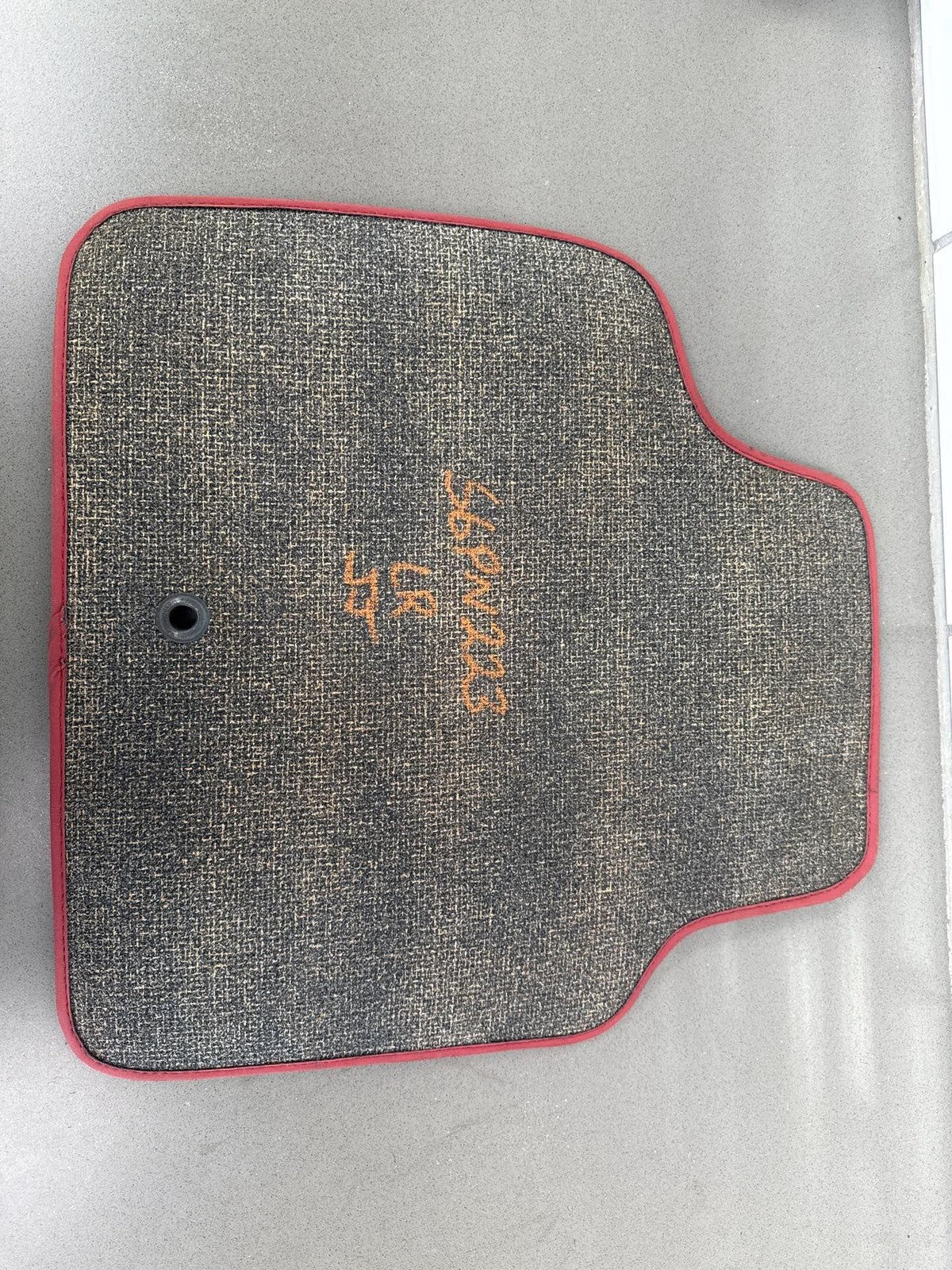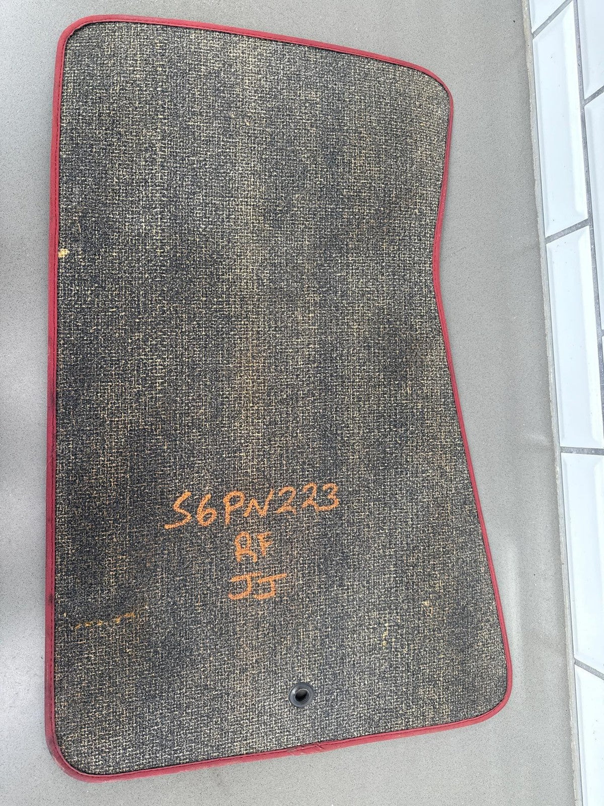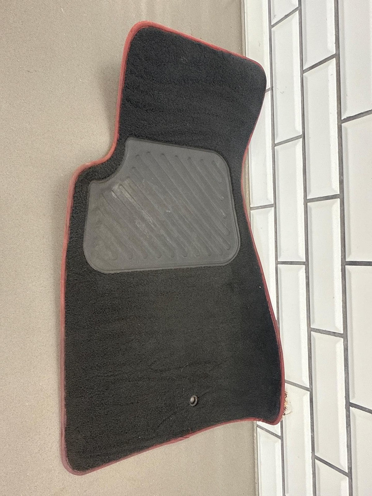 Juego de 4 alfombrillas de moqueta, color negro con ribete rojo, ligeras manchas y ligeros signos de desgaste.