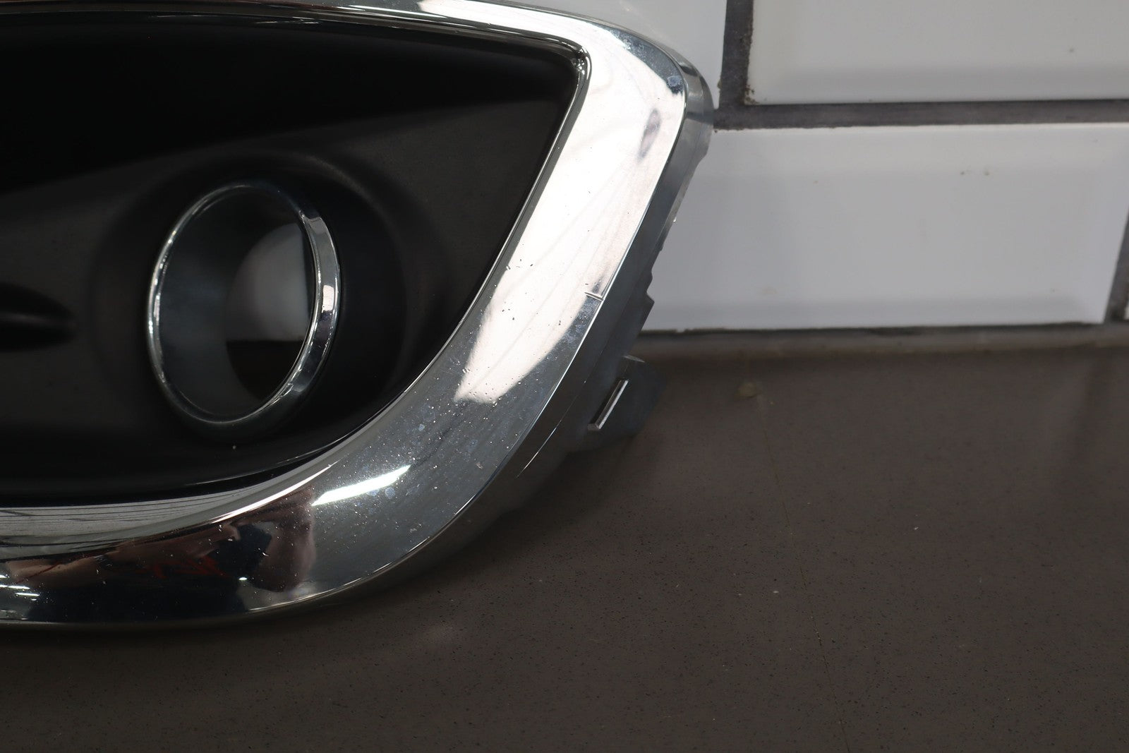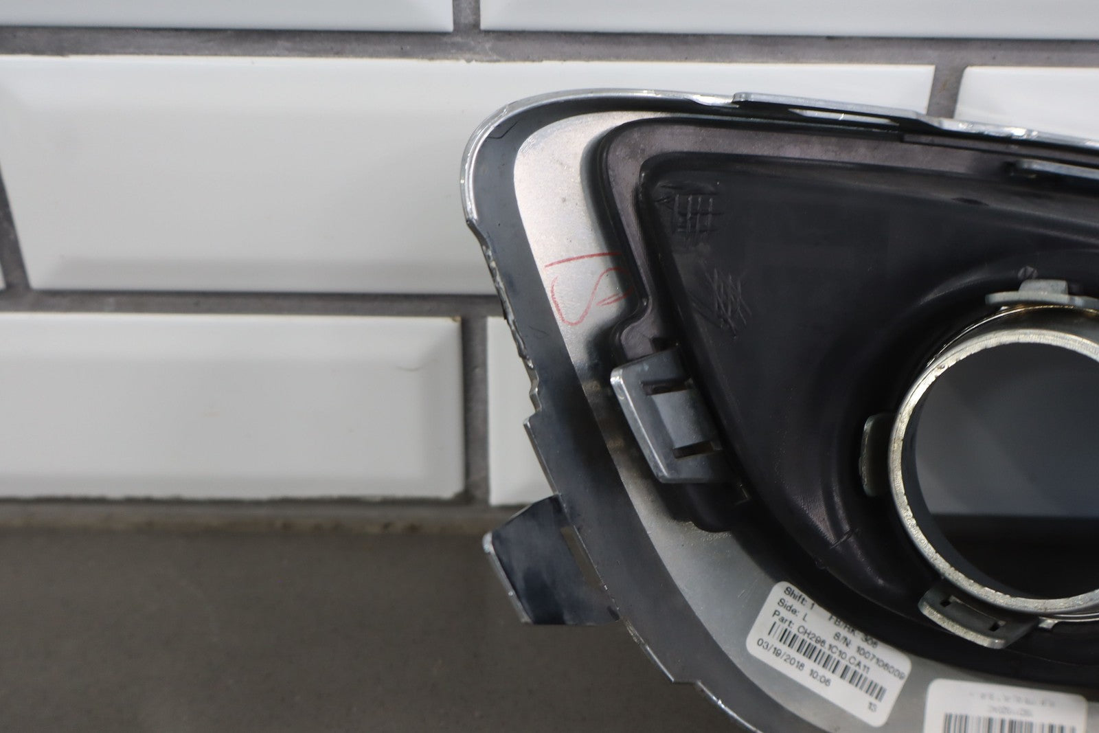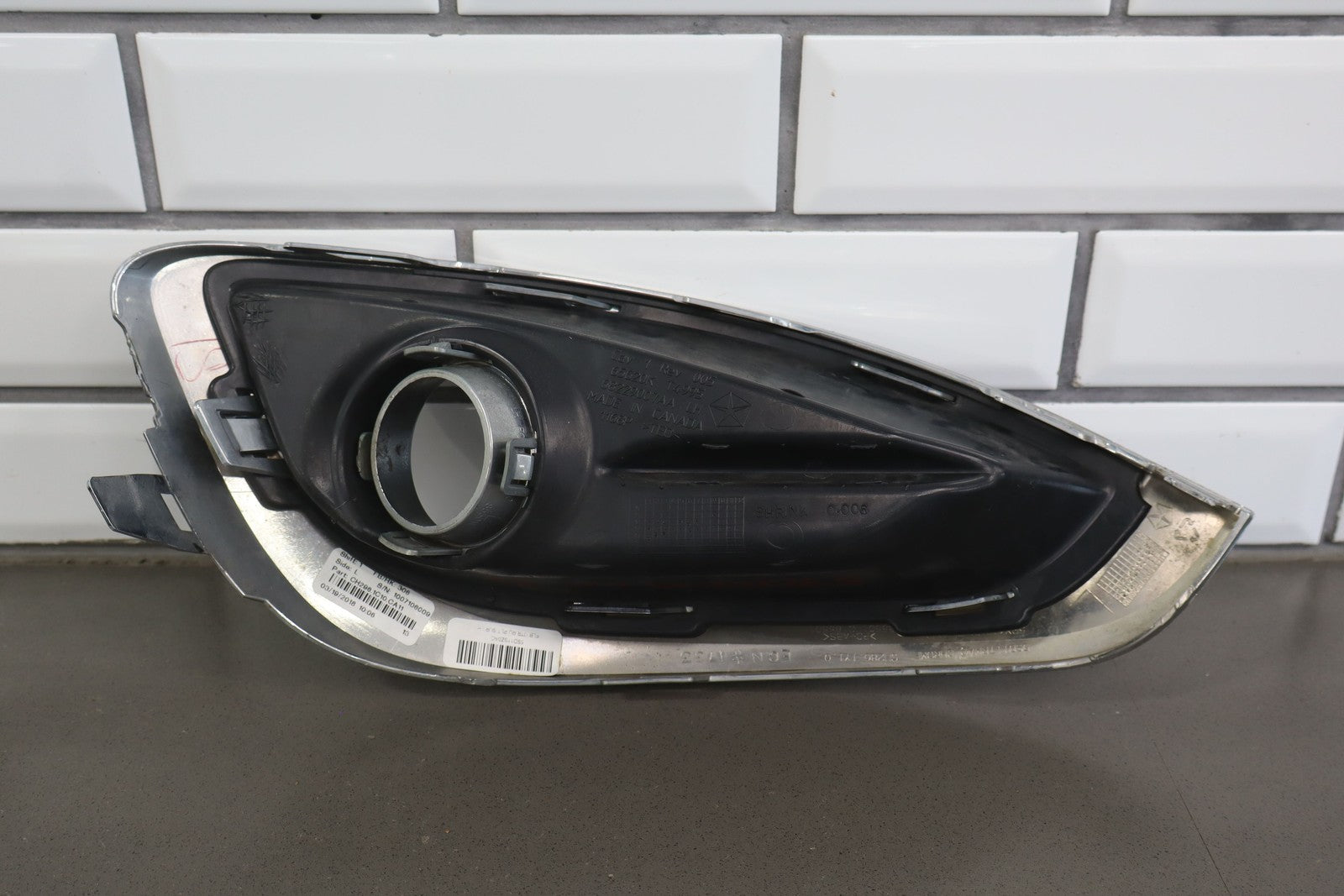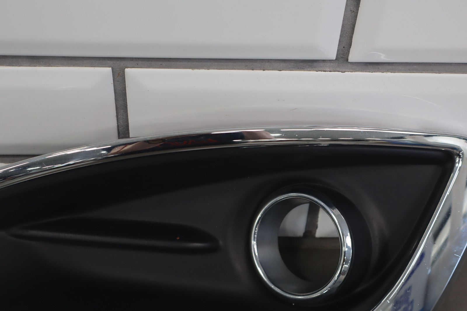 Lh Bumper Mounted Fog Light Bezel, Black Textured Plastic W/chrome Trim, Multiple Stone Chips/knicks
