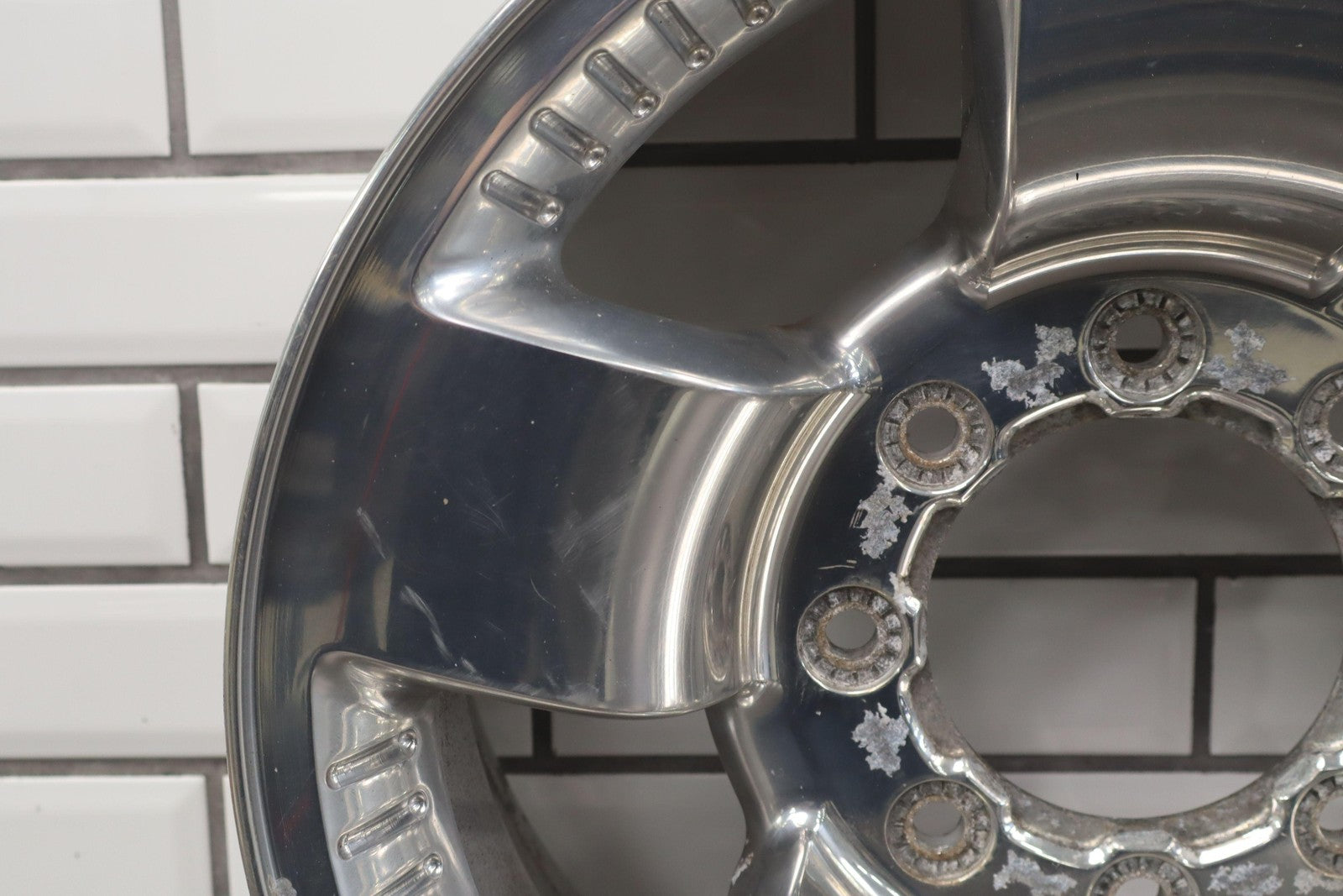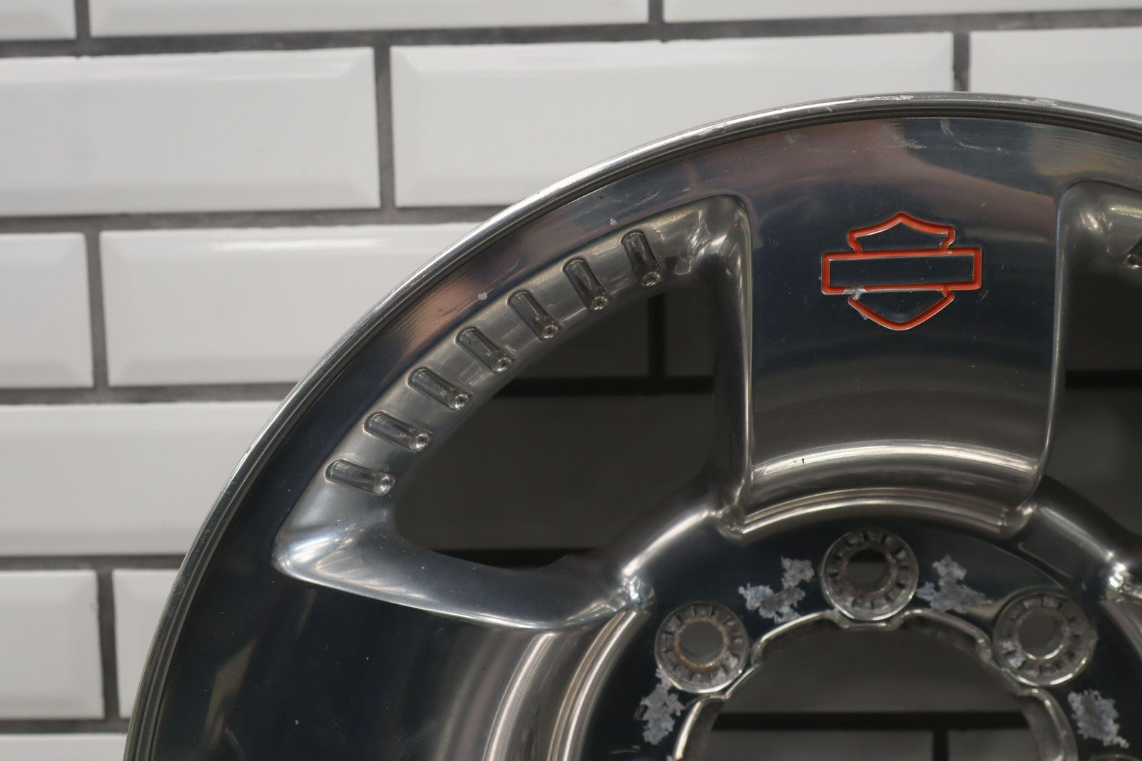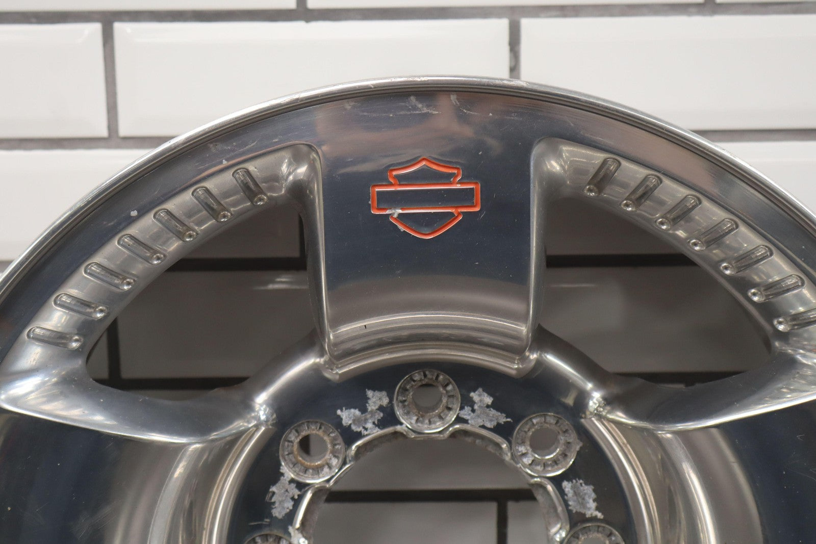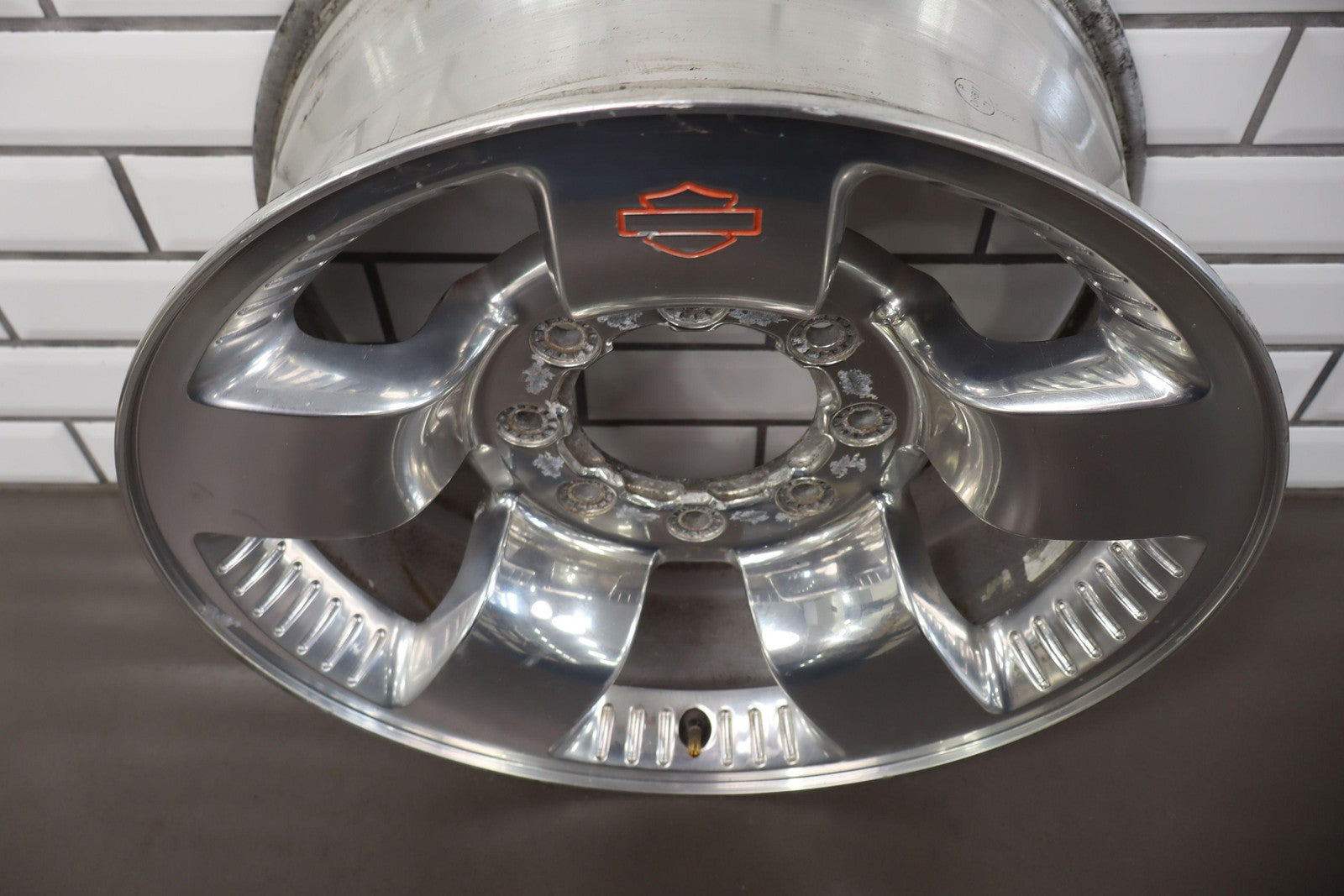 Rh Rear, 18x8 Polished 5 Spoke Wheel (harley-davidson) W/lug Nuts, Corrosion Starting On Face, Light Scratches, Mild Bend