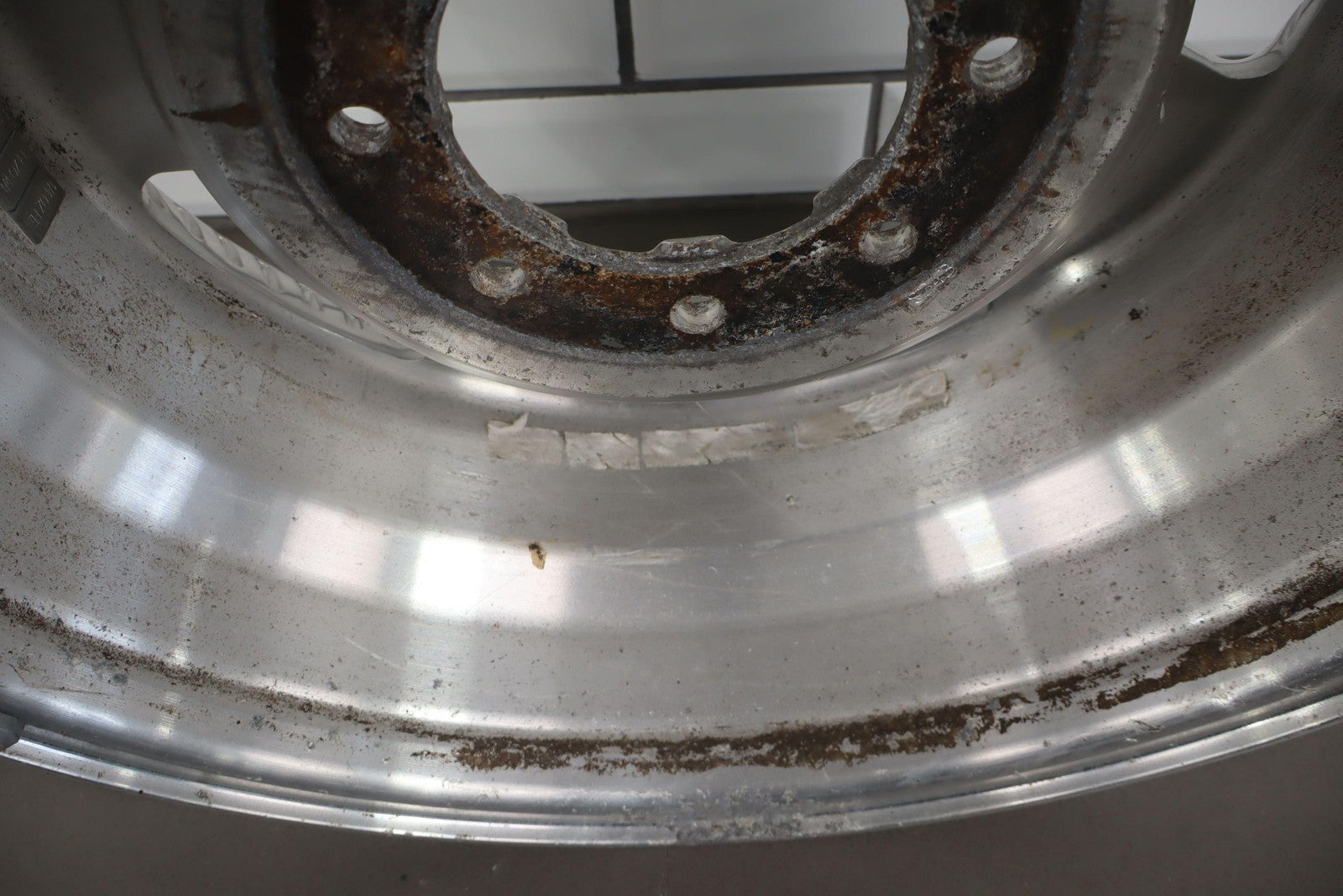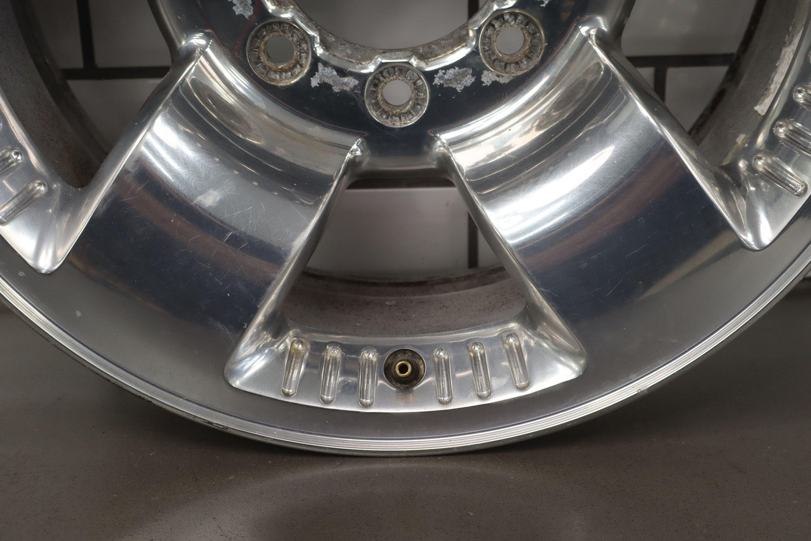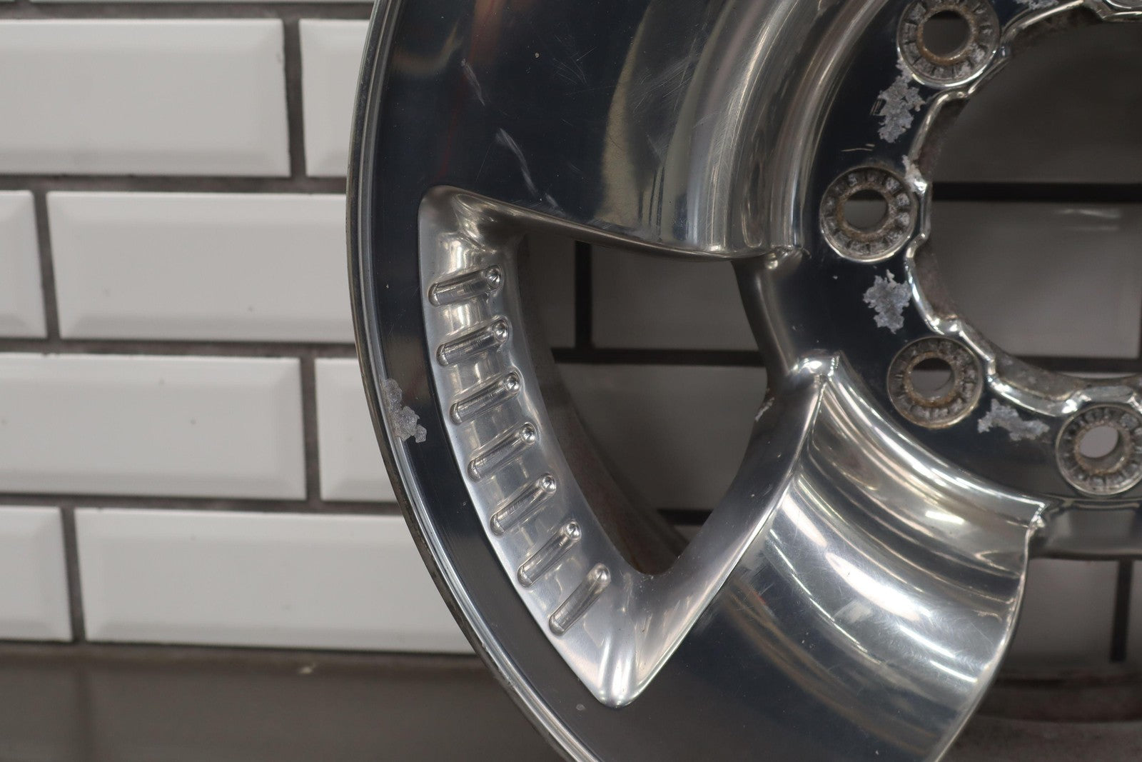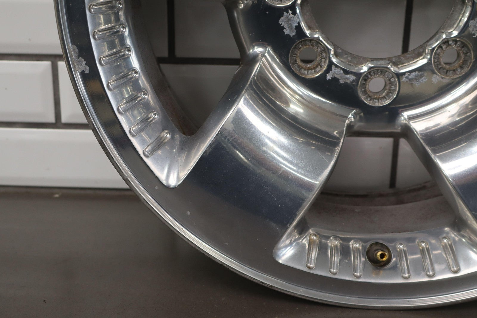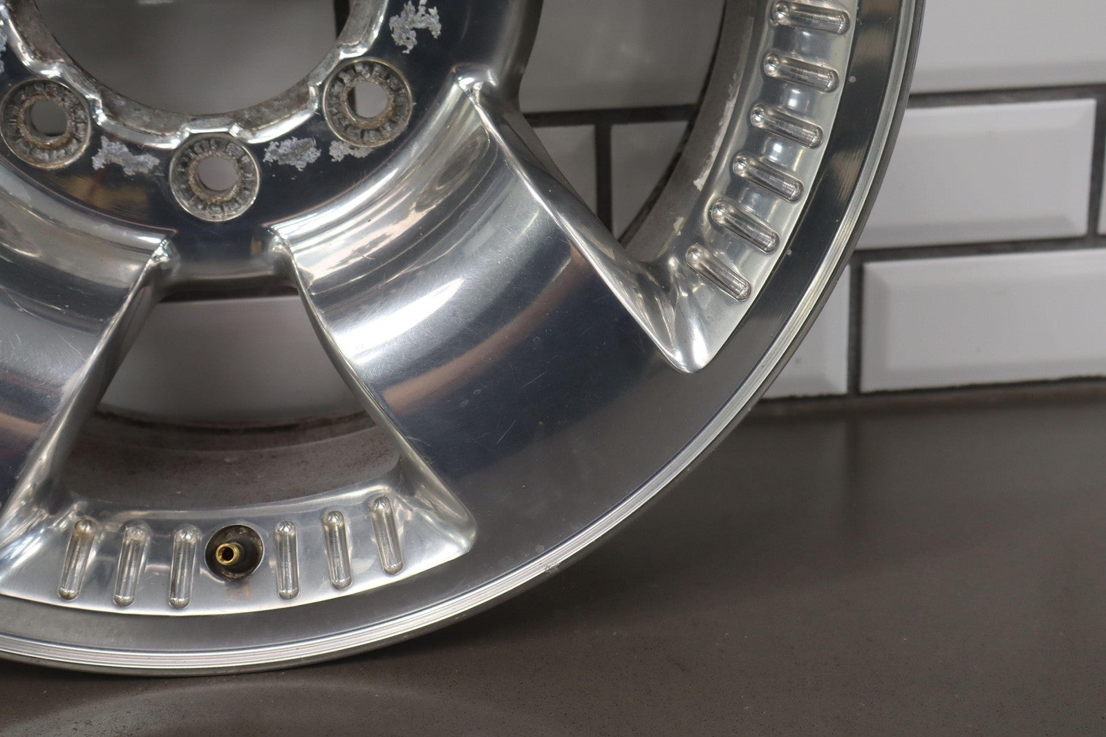 Rh Rear, 18x8 Polished 5 Spoke Wheel (harley-davidson) W/lug Nuts, Corrosion Starting On Face, Light Scratches, Mild Bend