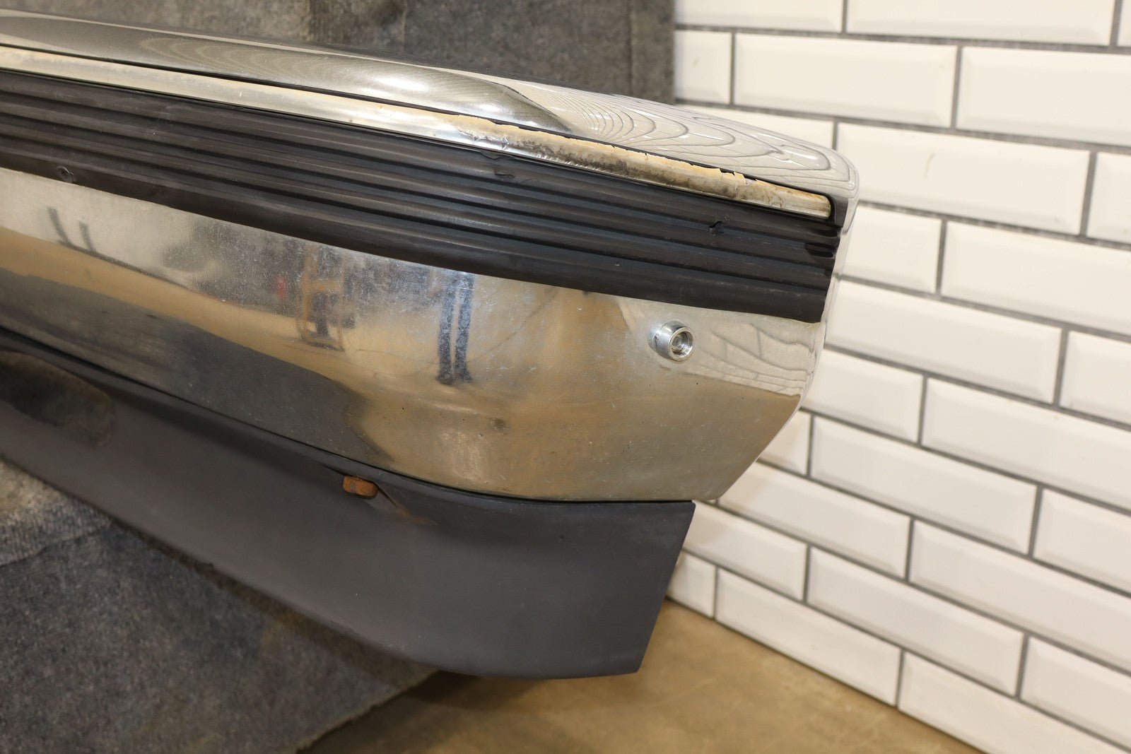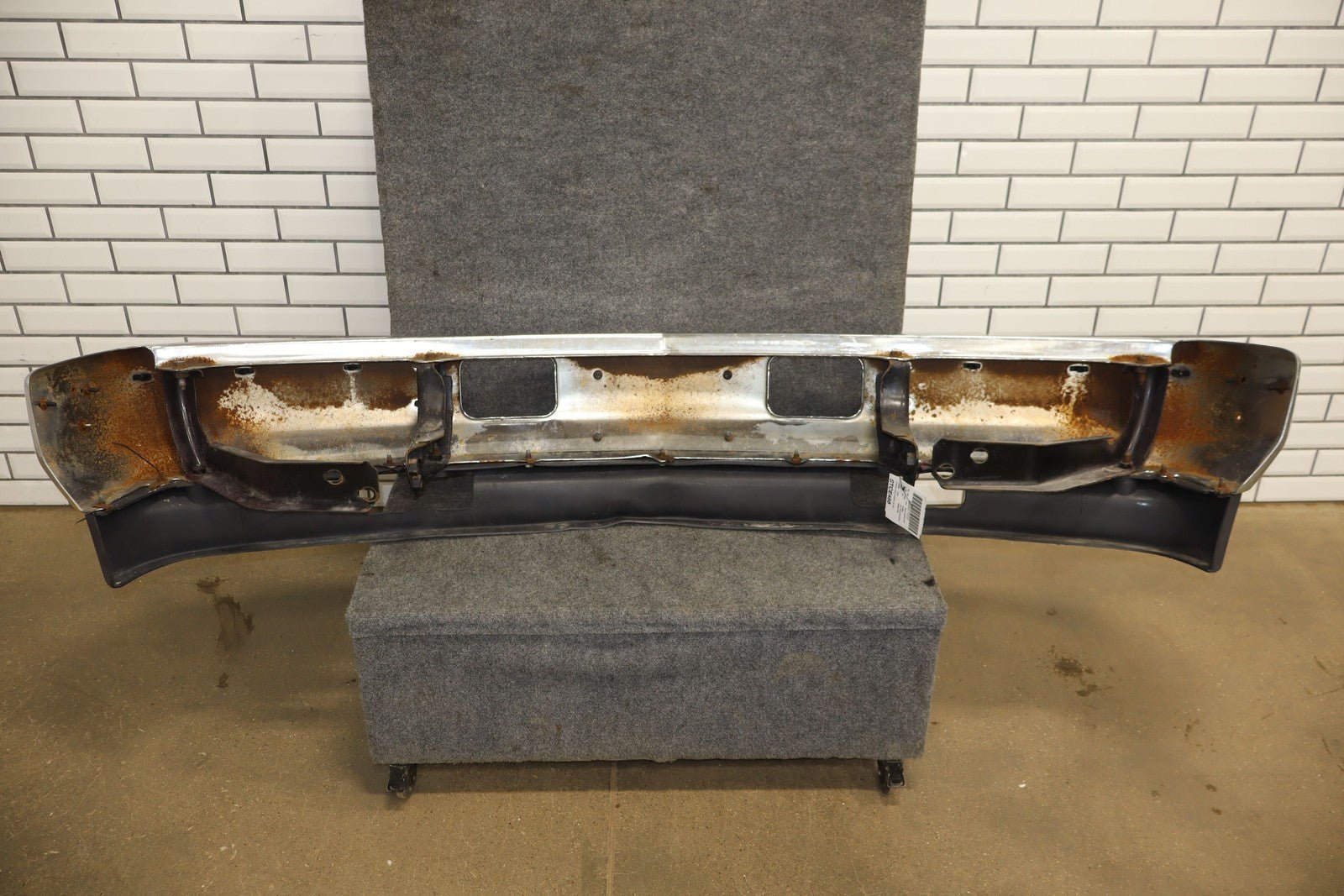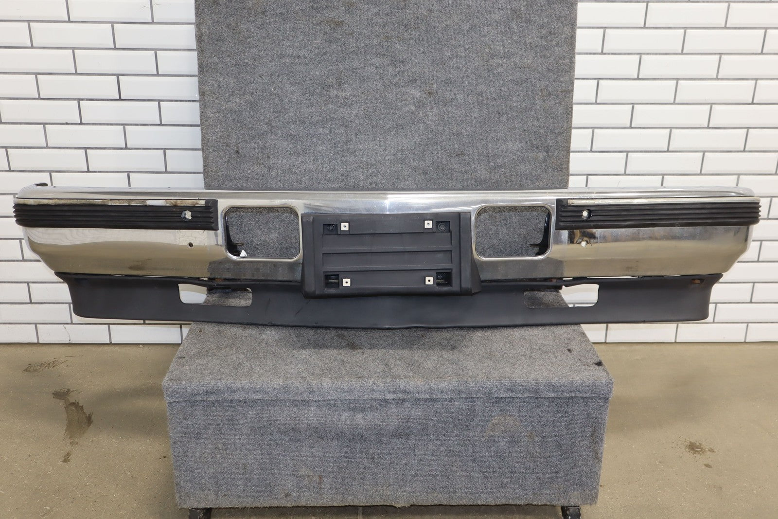 Important notes: Chrome Front Bumper, Air Vent Holes W/impact Strip, Decent Weathering, Couple Holes Drilled, Weathered Chrome Strip On Moulding