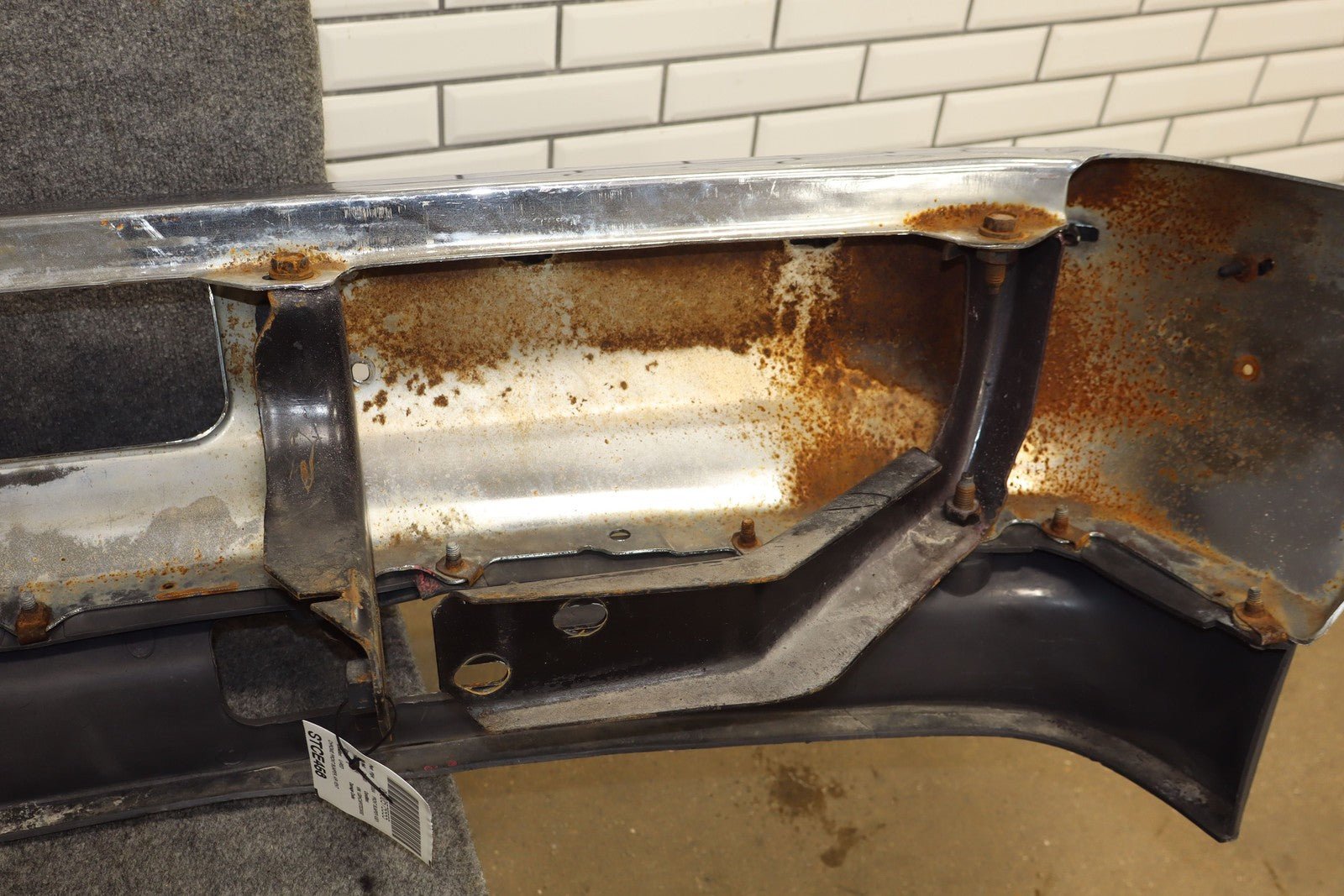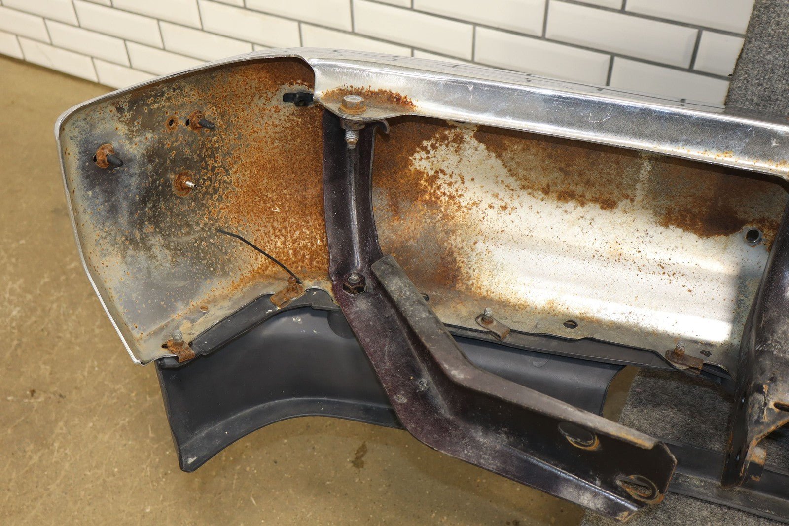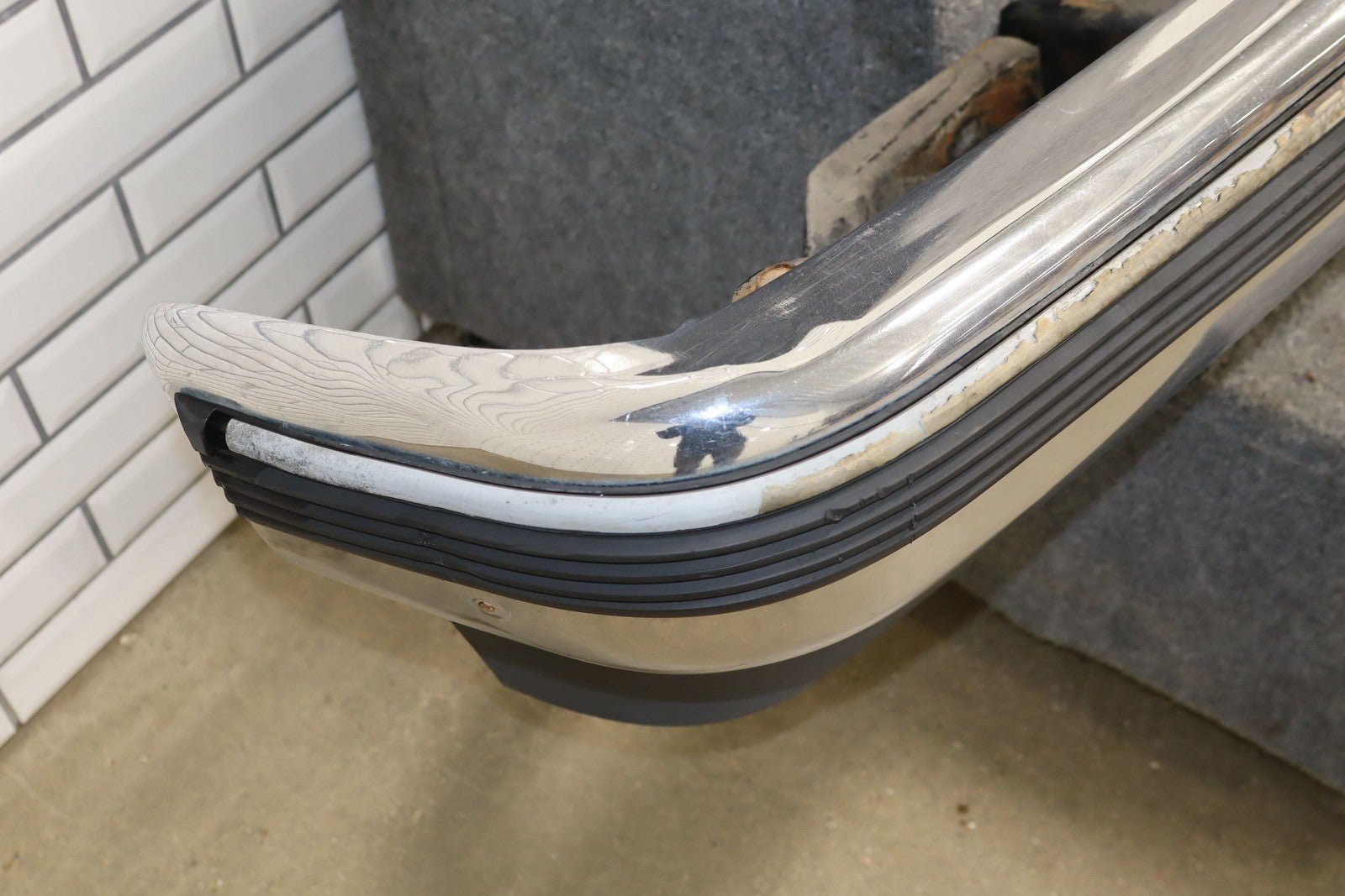 Important notes: Chrome Front Bumper, Air Vent Holes W/impact Strip, Decent Weathering, Couple Holes Drilled, Weathered Chrome Strip On Moulding