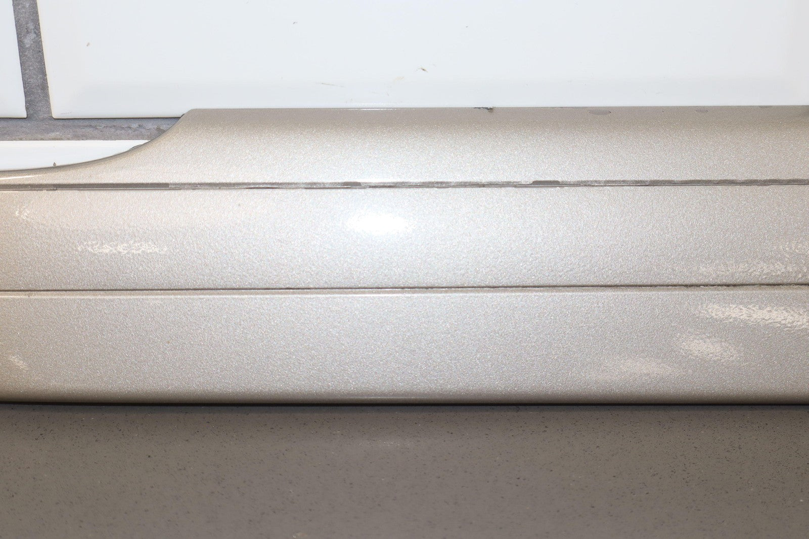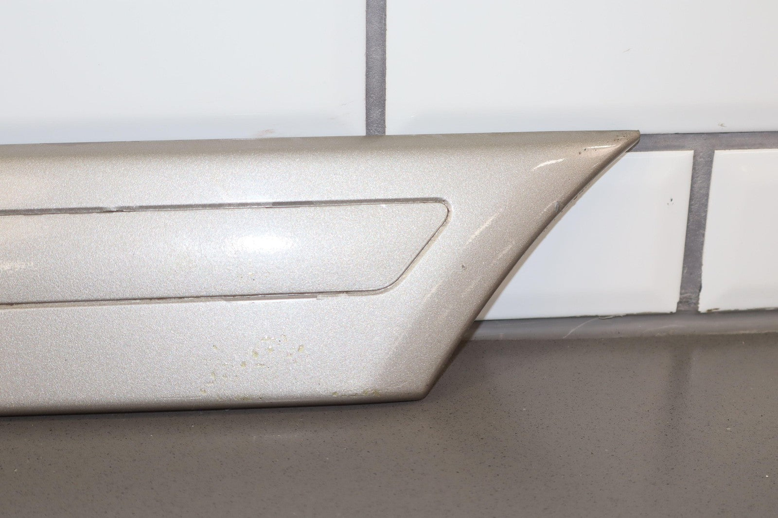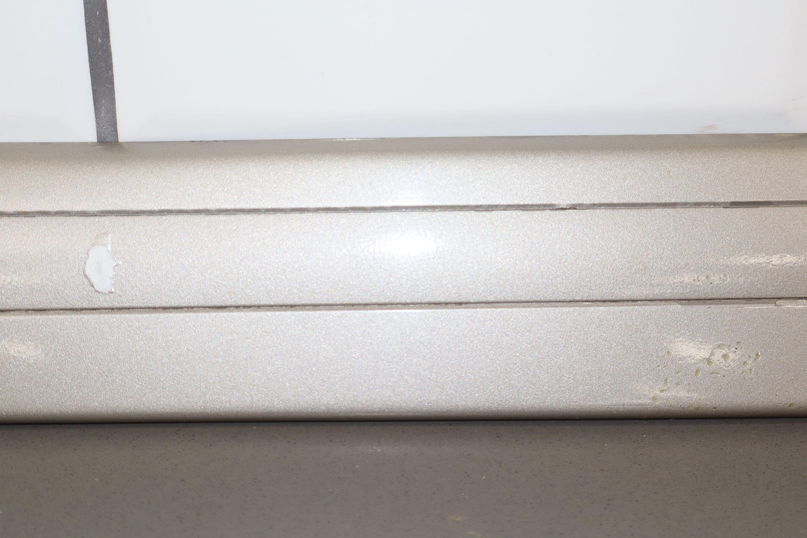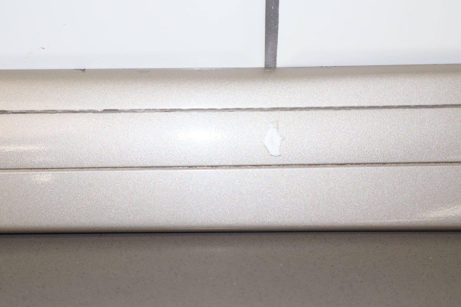 Moldura del panel lateral derecho, beige grisáceo, con aspecto repintado, con un desprendimiento considerable, una pestaña de montaje agrietada (marcada en rojo)