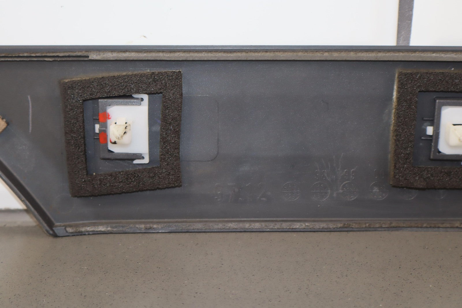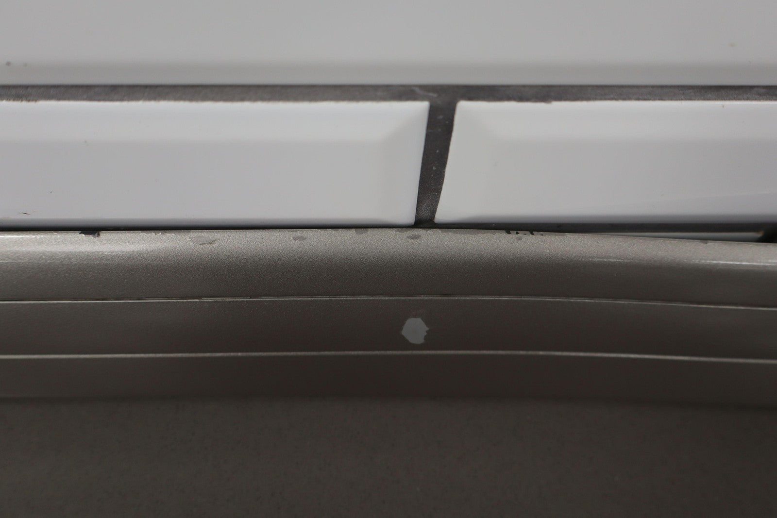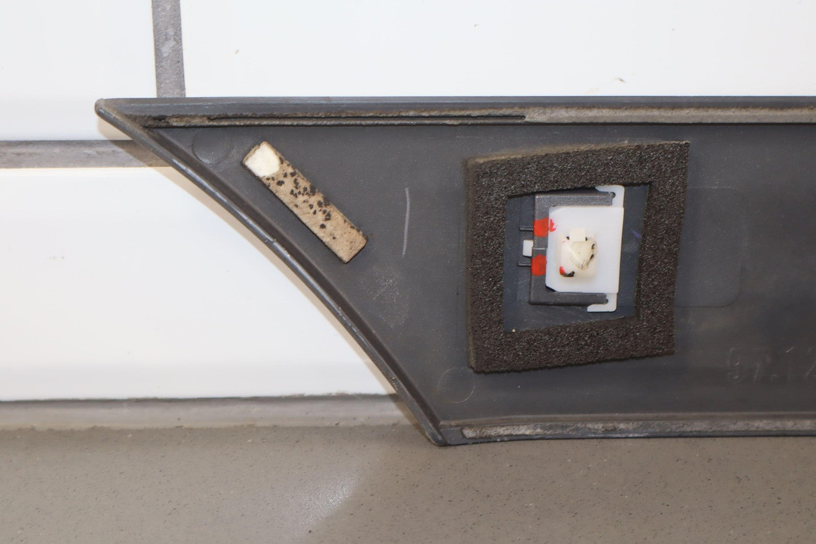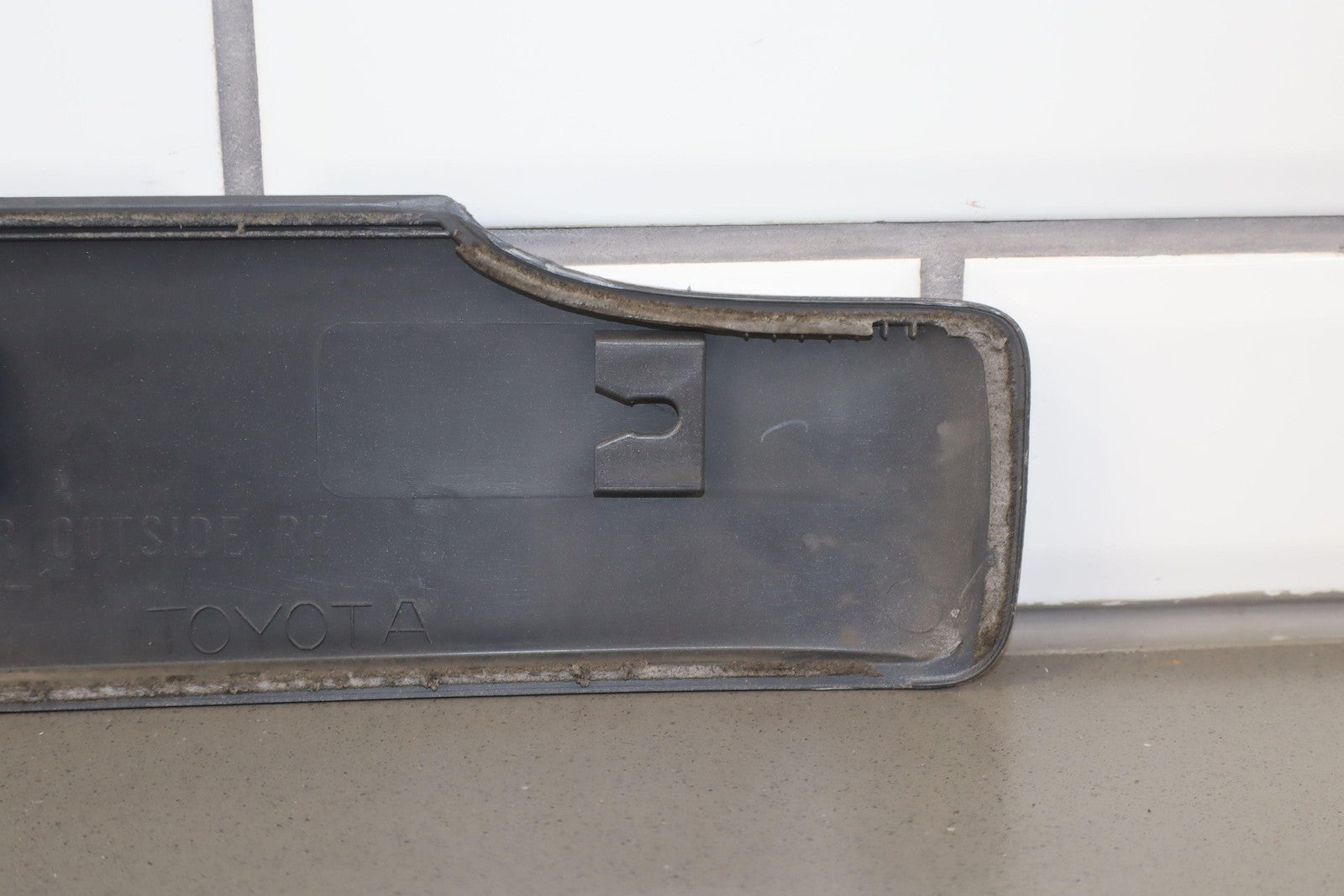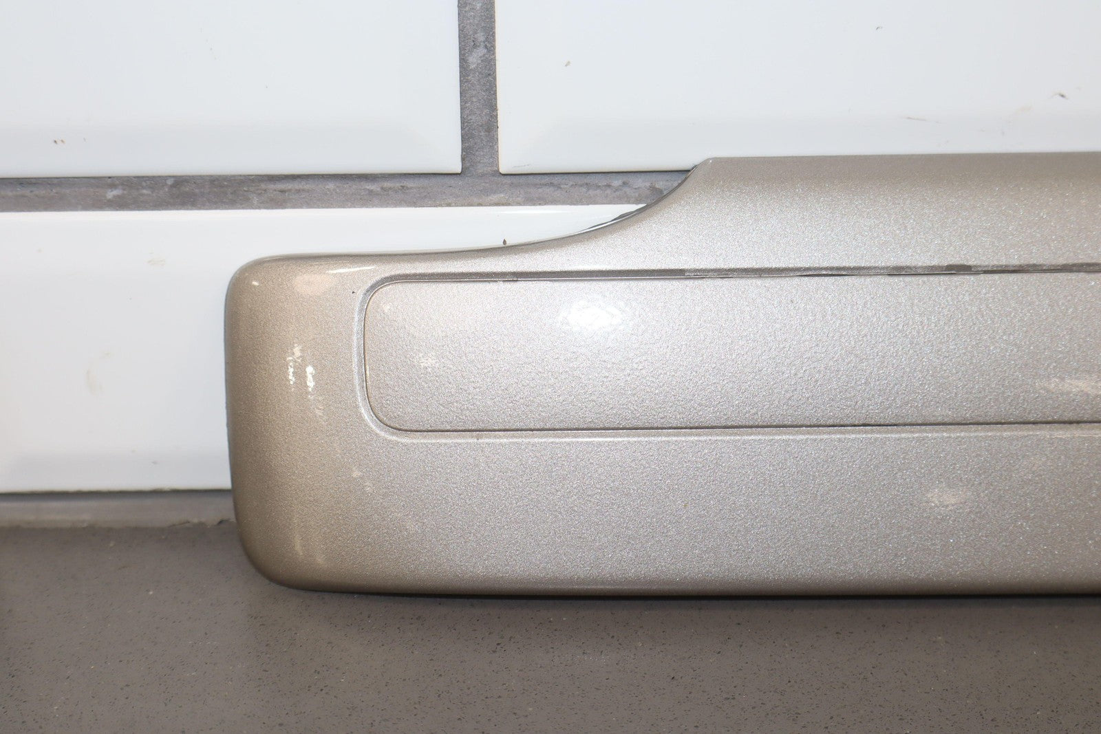 Moldura del panel lateral derecho, beige grisáceo, con aspecto repintado, con un desprendimiento considerable, una pestaña de montaje agrietada (marcada en rojo)