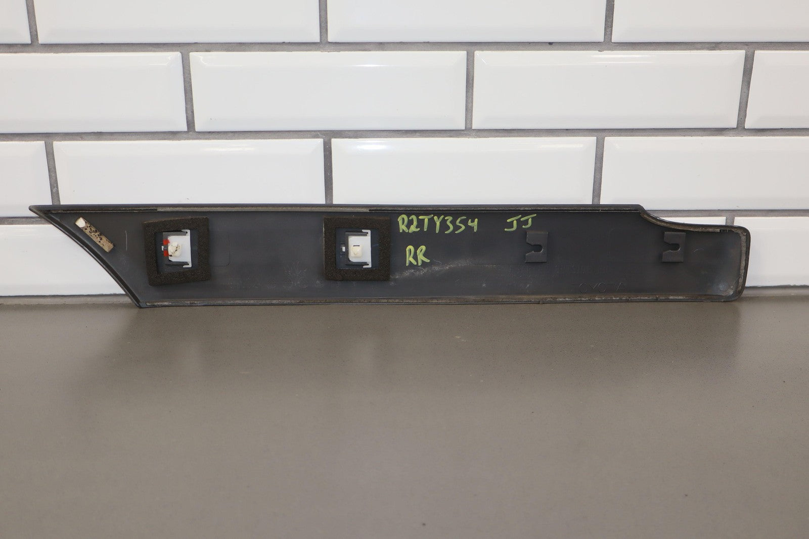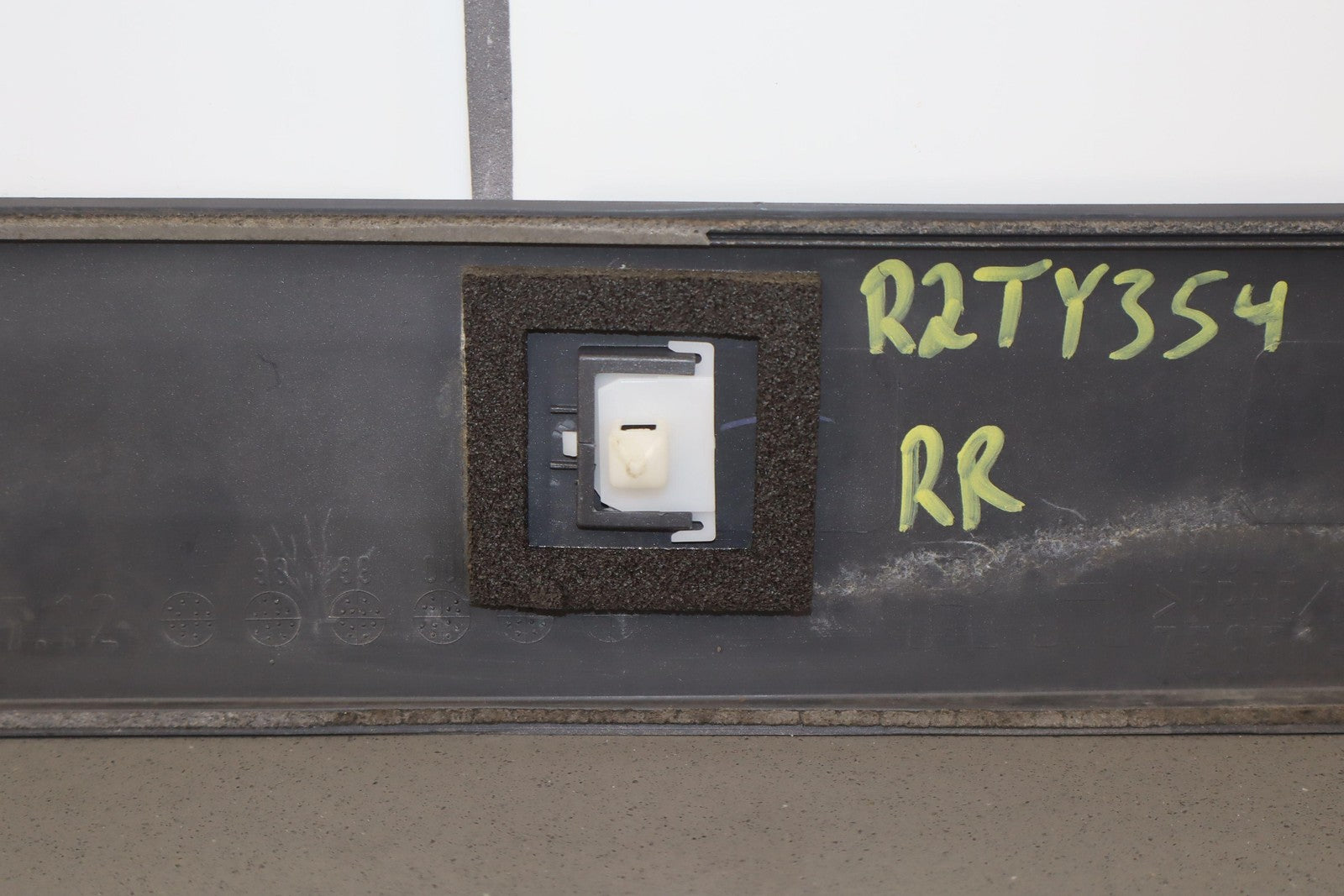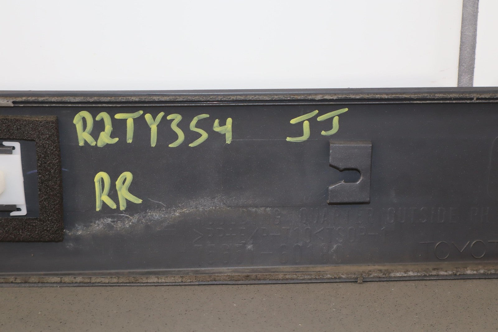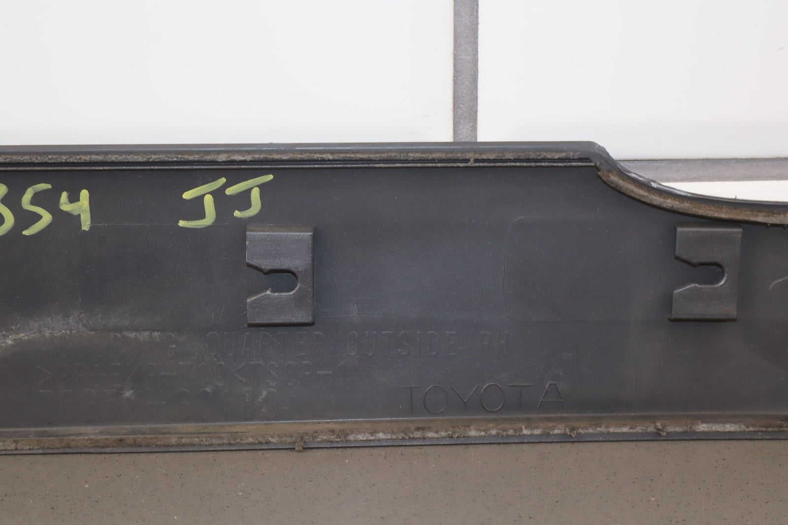 Moldura del panel lateral derecho, beige grisáceo, con aspecto repintado, con un desprendimiento considerable, una pestaña de montaje agrietada (marcada en rojo)