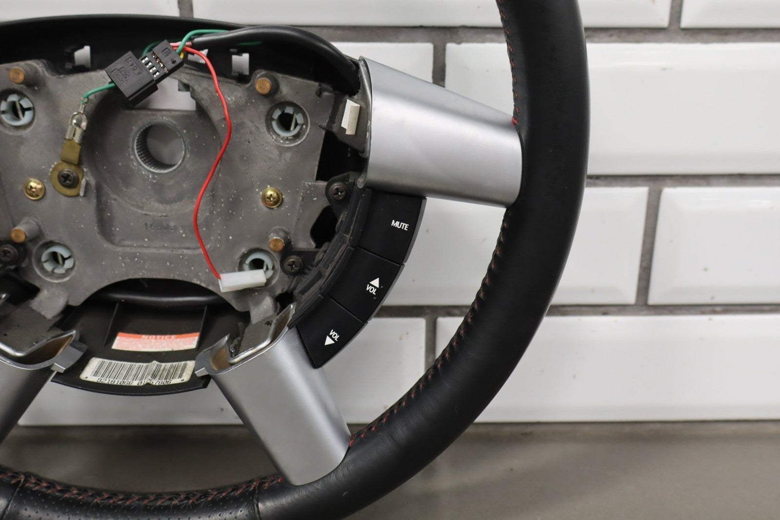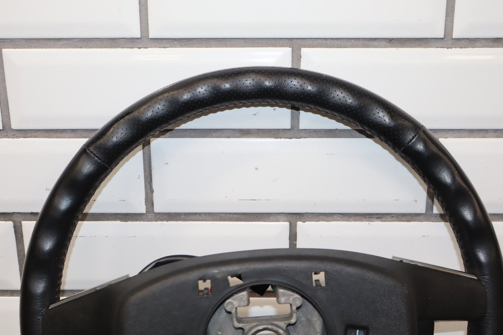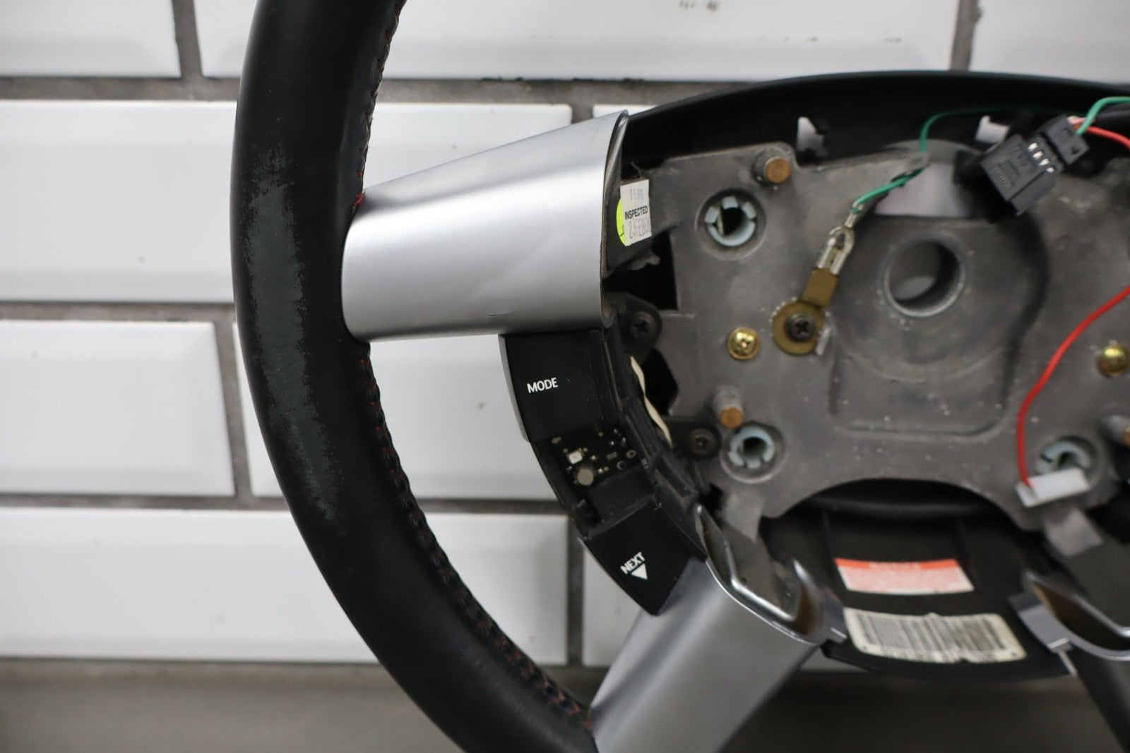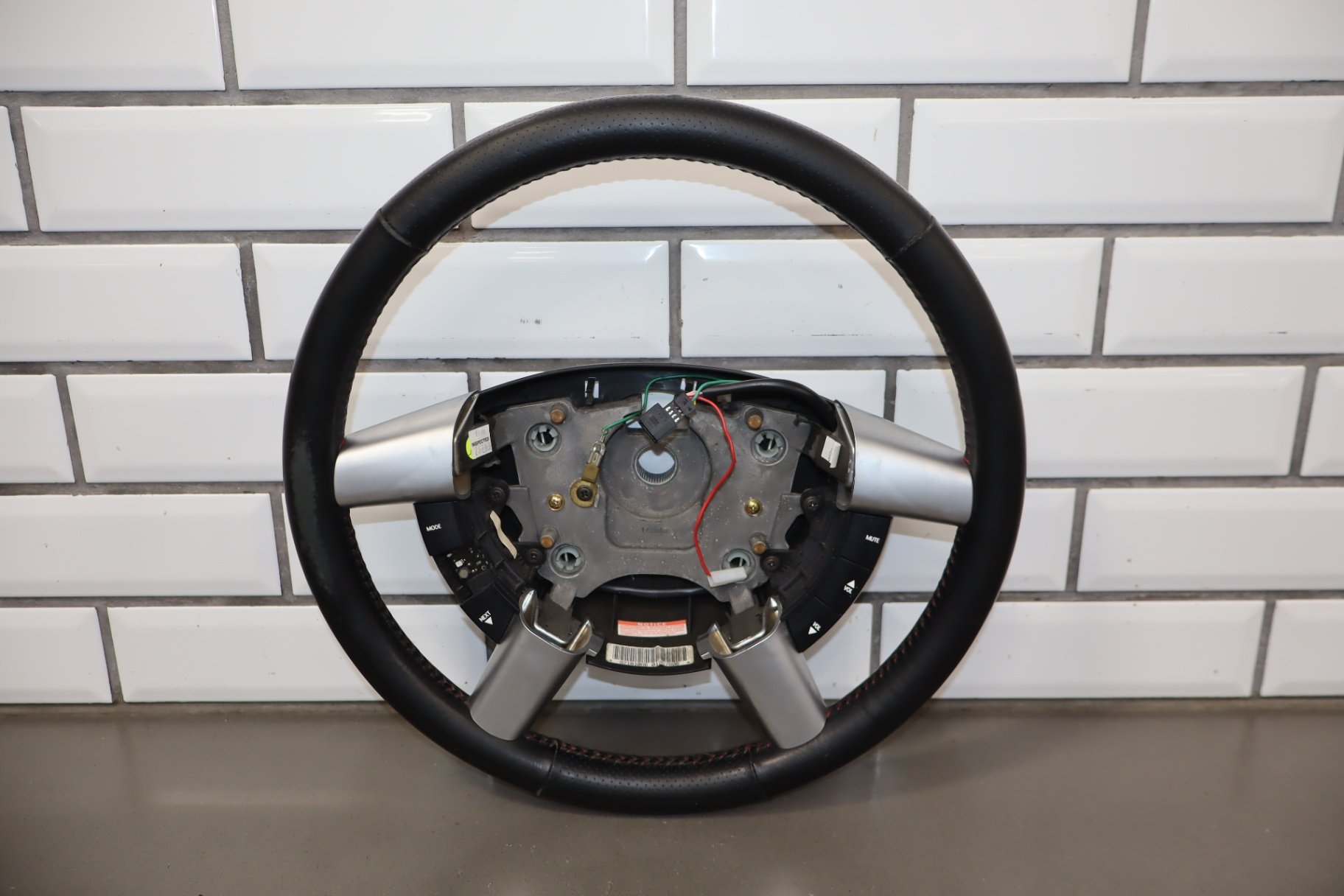 leather steering wheel, clean lettering, next up button missing, bubbling/cracked trim, mild to decent wear to leather
