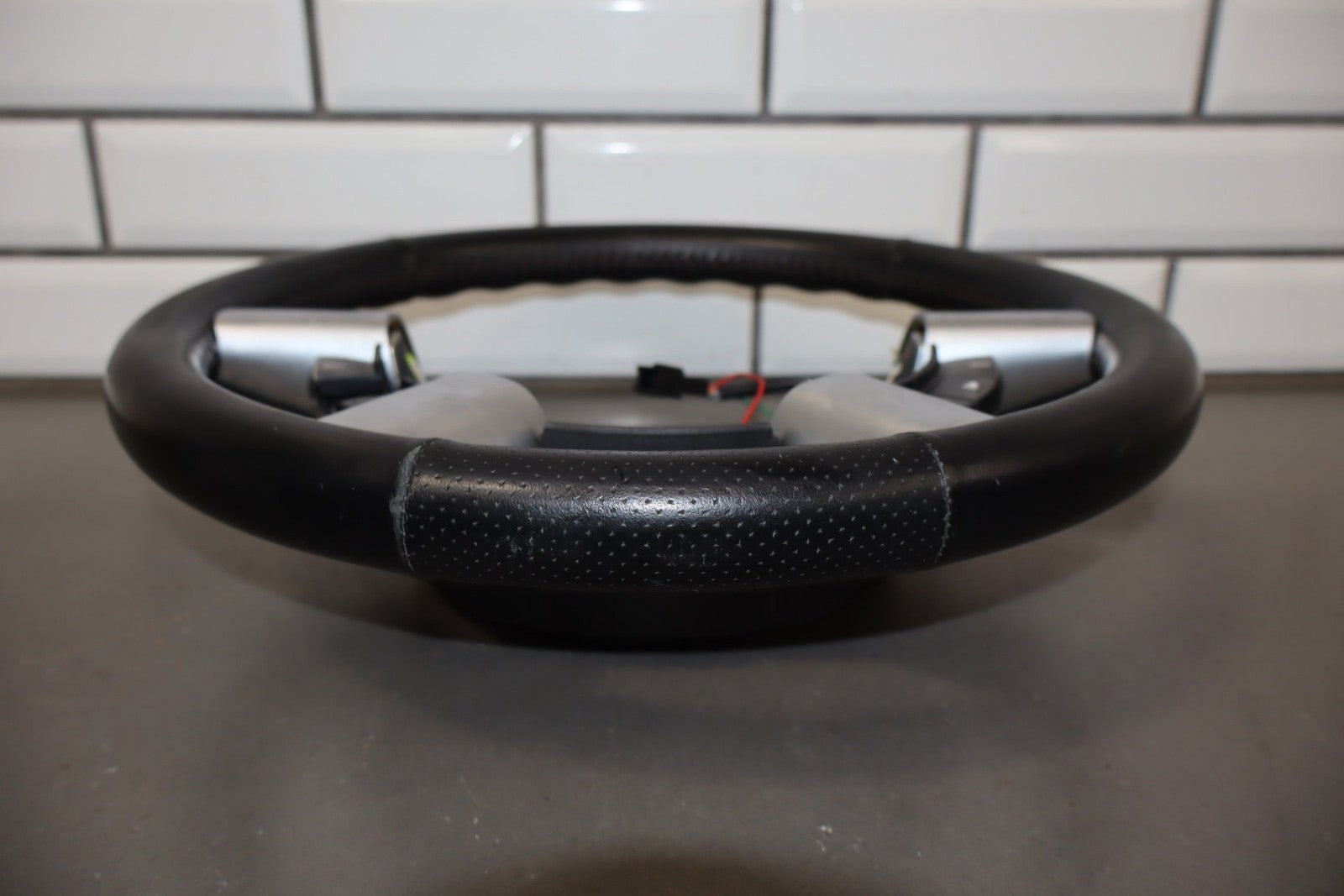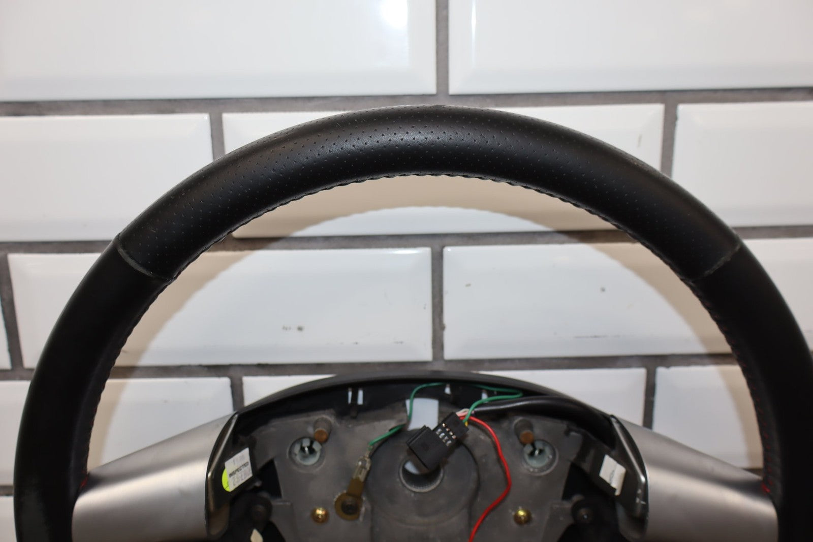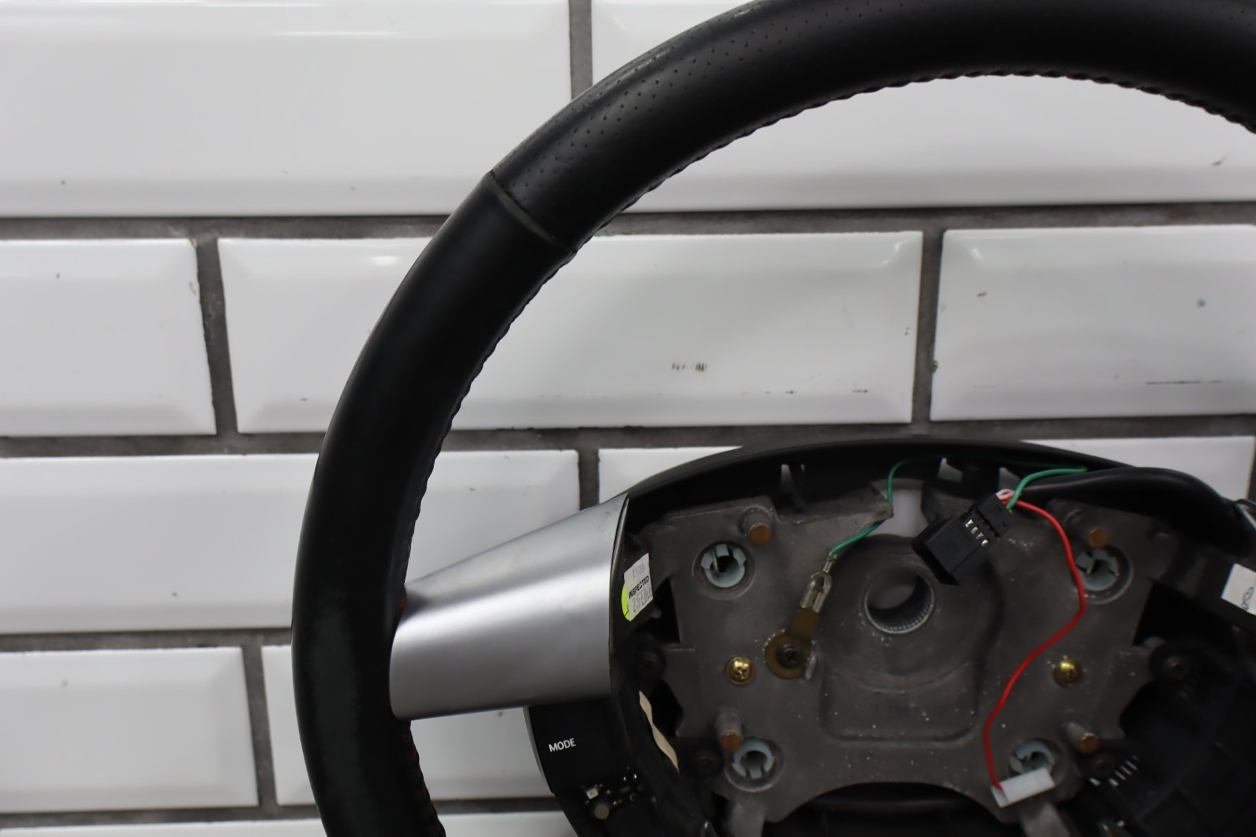 leather steering wheel, clean lettering, next up button missing, bubbling/cracked trim, mild to decent wear to leather