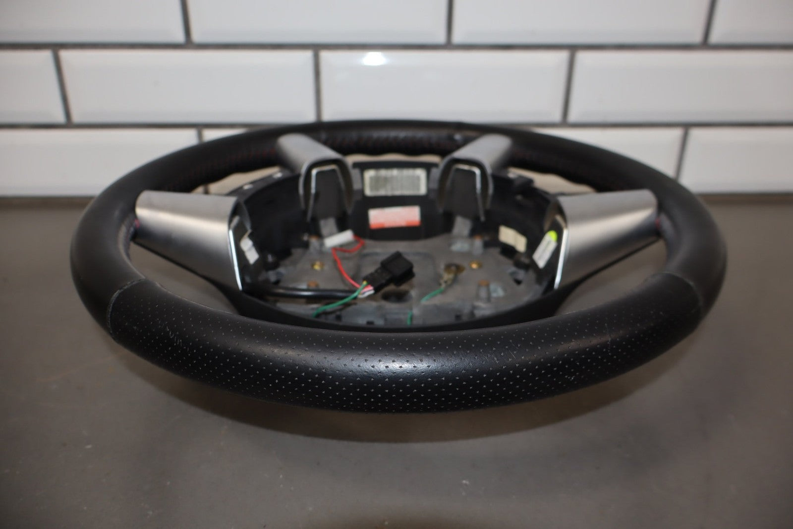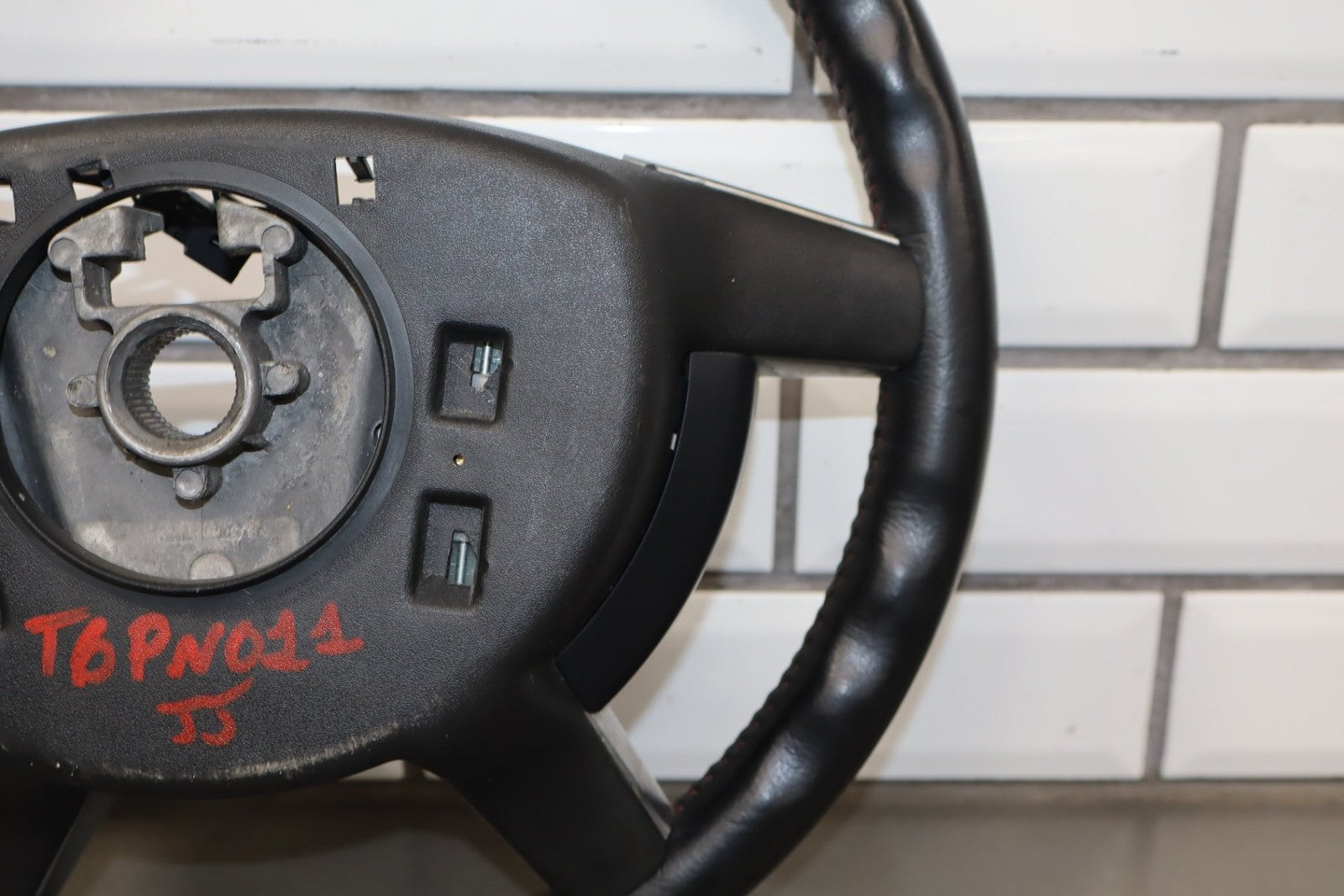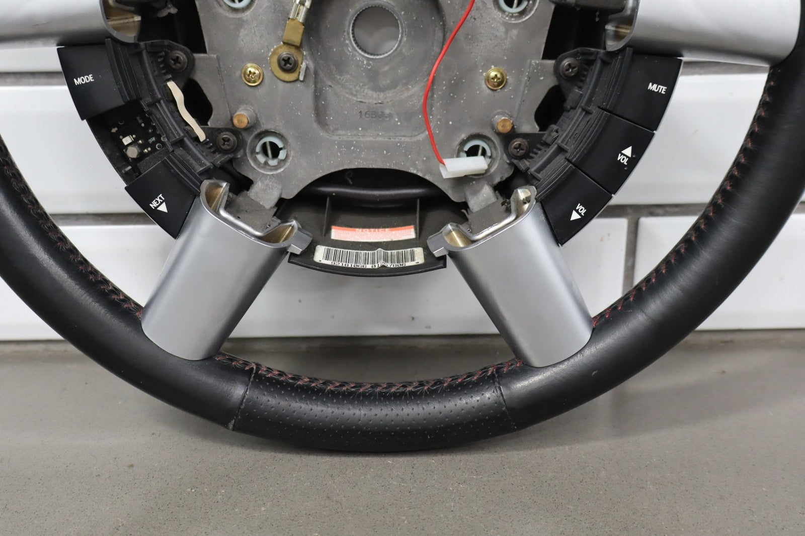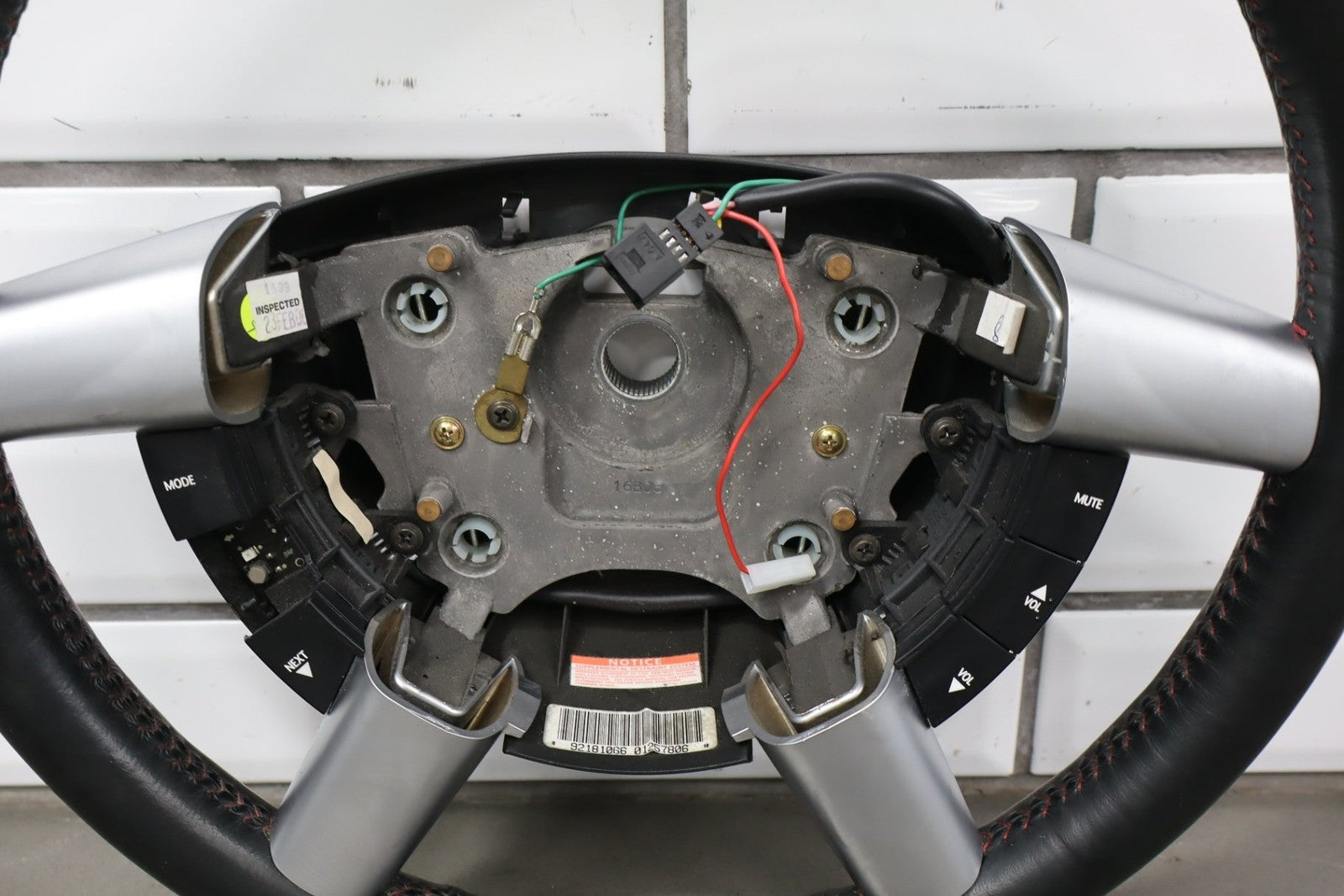 leather steering wheel, clean lettering, next up button missing, bubbling/cracked trim, mild to decent wear to leather