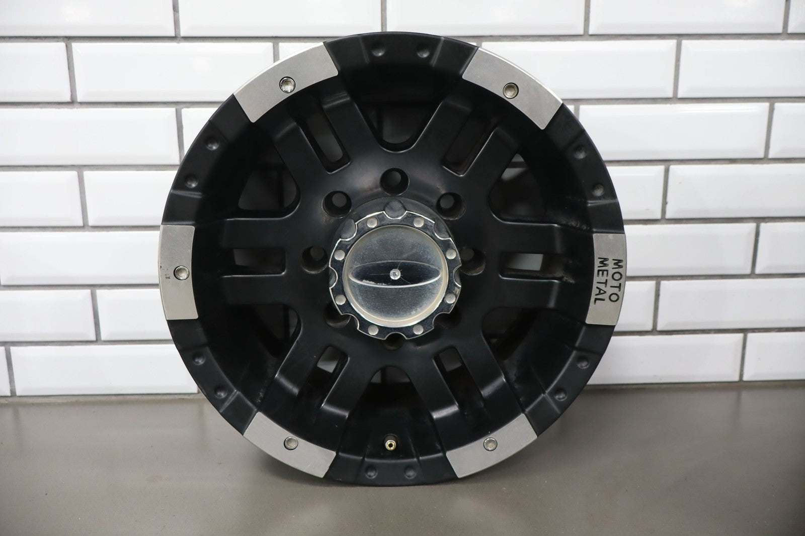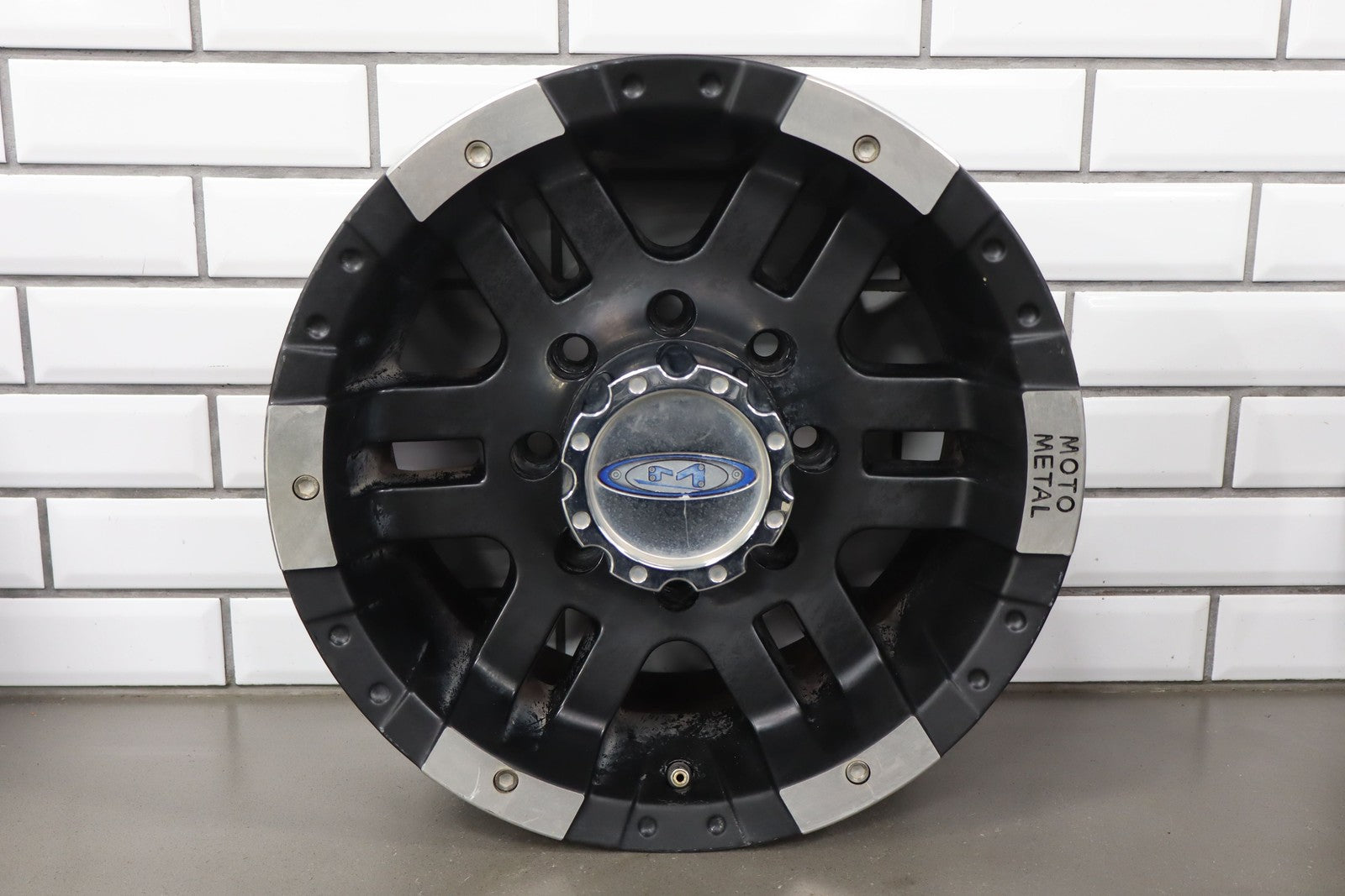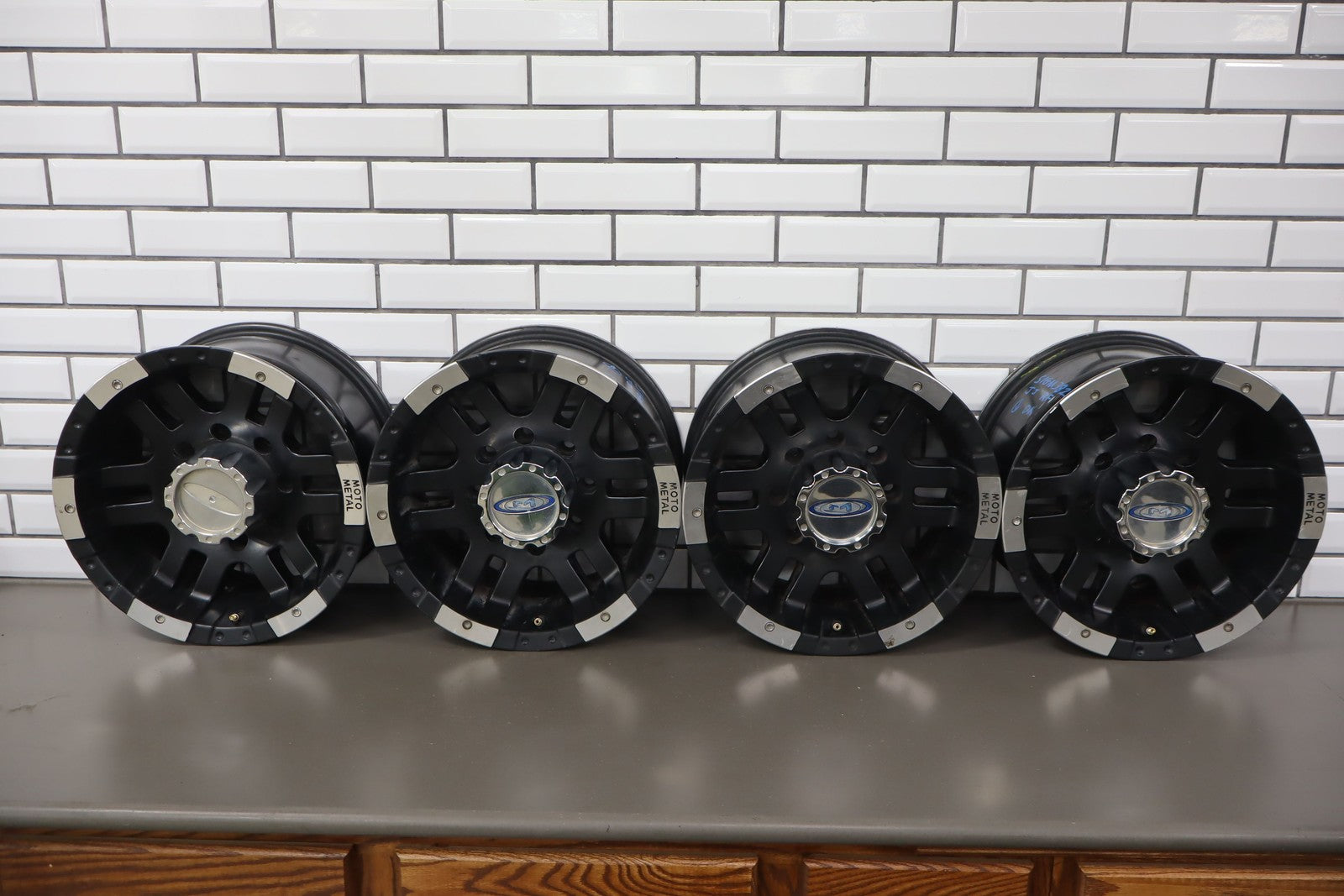Set Of 4 Aftermarket Wheels, 16x8 Metal Moto M0951, Light Scratches, Mild Weathering, Some Brake Dust Staining, All Spun True
