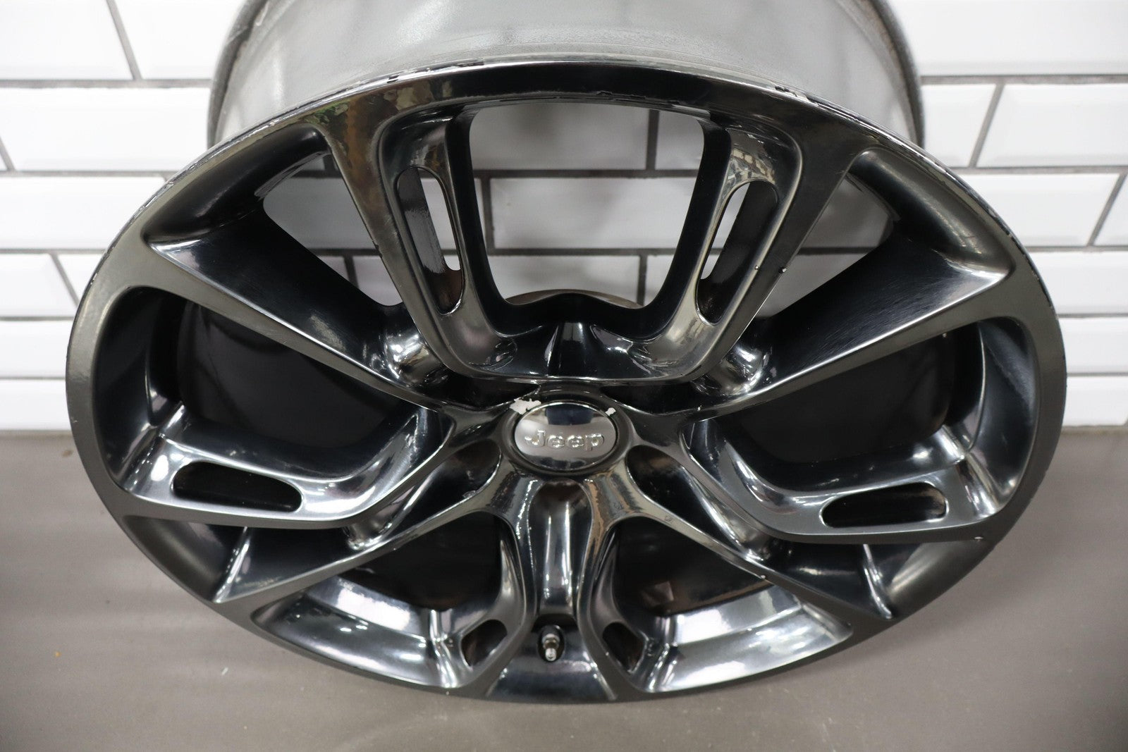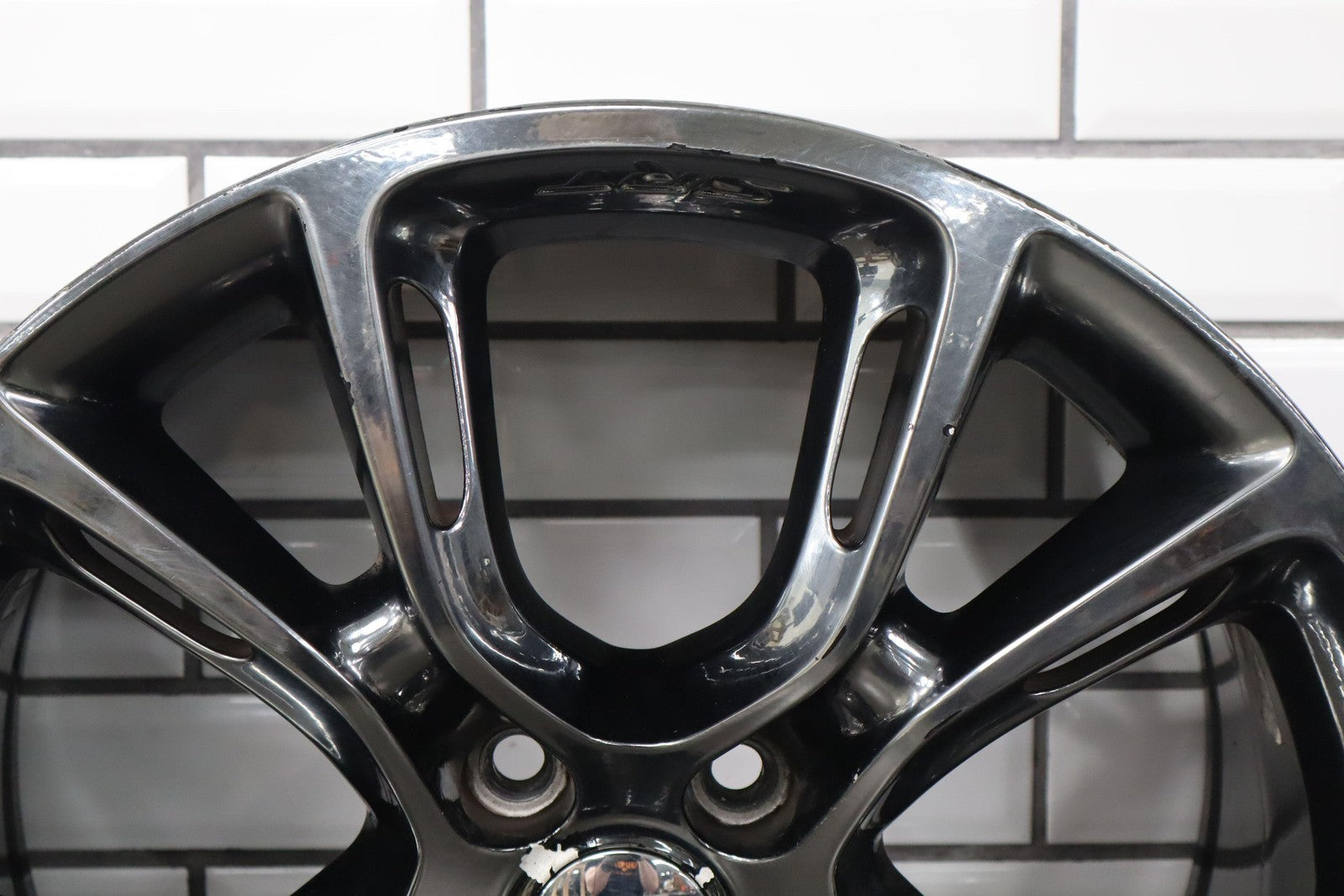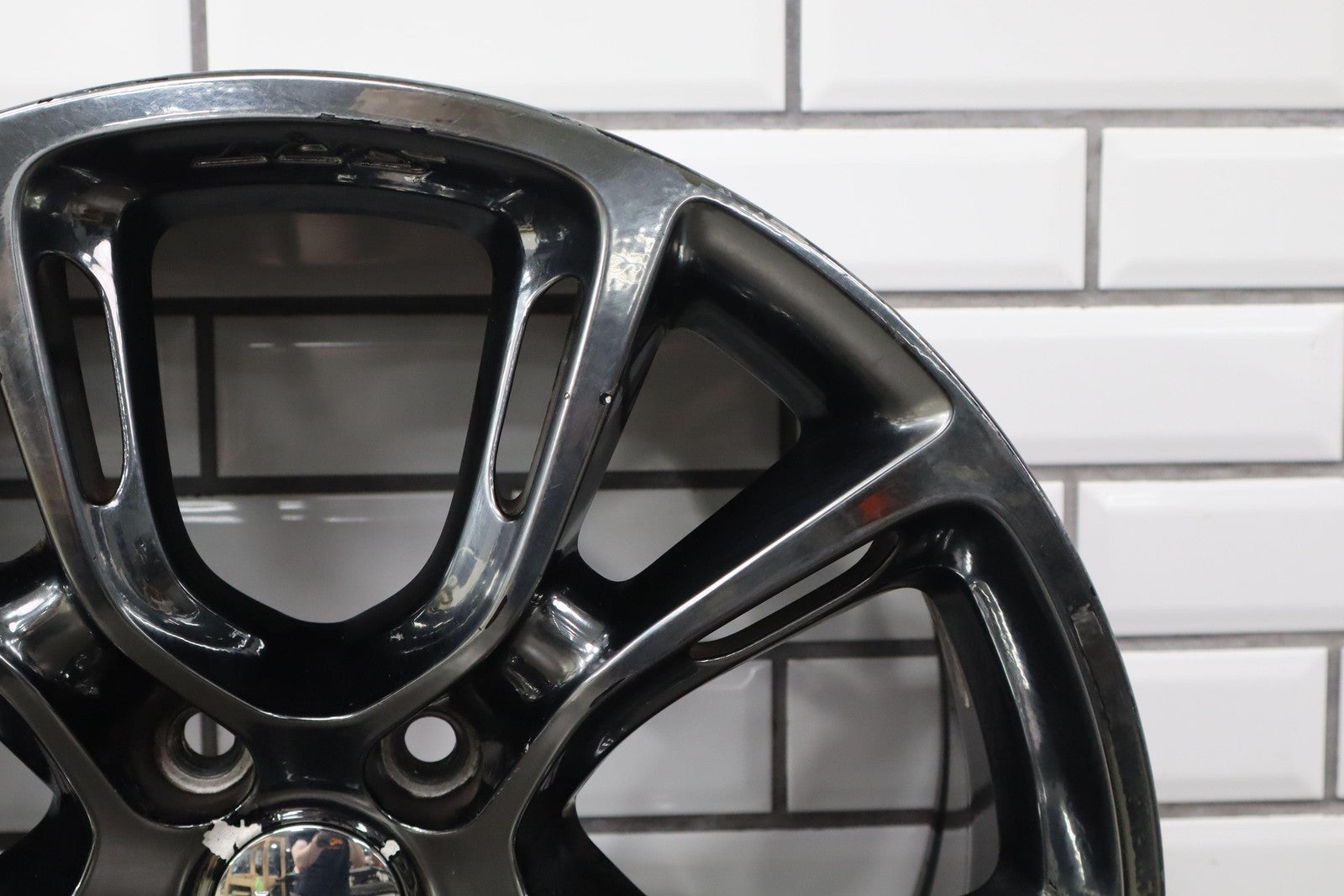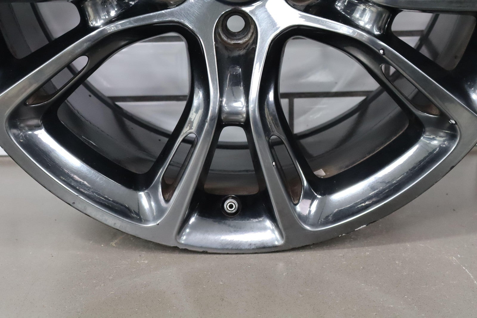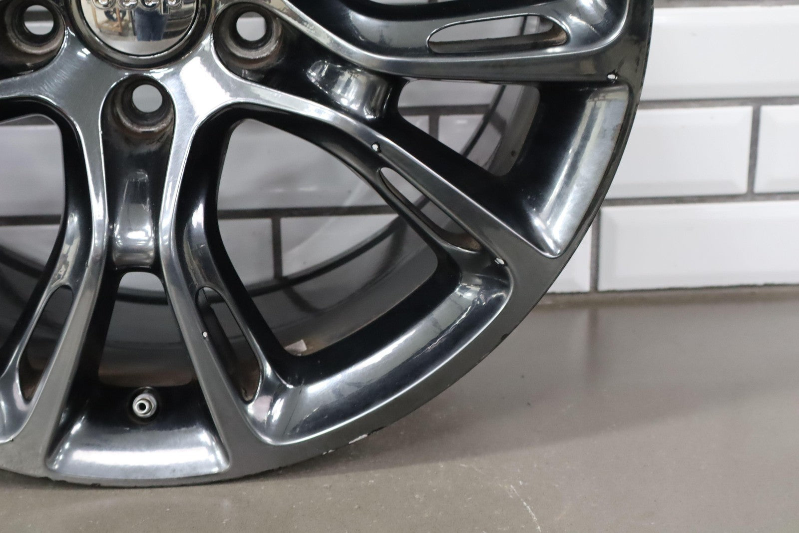Trasera izquierda, llanta de 20 x 10, cromada en negro, 10 radios abiertos (wf9), algunos desprendimientos en los bordes, centrifugado.
