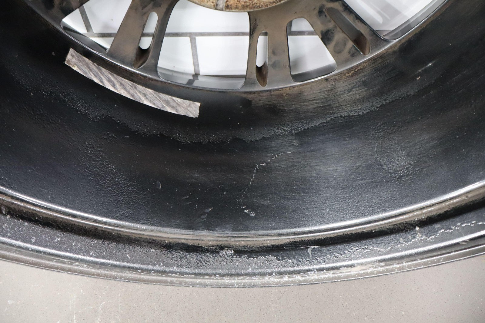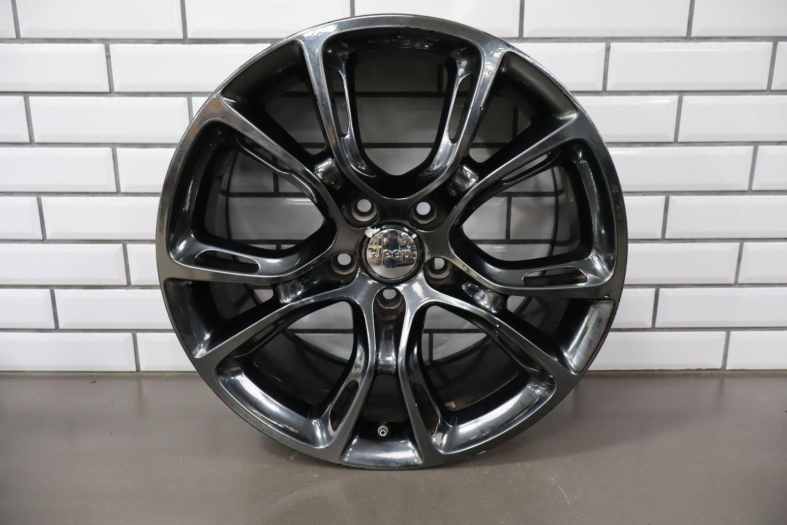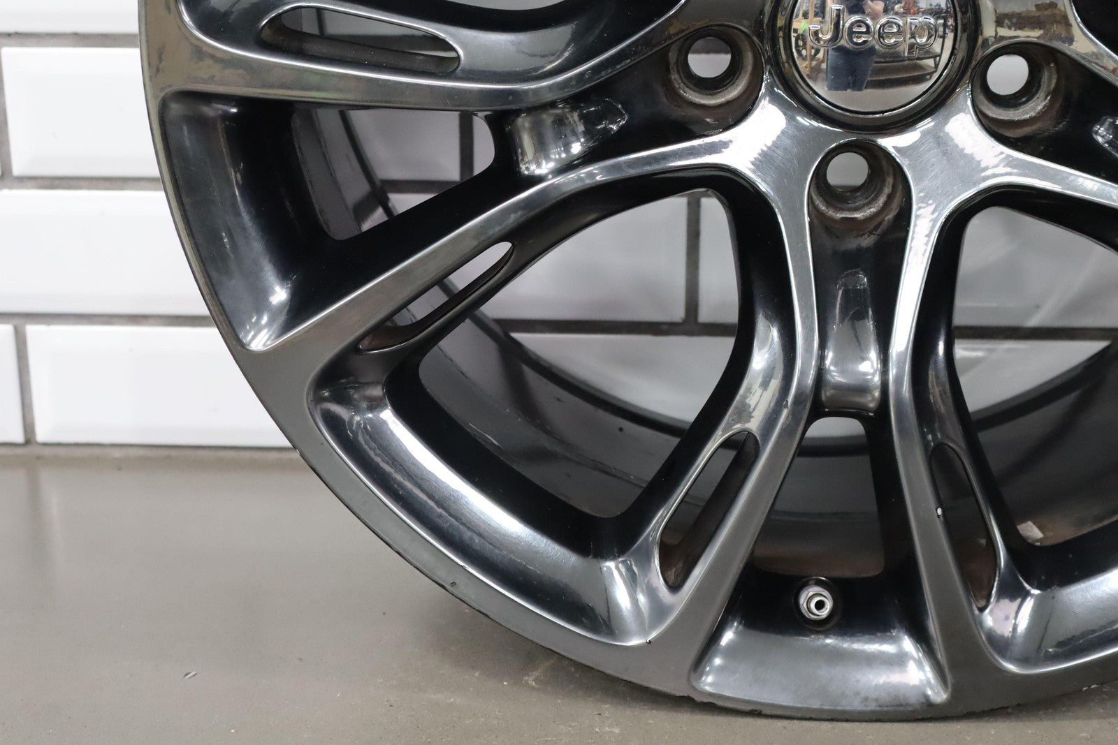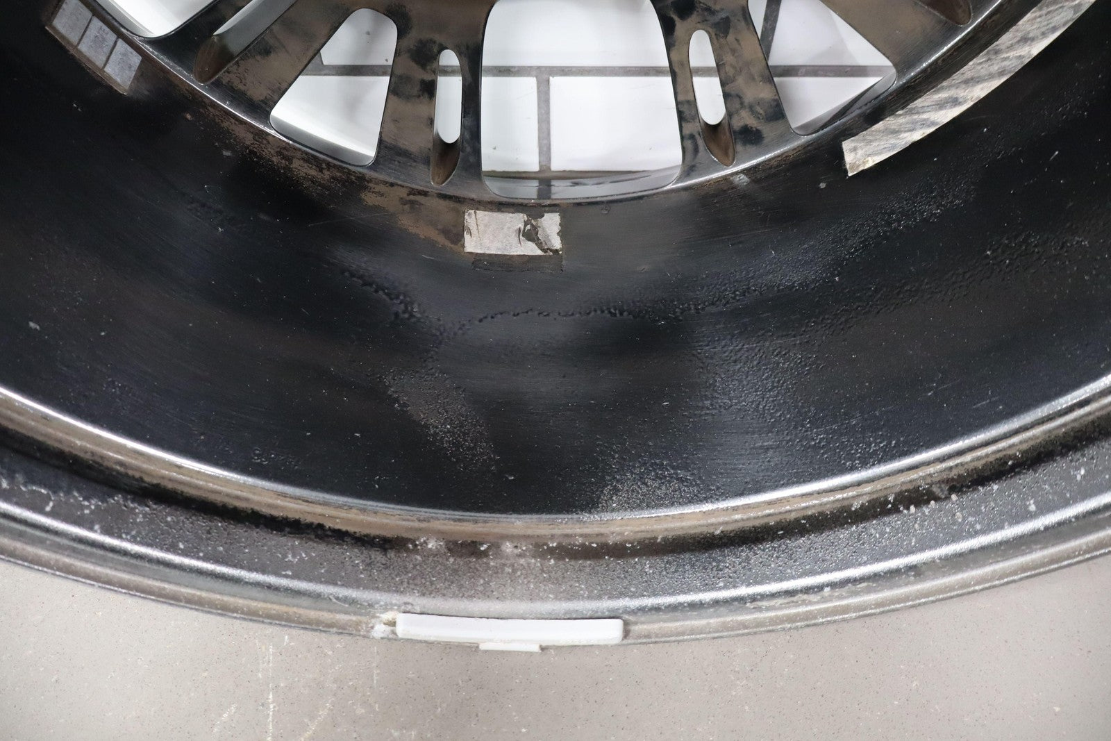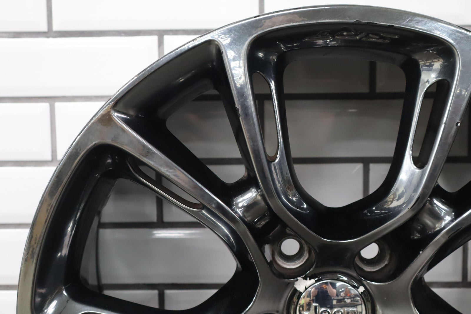 Trasera izquierda, llanta de 20 x 10, cromada en negro, 10 radios abiertos (wf9), algunos desprendimientos en los bordes, centrifugado.