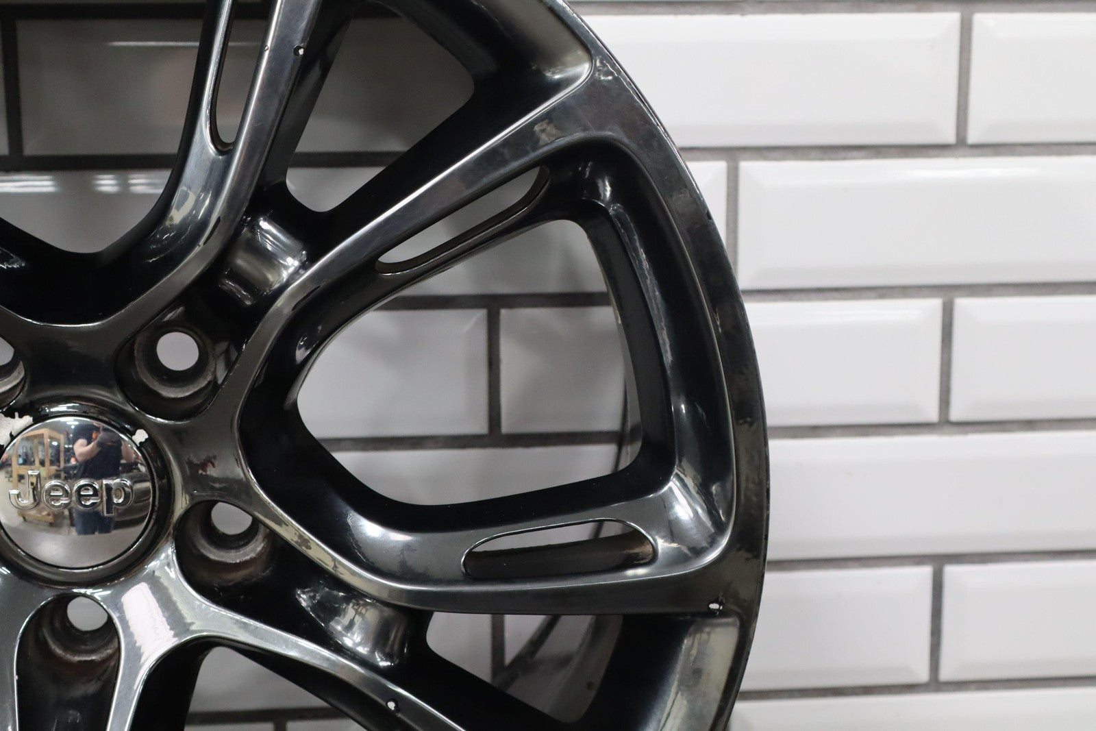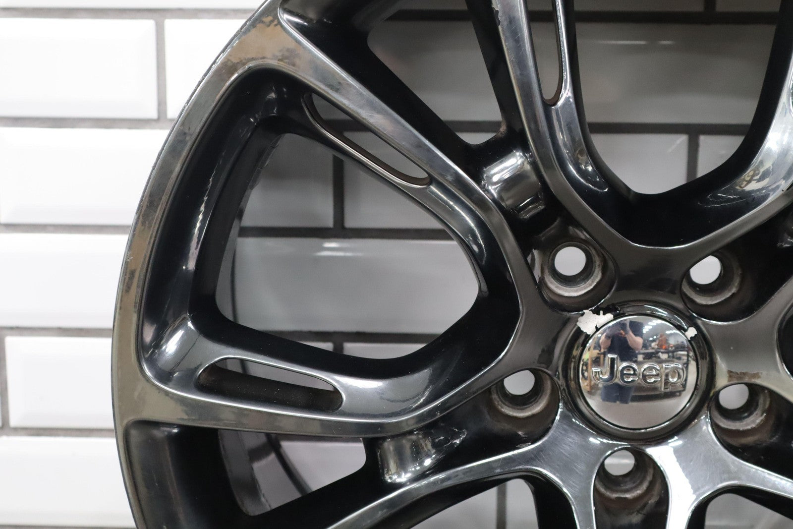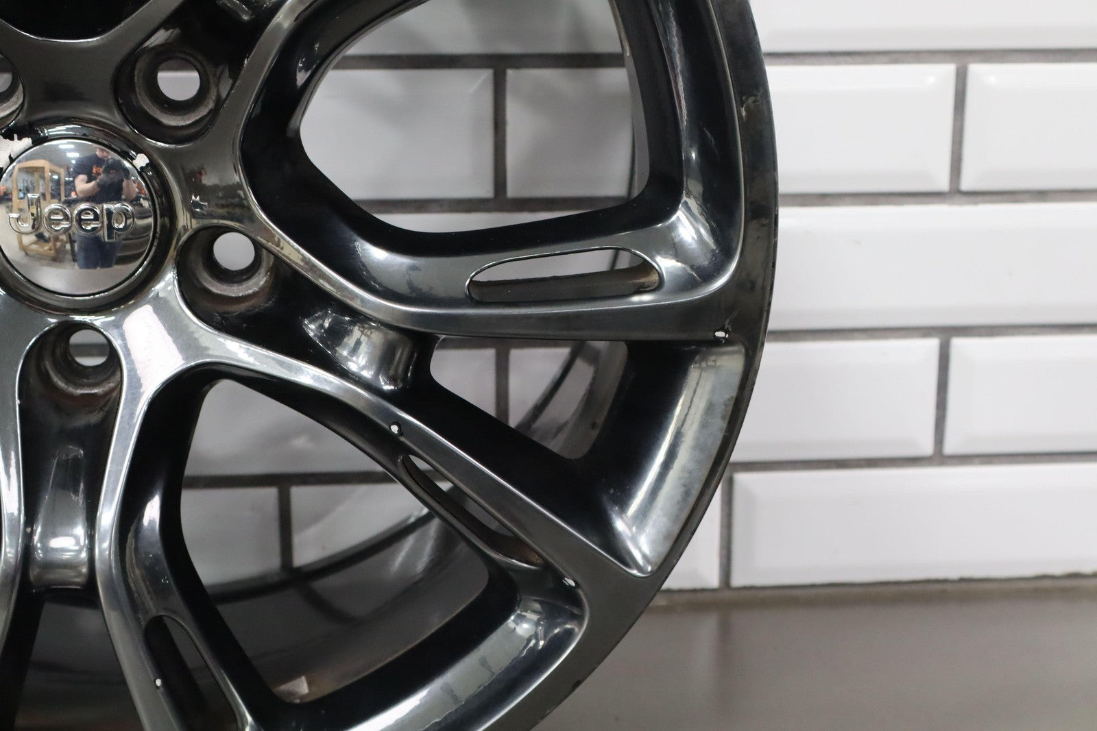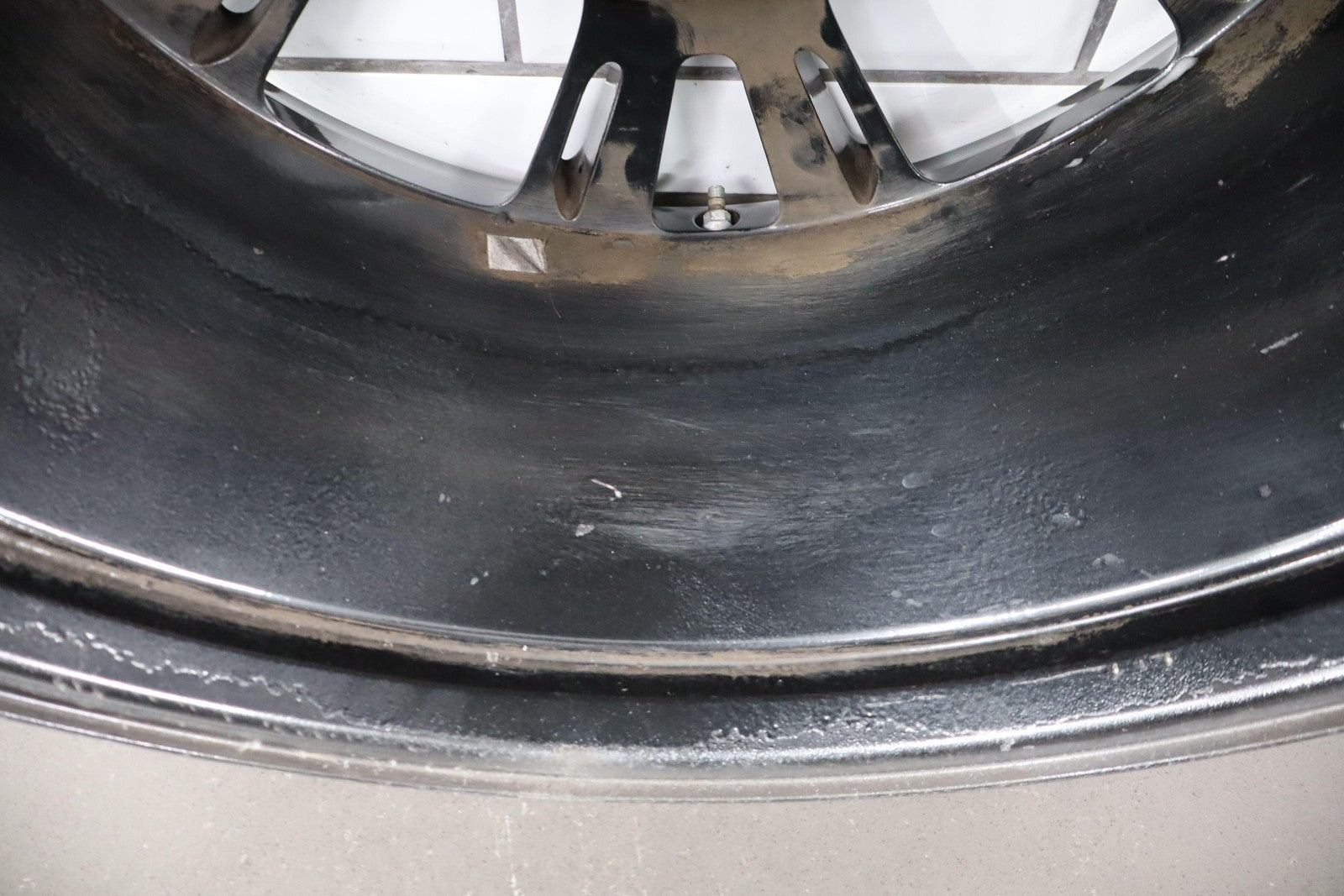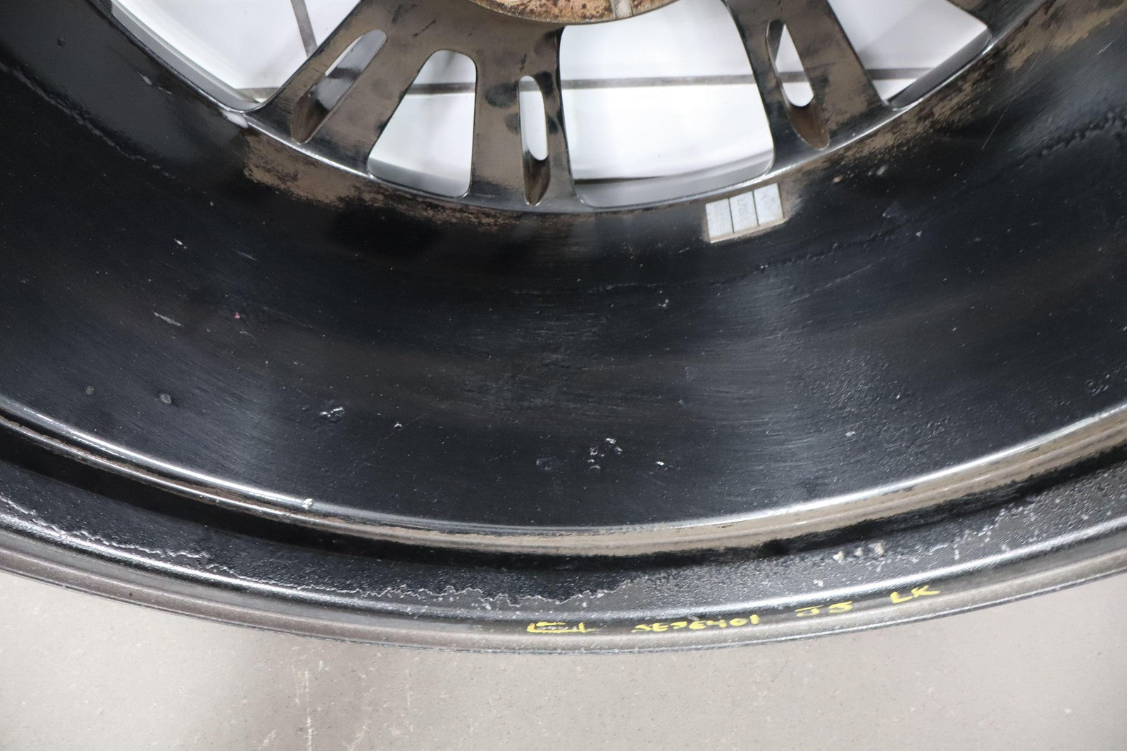 Trasera izquierda, llanta de 20 x 10, cromada en negro, 10 radios abiertos (wf9), algunos desprendimientos en los bordes, centrifugado.