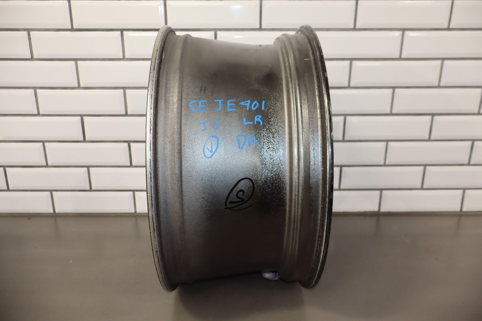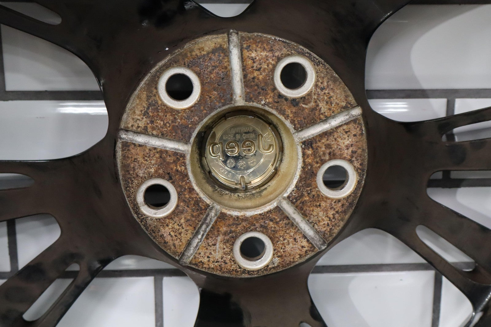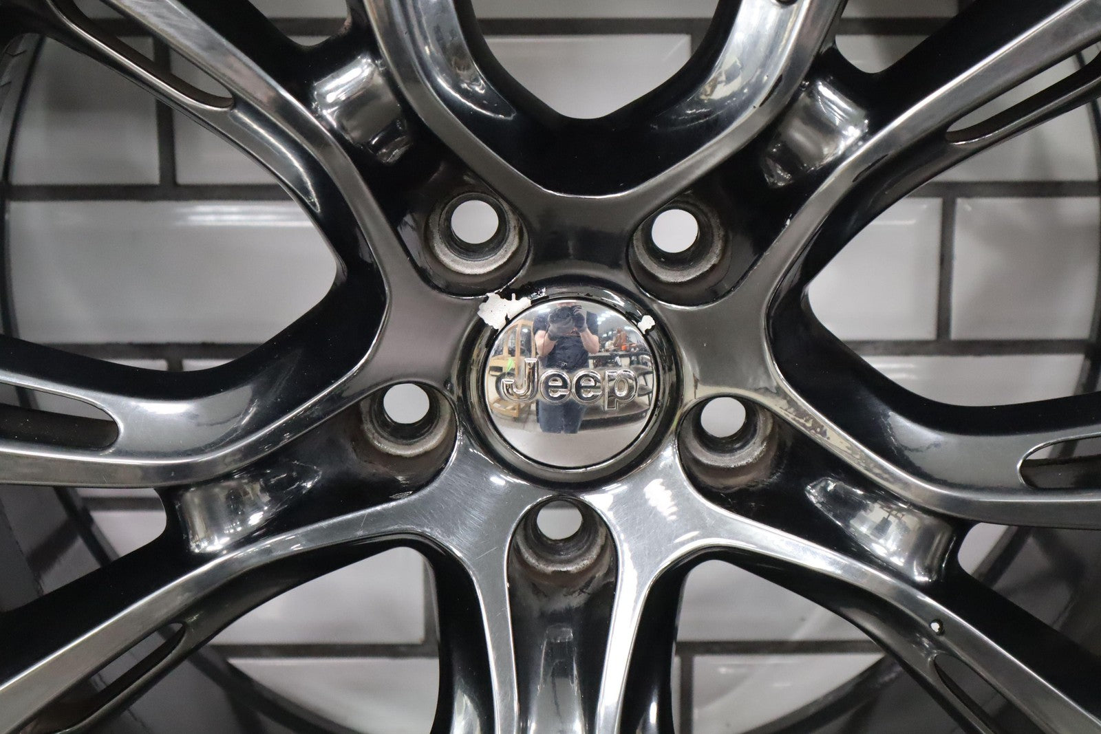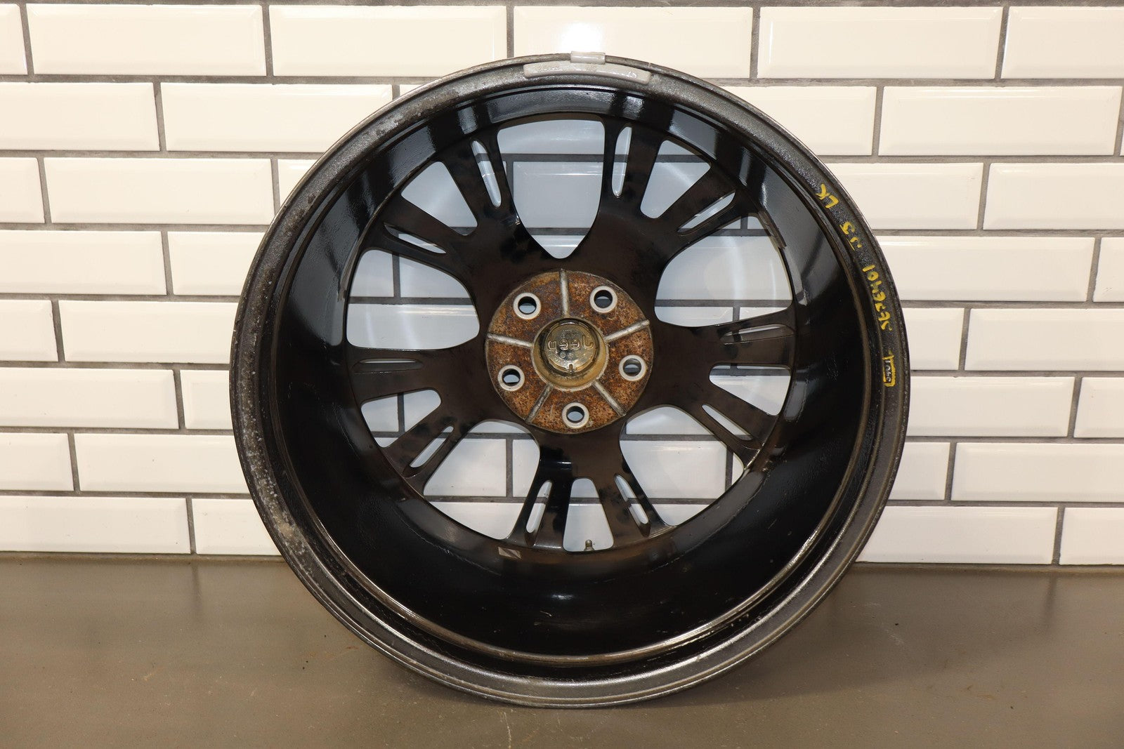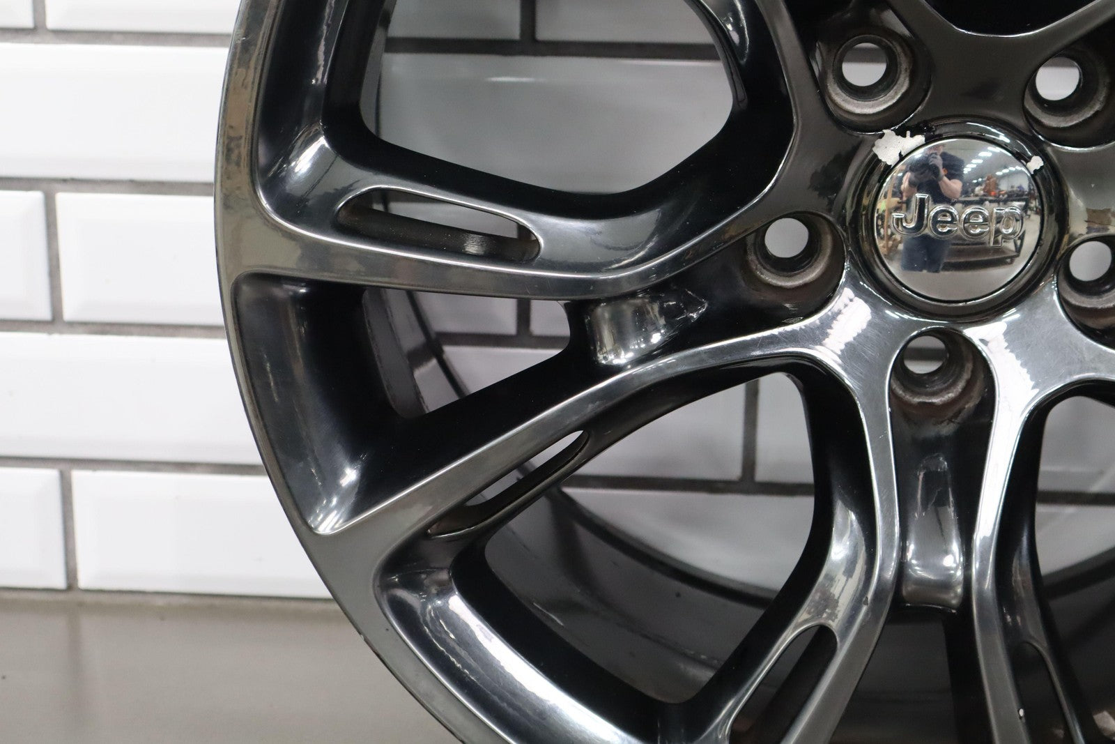 Trasera izquierda, llanta de 20 x 10, cromada en negro, 10 radios abiertos (wf9), algunos desprendimientos en los bordes, centrifugado.