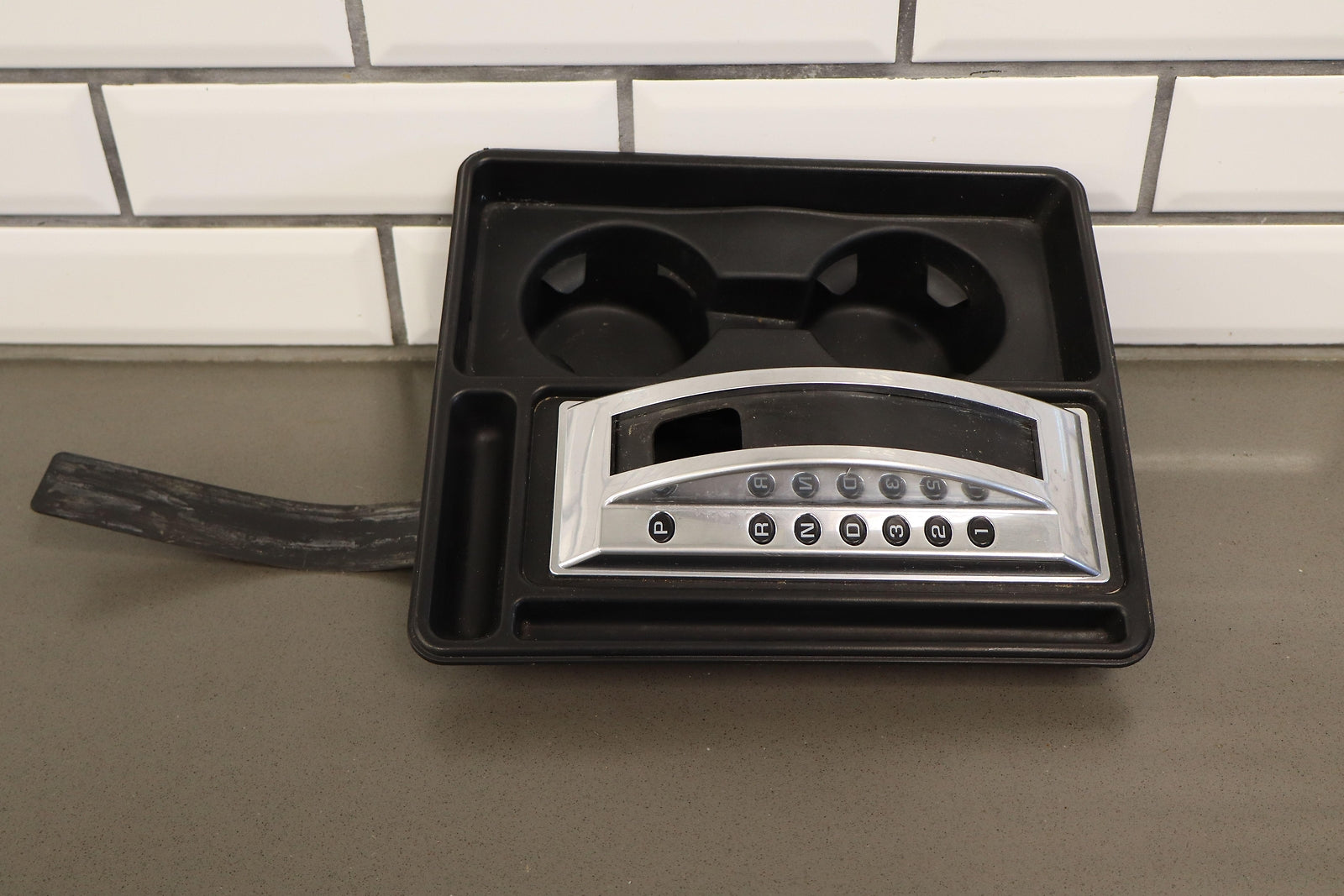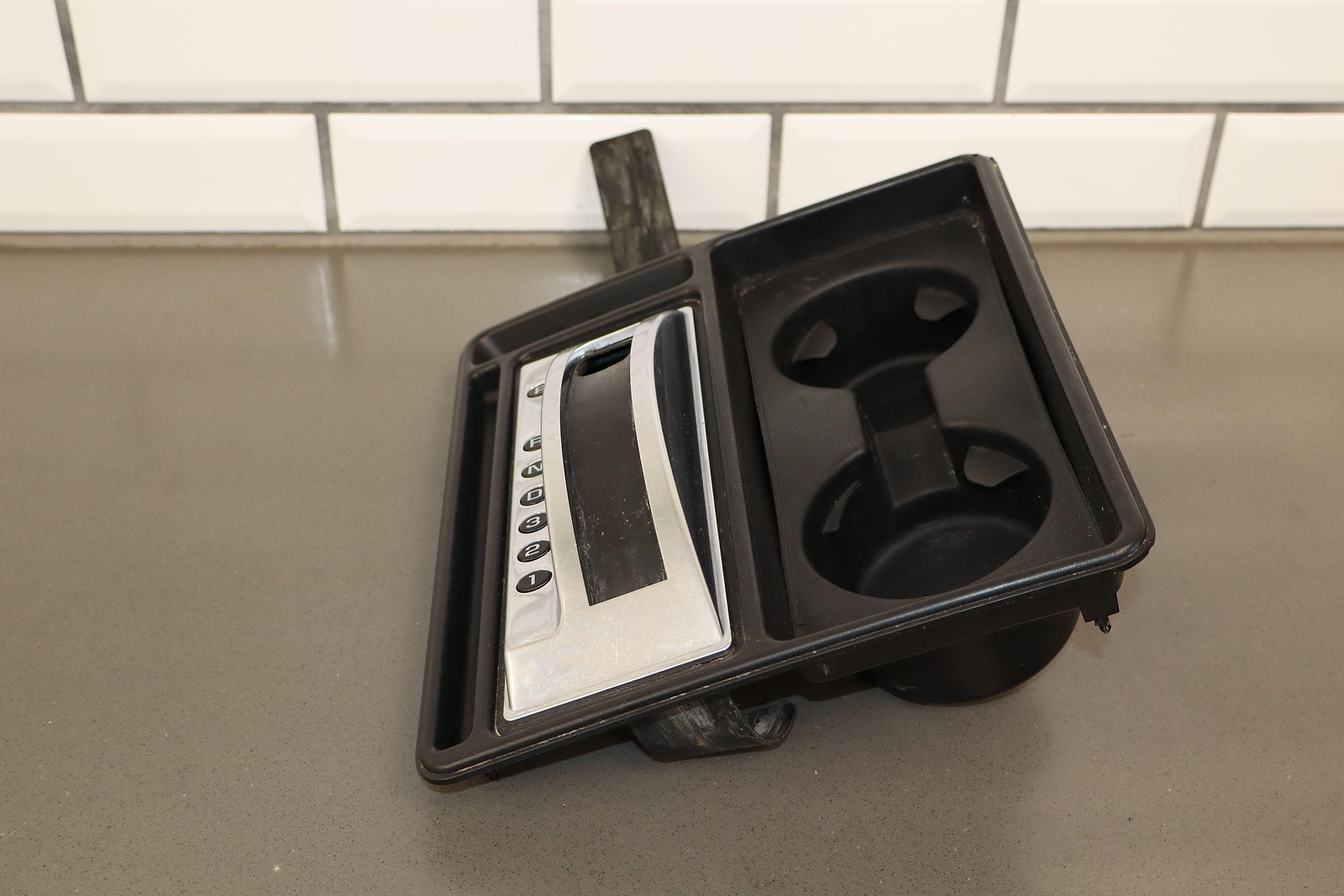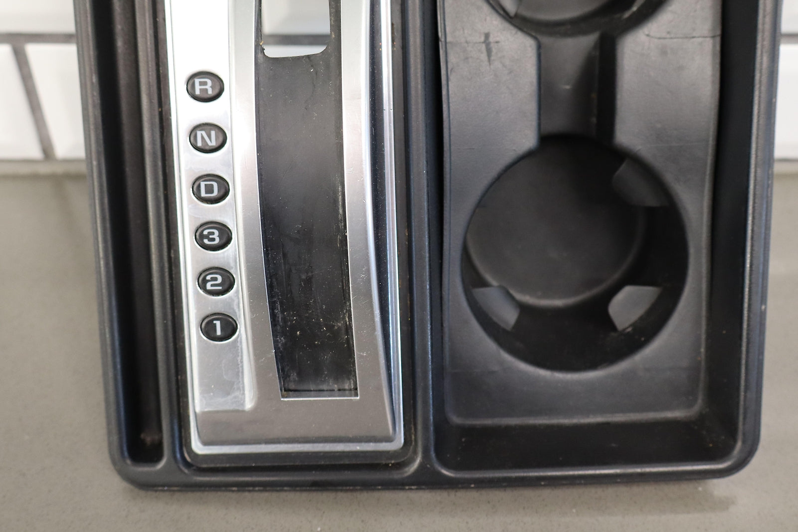 Important notes: Floor Shifter/cupholder Bezel, Black, Clean Lettering, Mild Weathering To Chrome
